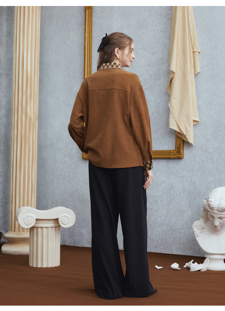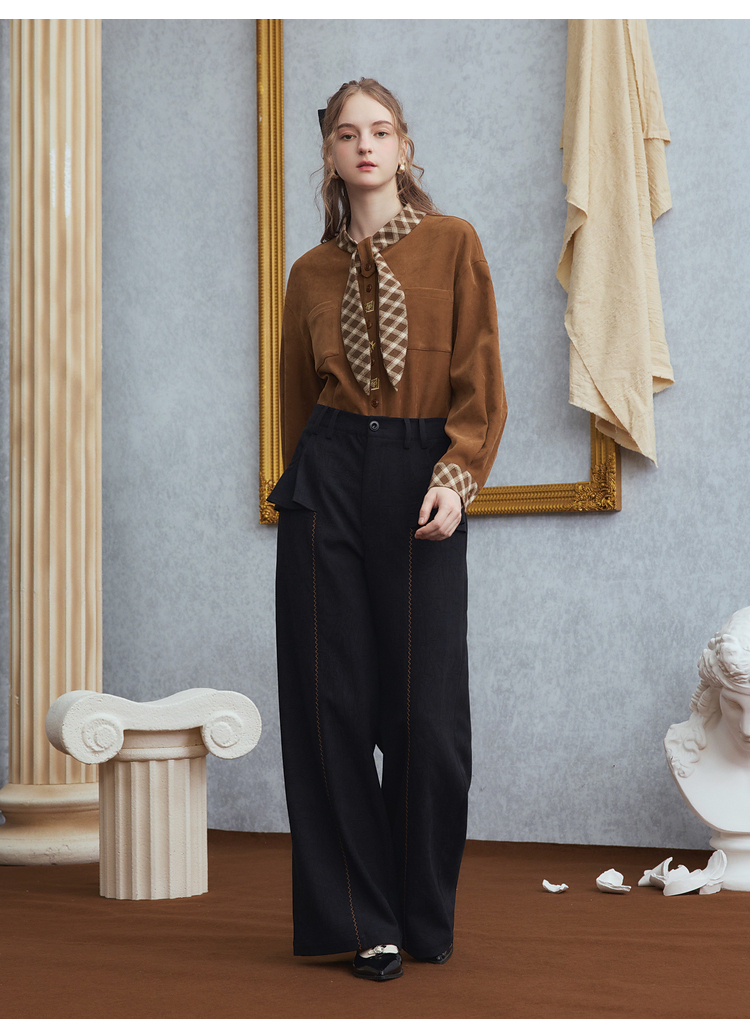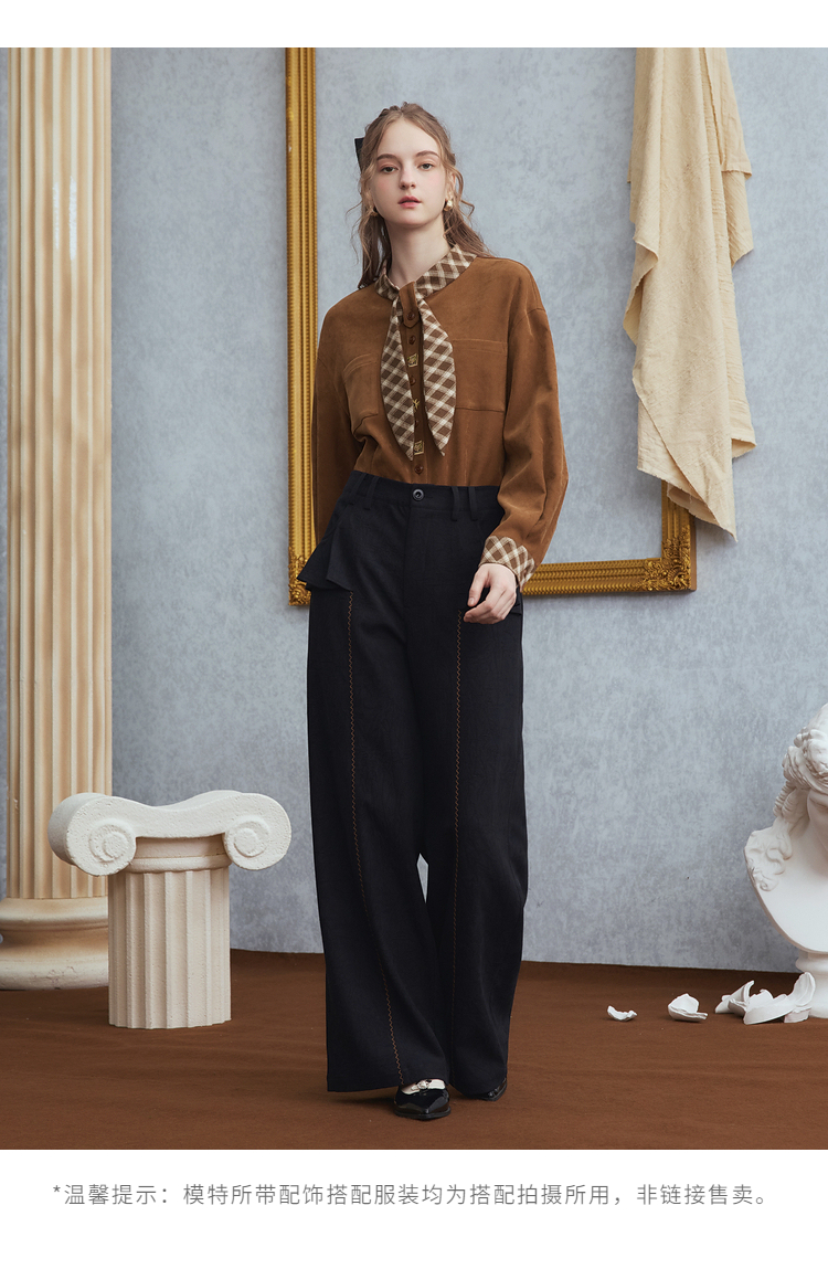 两三事 晚风正好 2024秋季新款时尚格子拼布高腰阔腿裤休闲裤女