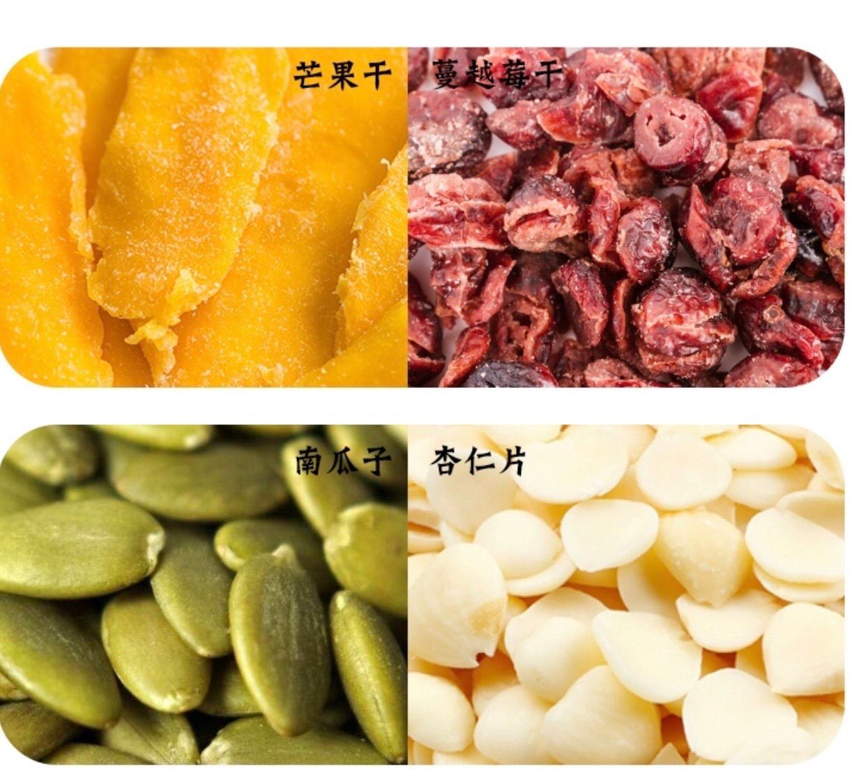 一袋五种口味超丰富超多小料:巴旦木、腰果、蔓越莓干、芒果干等,关键是还有会拉丝的牛轧,口感绝了