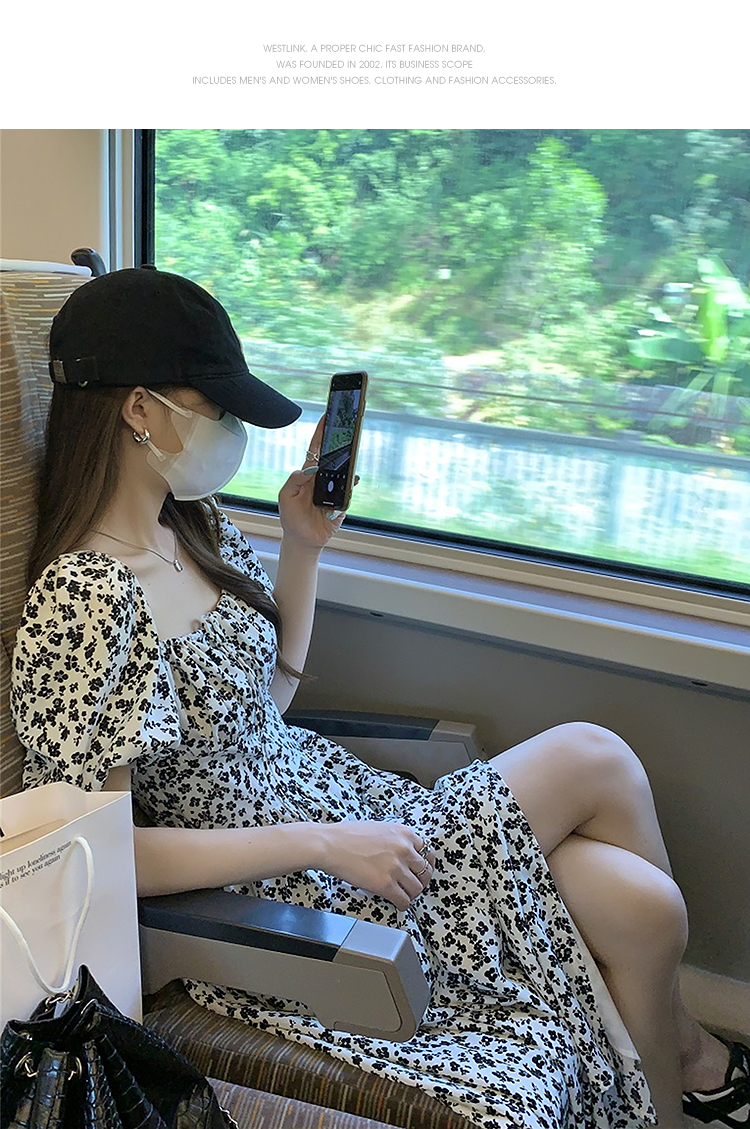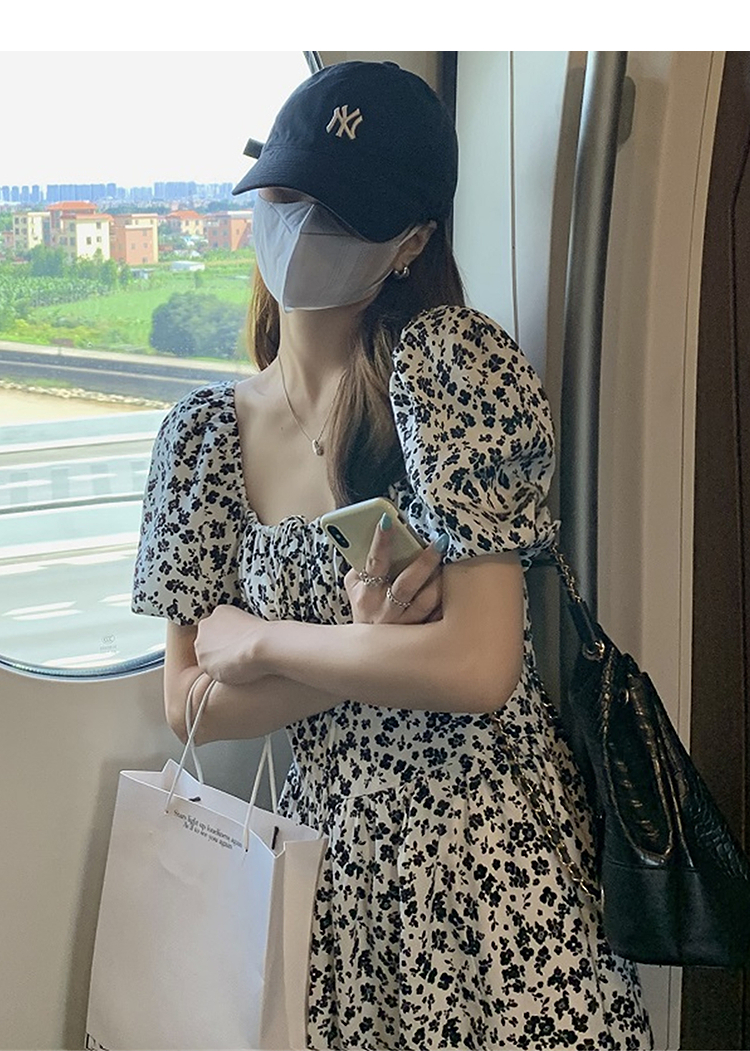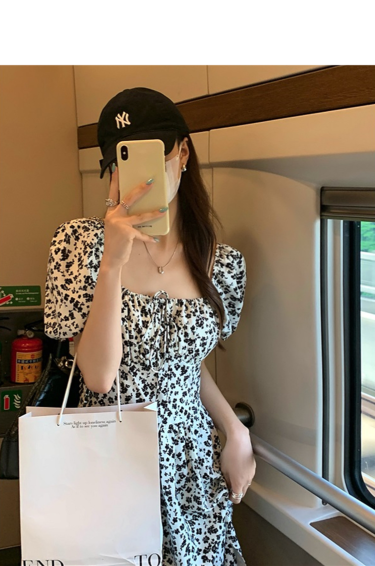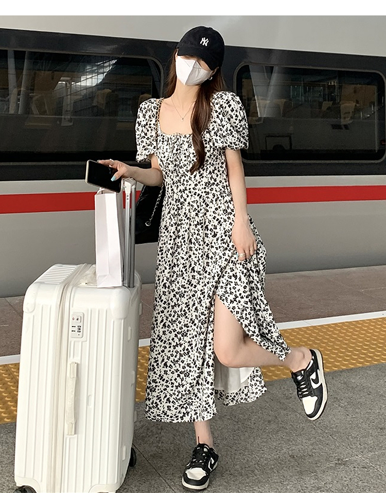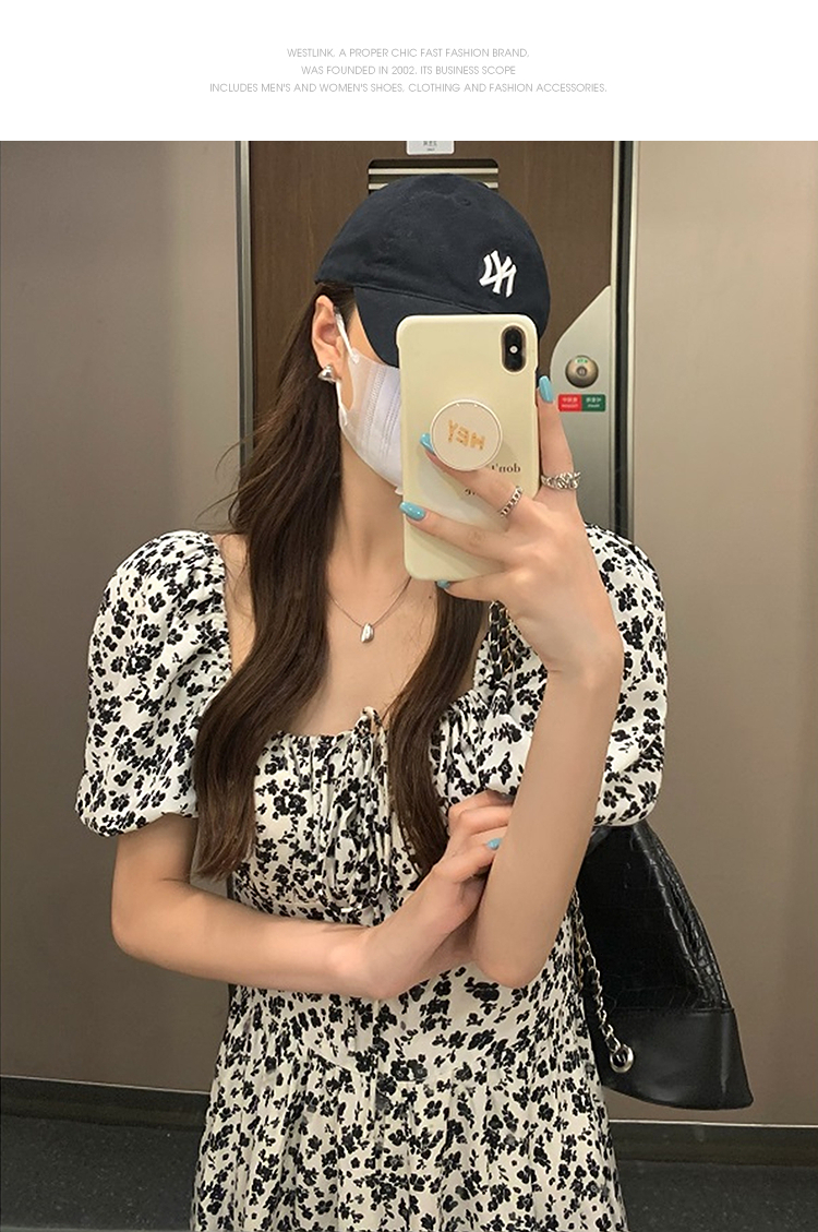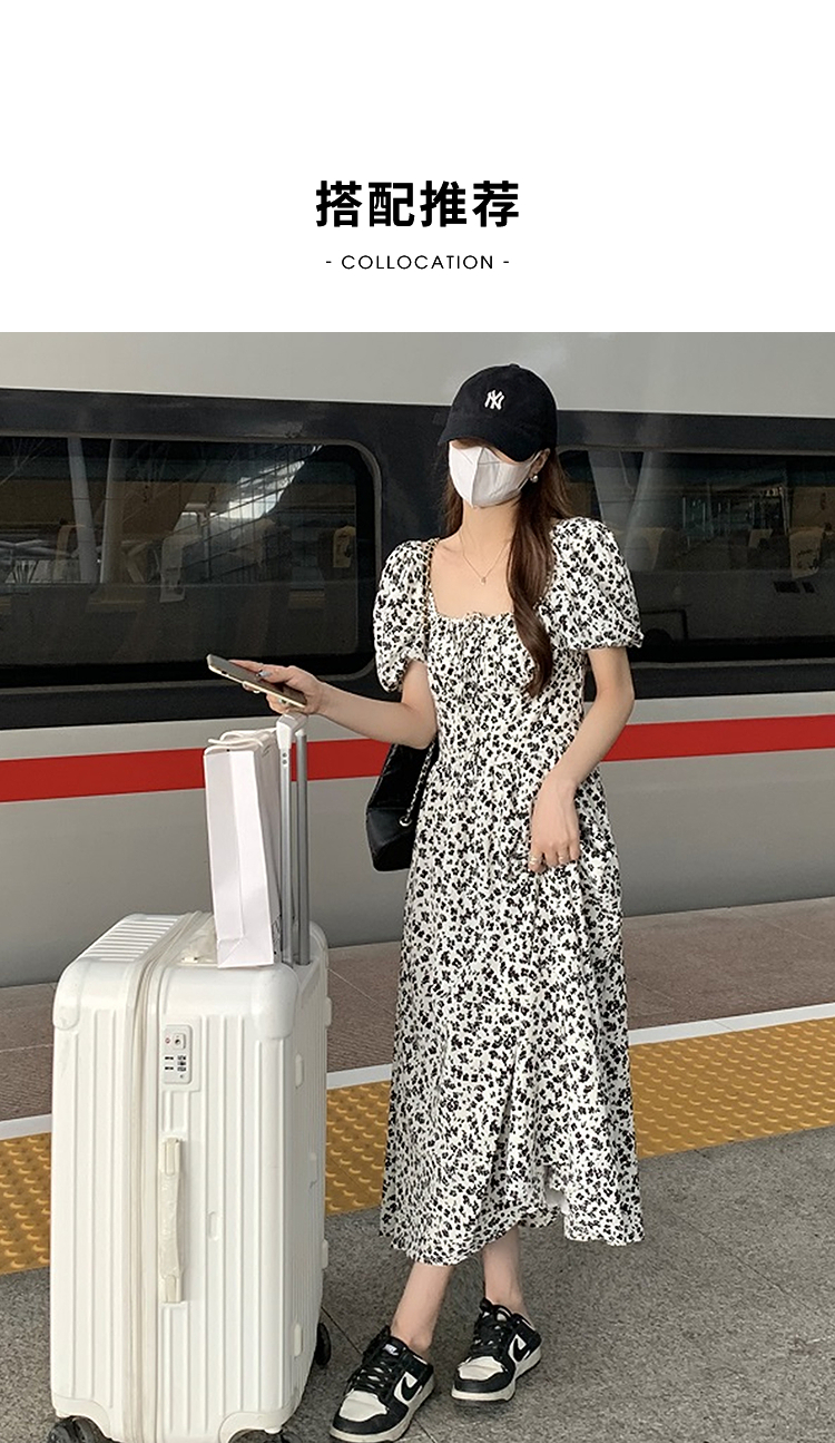 西遇碎花泡泡袖连衣裙女2025年夏季新款开叉收腰系带法式方领裙子SS050718