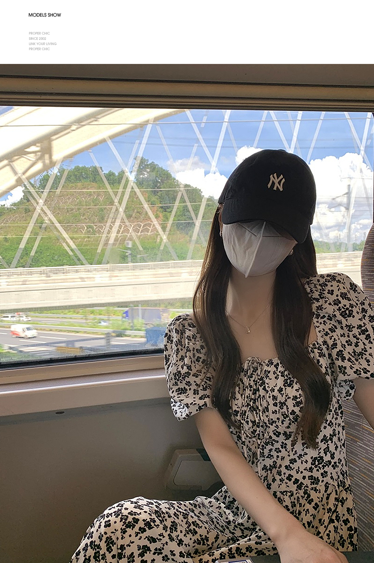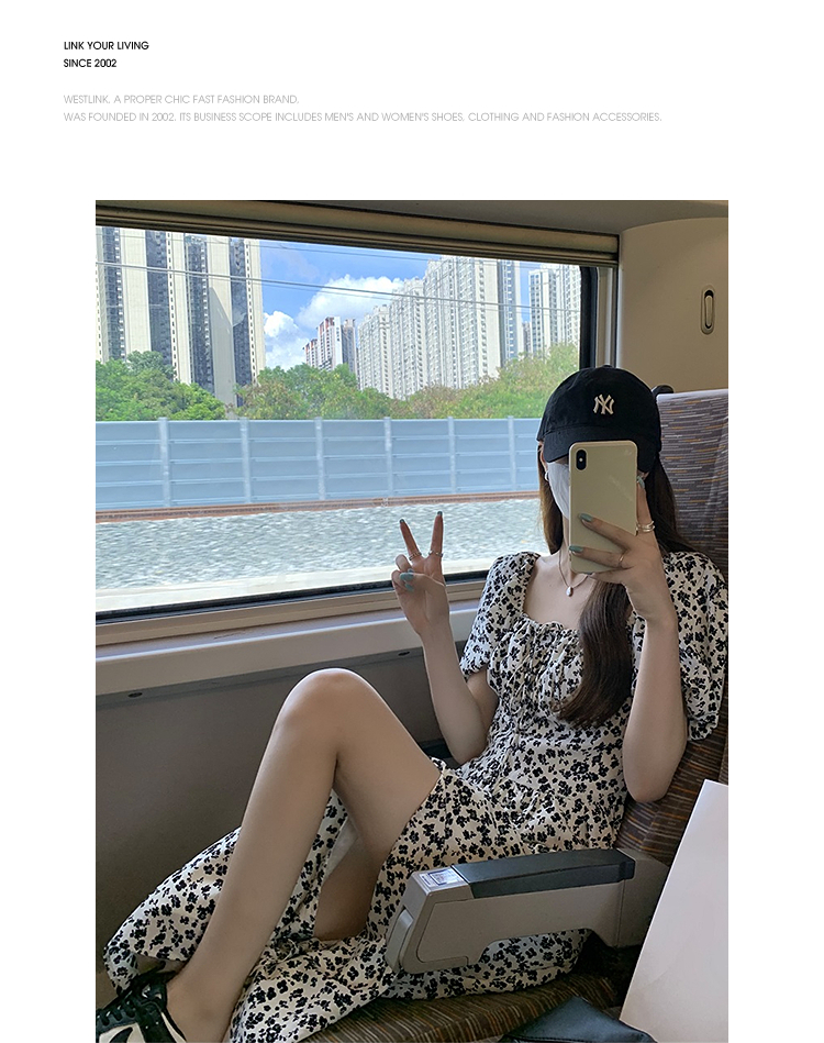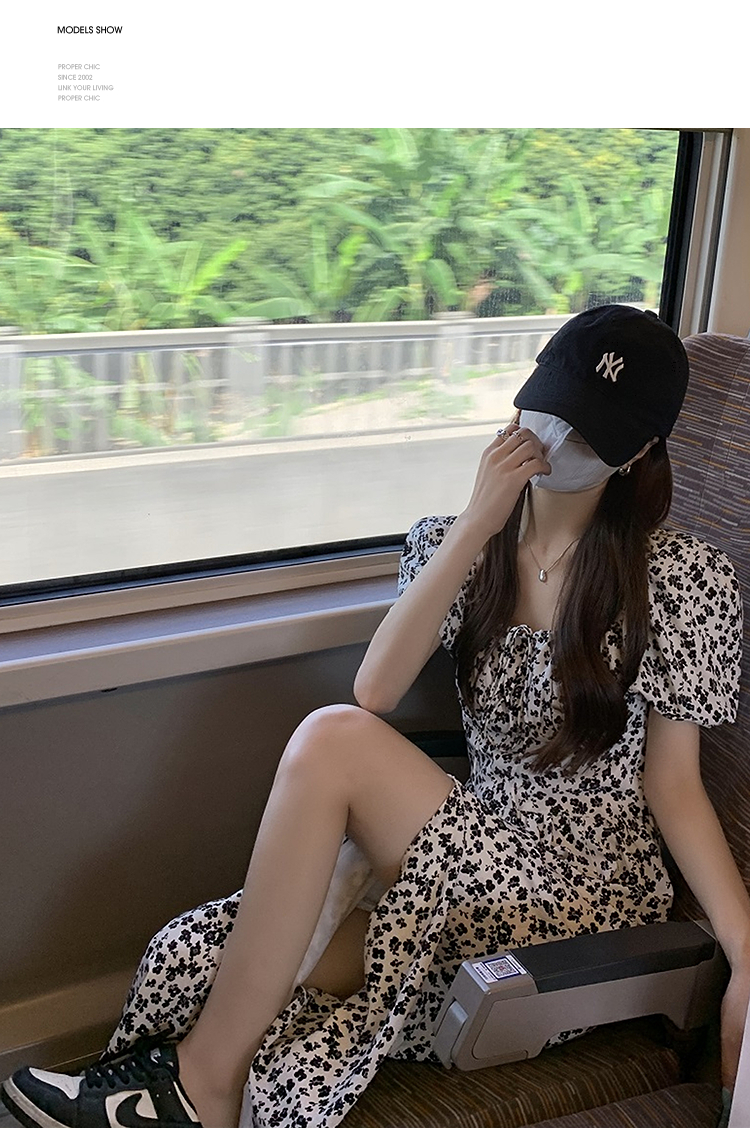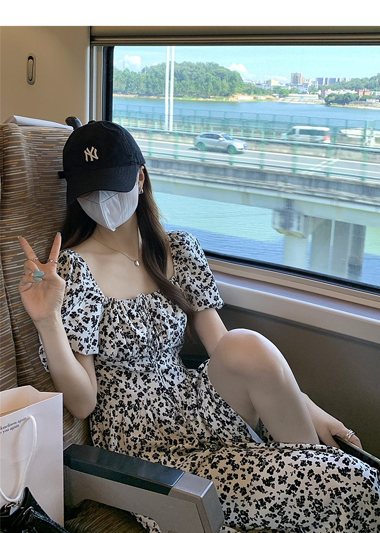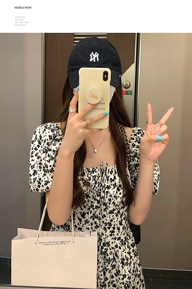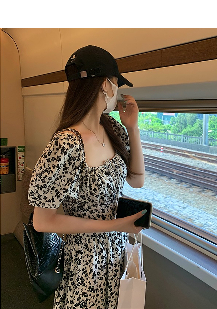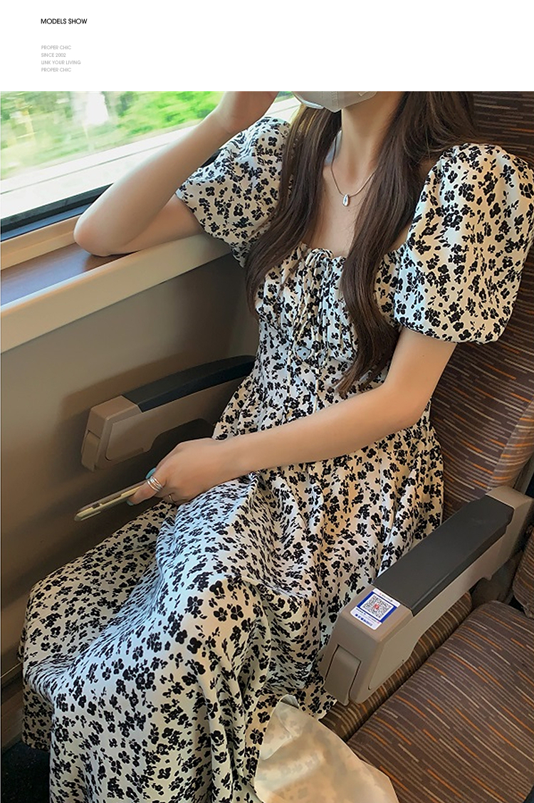 西遇碎花泡泡袖连衣裙女2025年夏季新款开叉收腰系带法式方领裙子SS050718