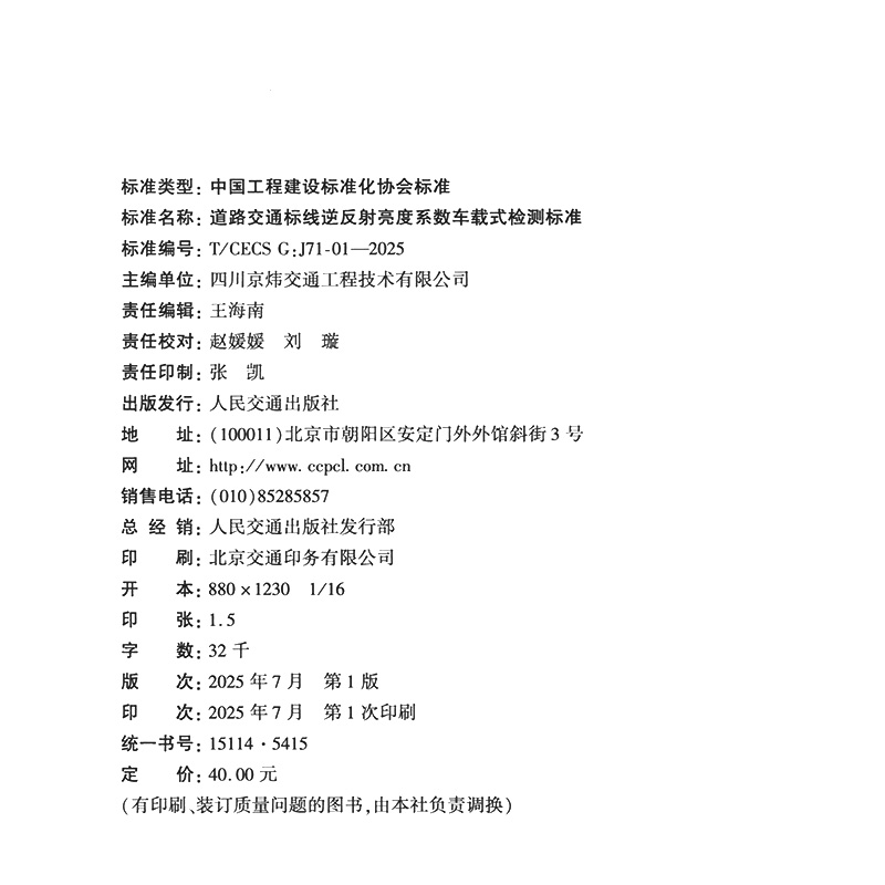 书名:道路交通标线逆反射亮度系数车载式检测标准(T/CECS G:J71-01—2025)
