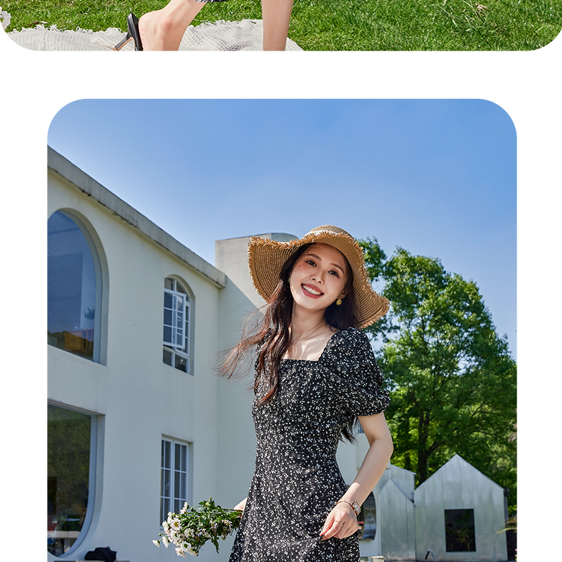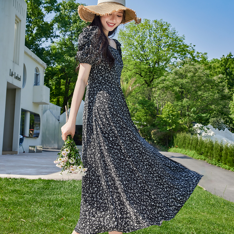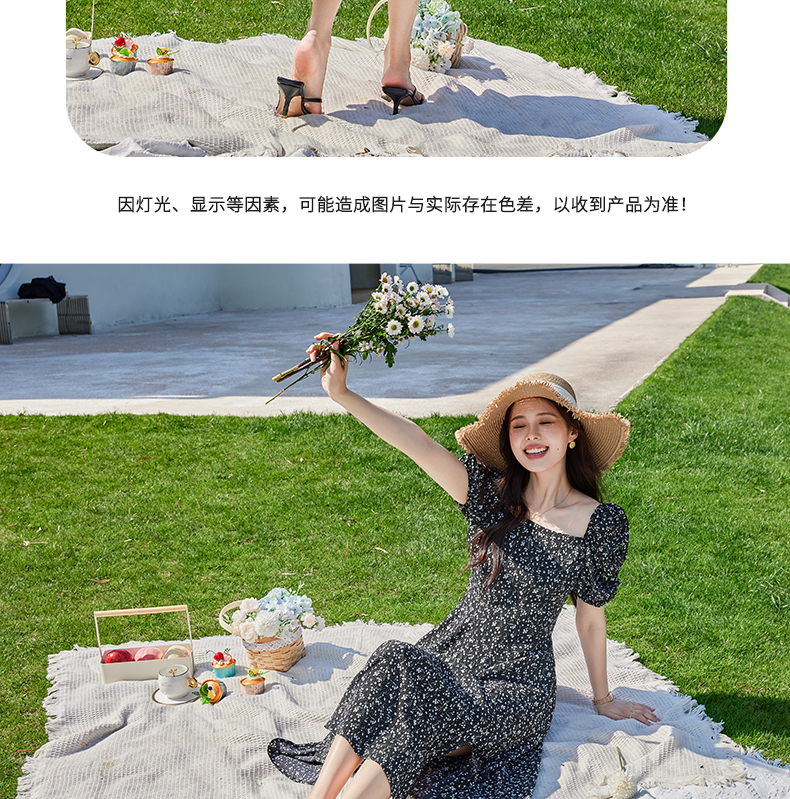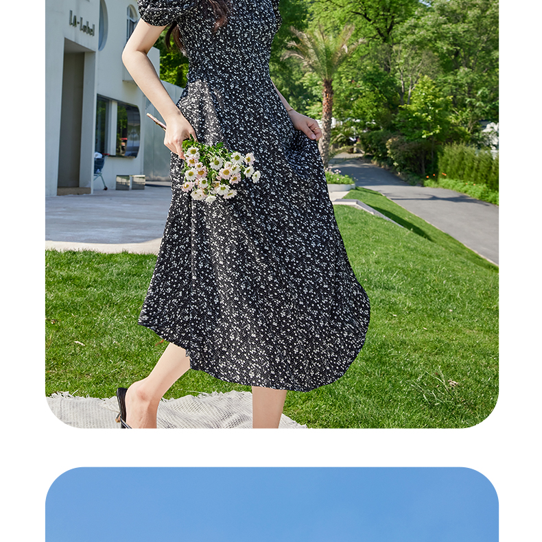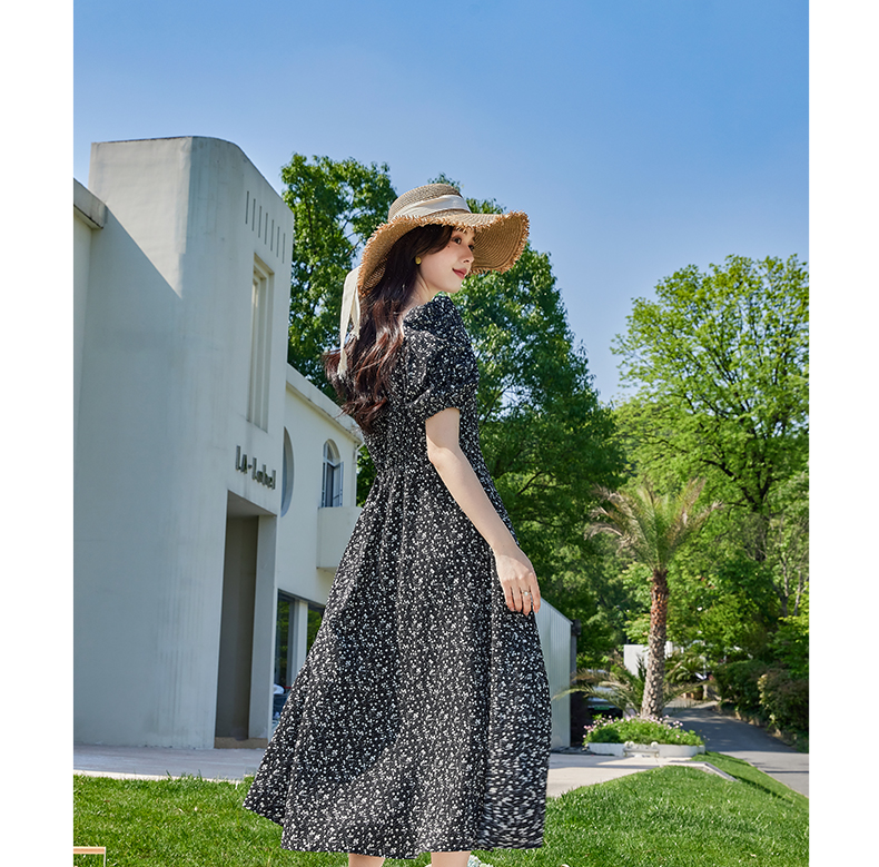 VICTORIA&VERA夏季新款法式方领收腰显瘦一字领黑色碎花连衣裙