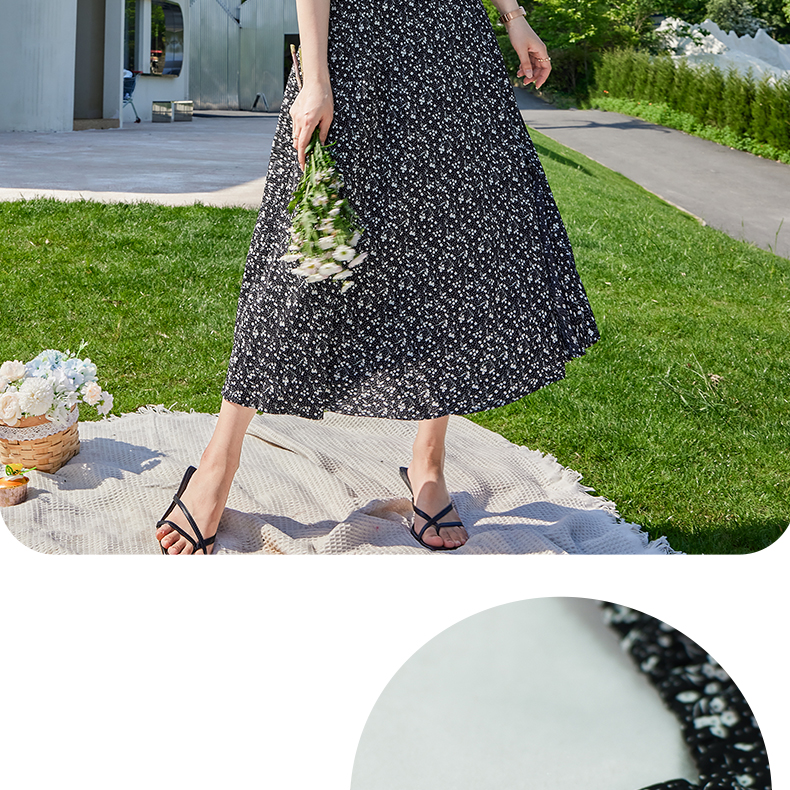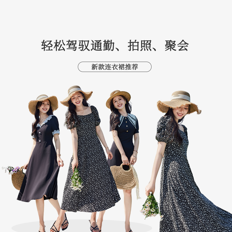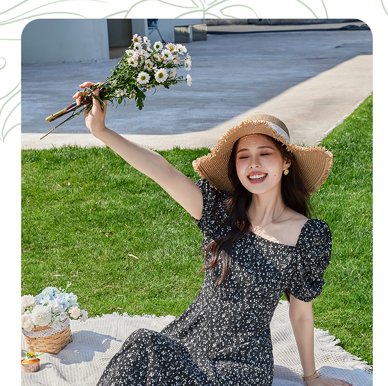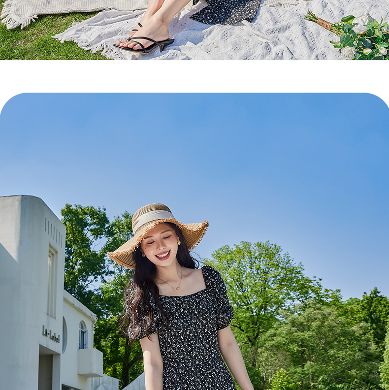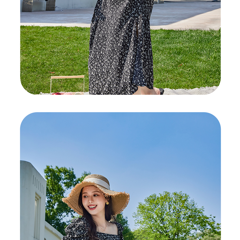 VICTORIA&VERA夏季新款法式方领收腰显瘦一字领黑色碎花连衣裙