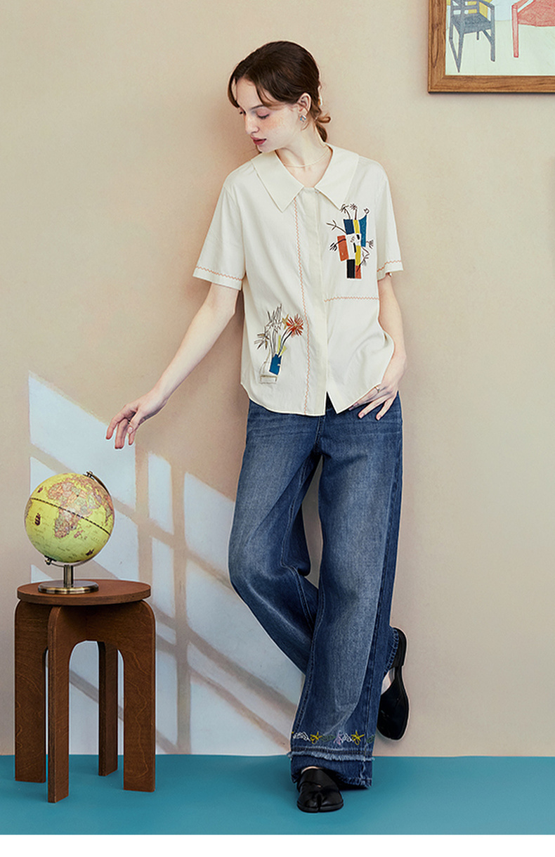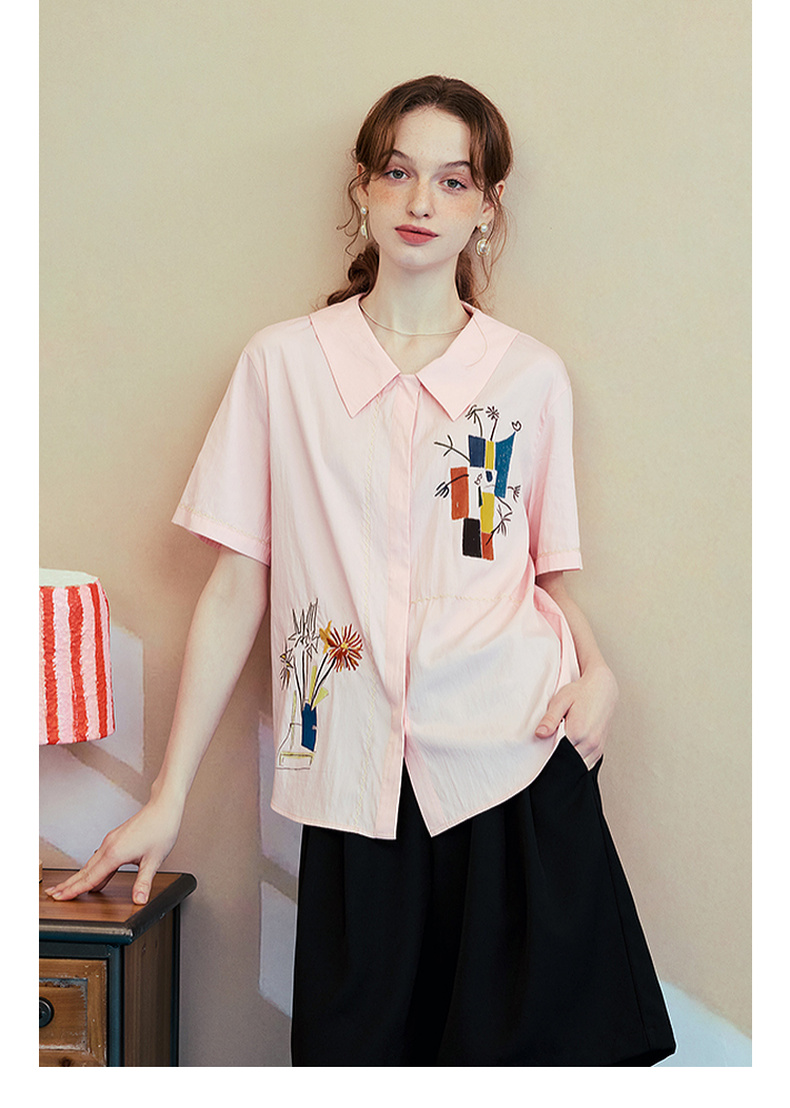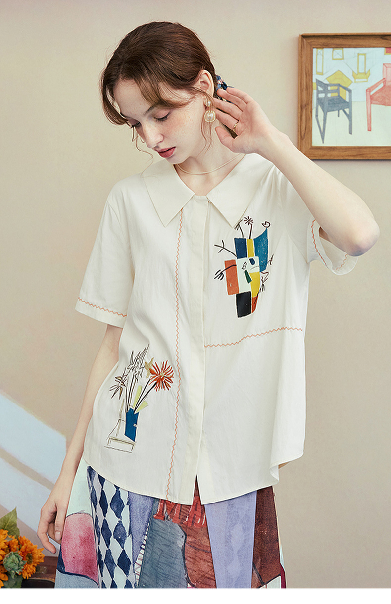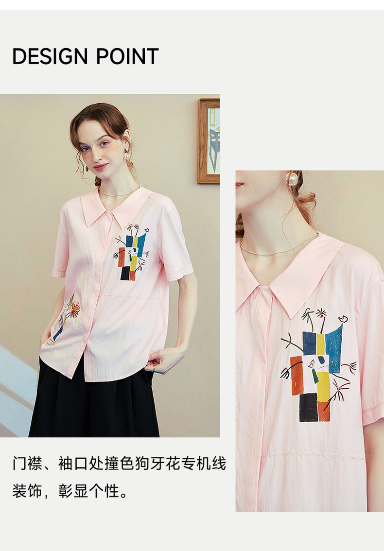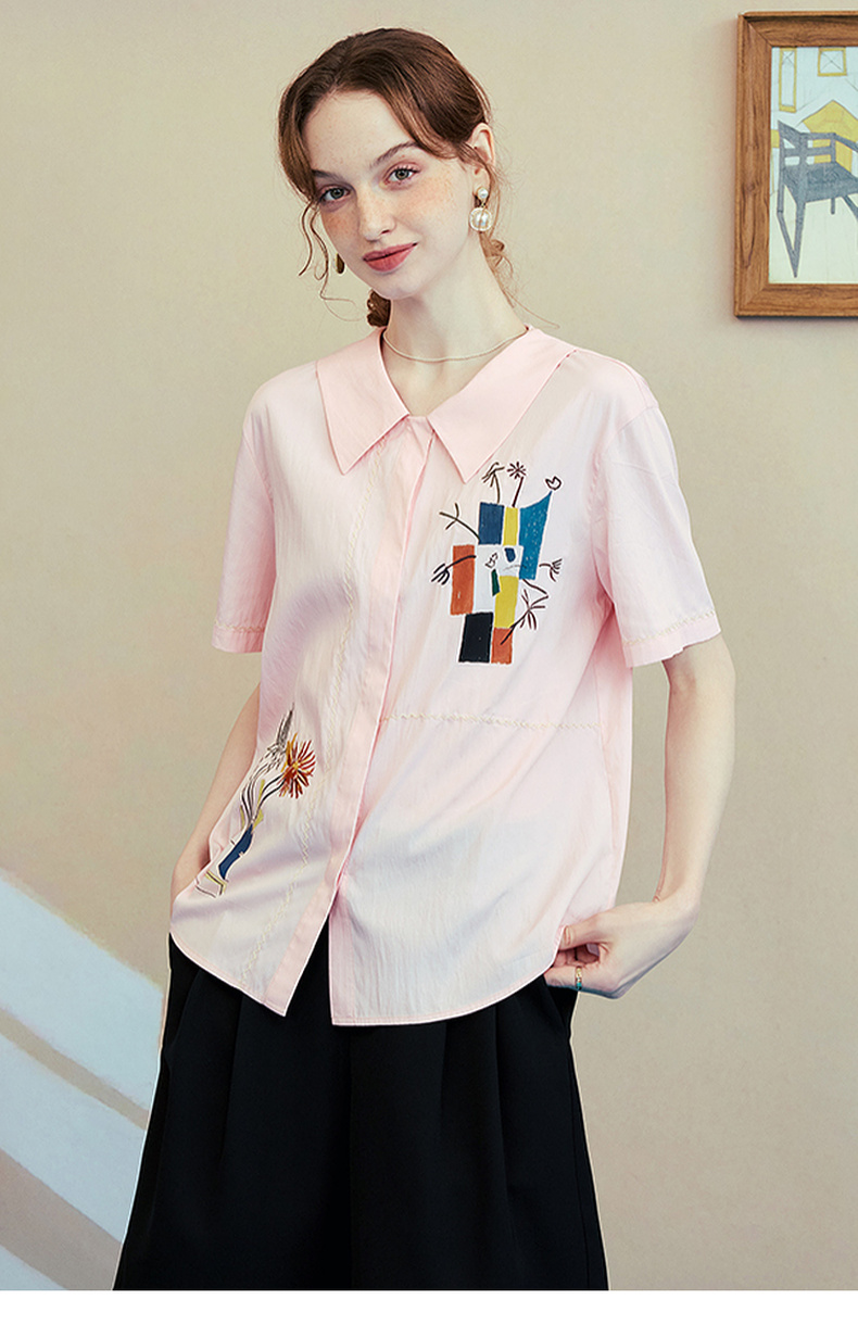 两三事 欧若灵光 2025夏季新款文艺风手绘涂鸦刺绣印花短袖衬衫女