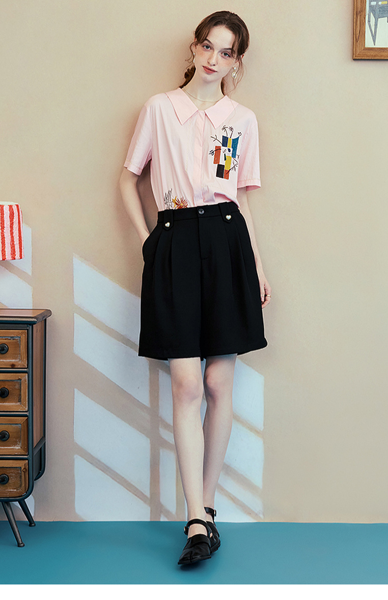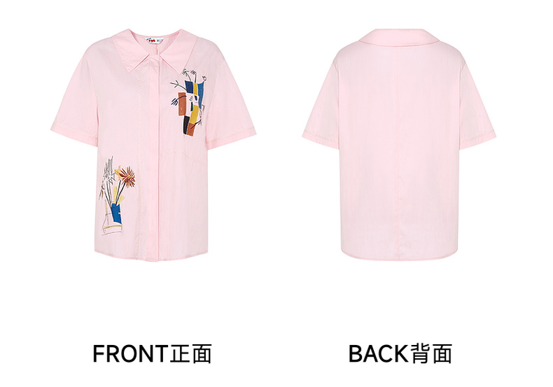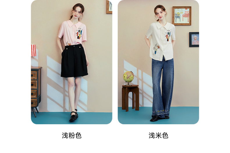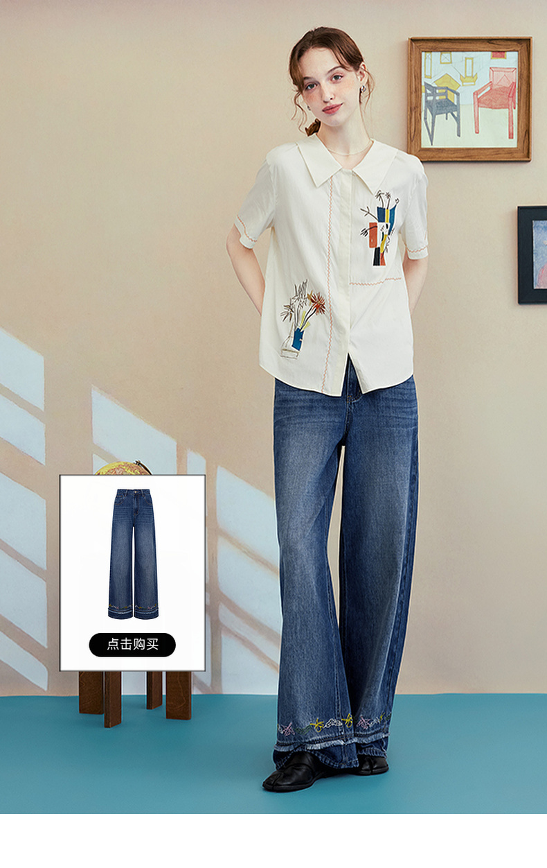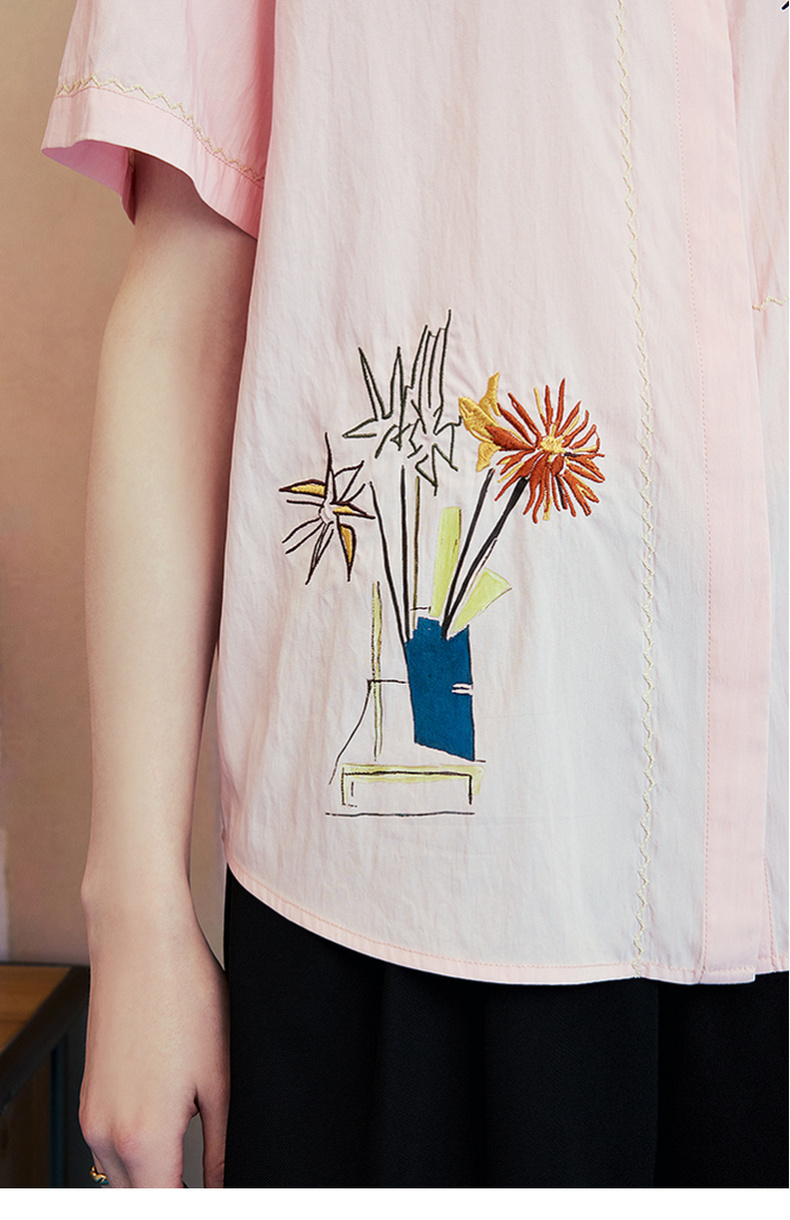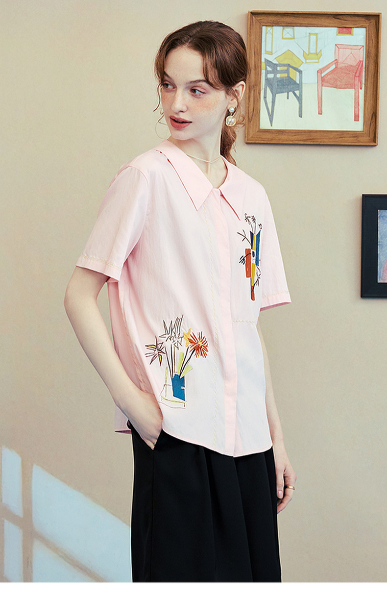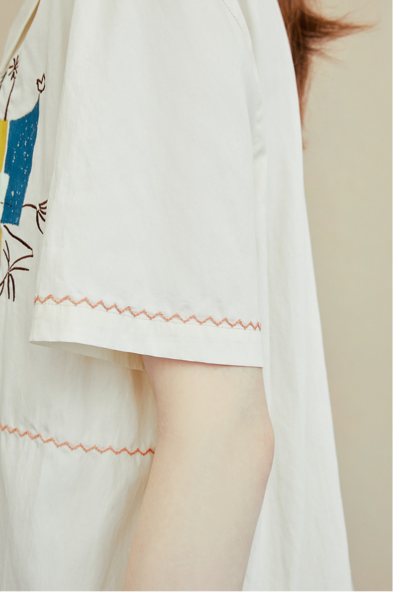 两三事 欧若灵光 2025夏季新款文艺风手绘涂鸦刺绣印花短袖衬衫女