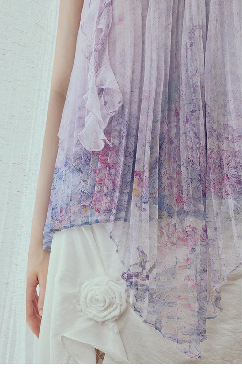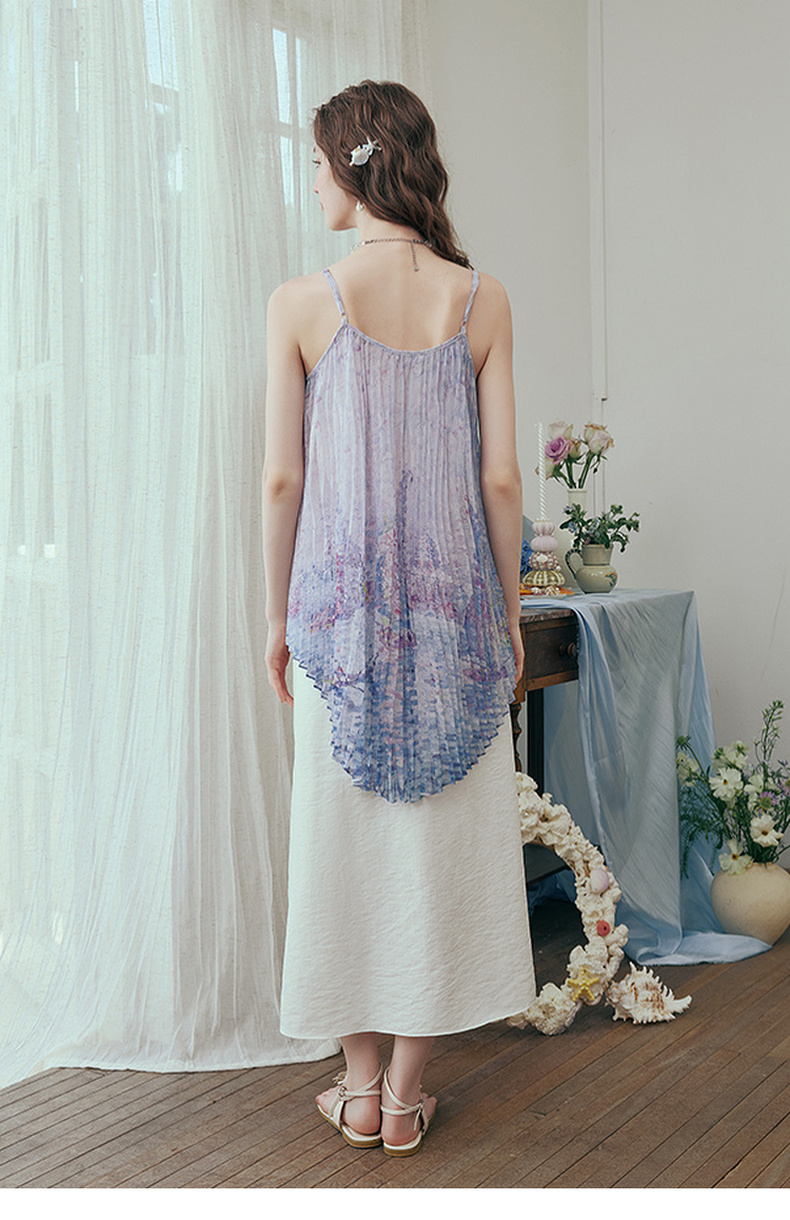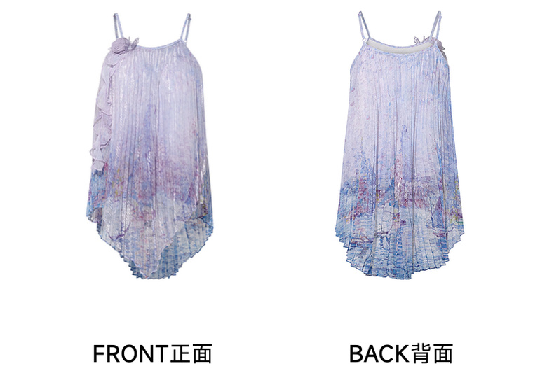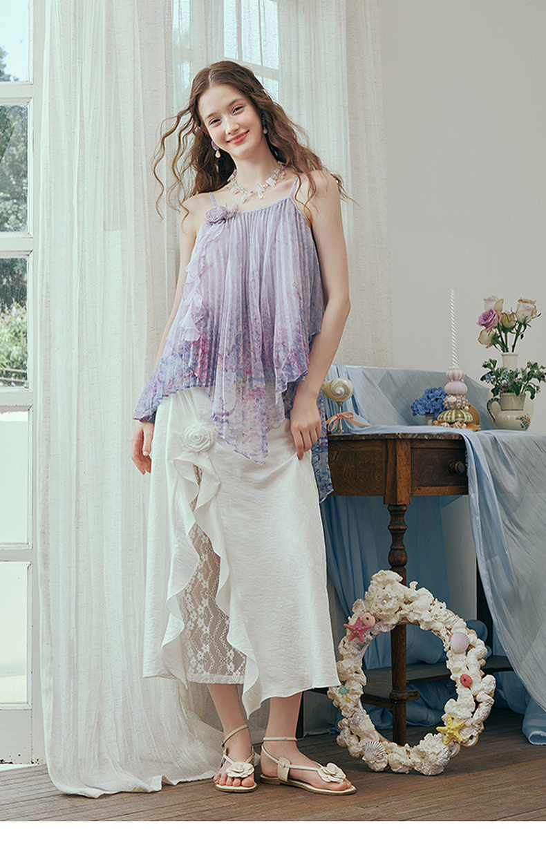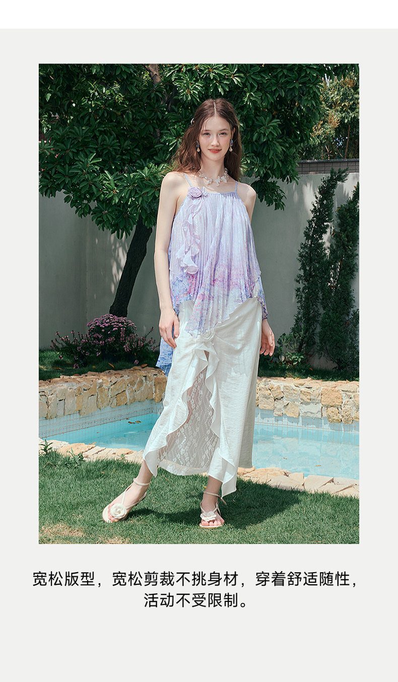 两三事繁花藏夏2025夏新款小清新立体花朵压褶不规则印花吊带衫女