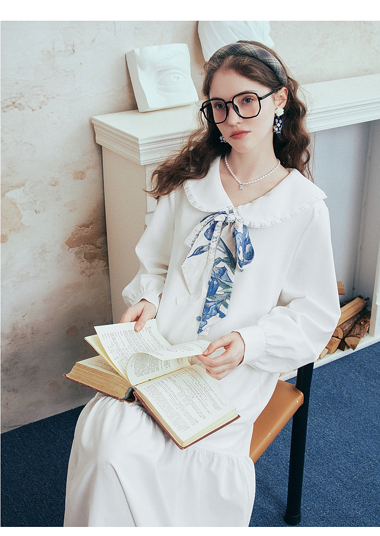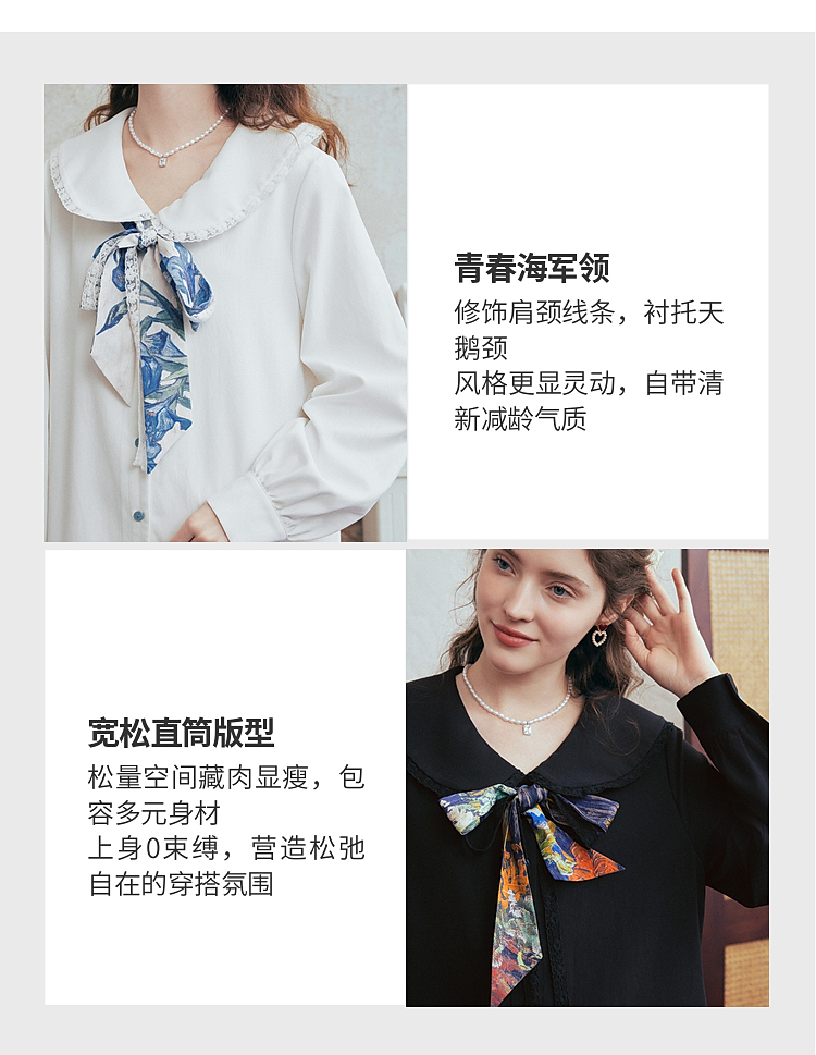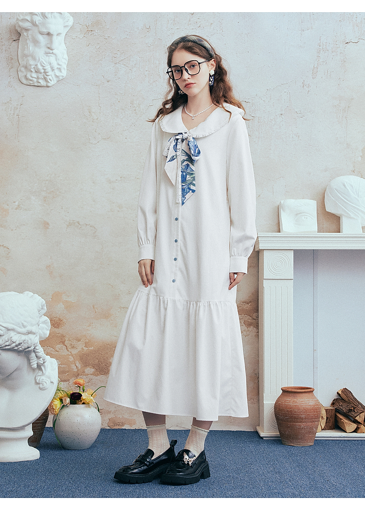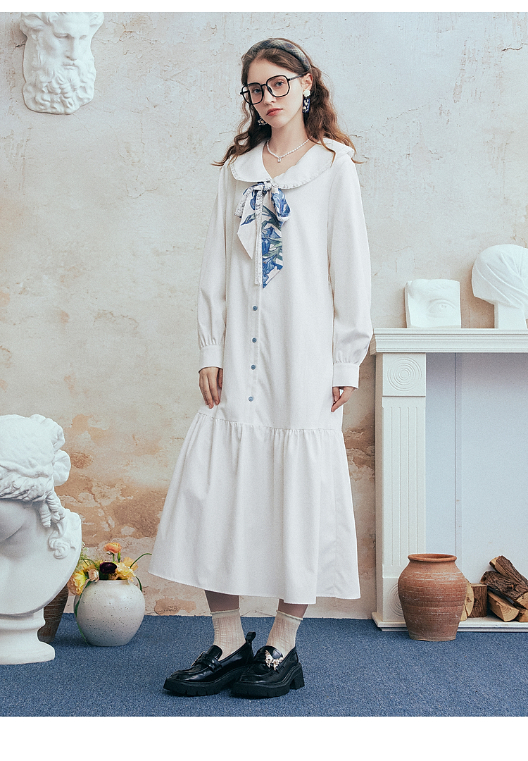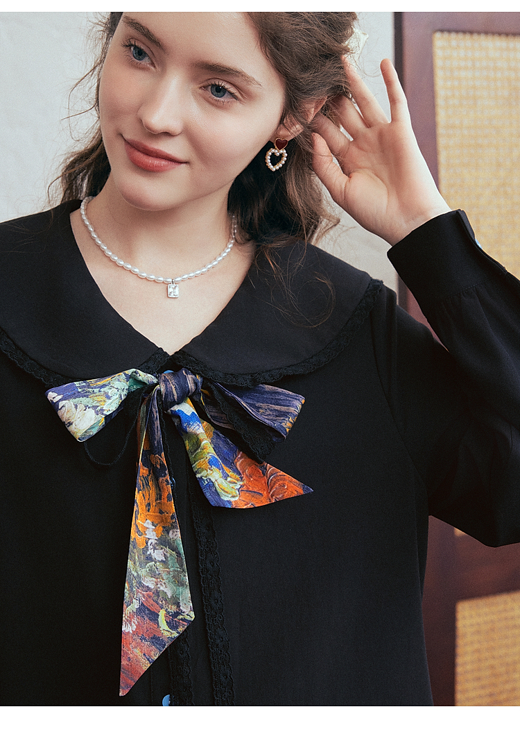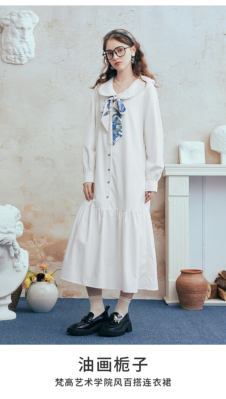 两三事 油画栀子 2026春季新款温柔风印花绑带单排扣衬衫裙连衣裙