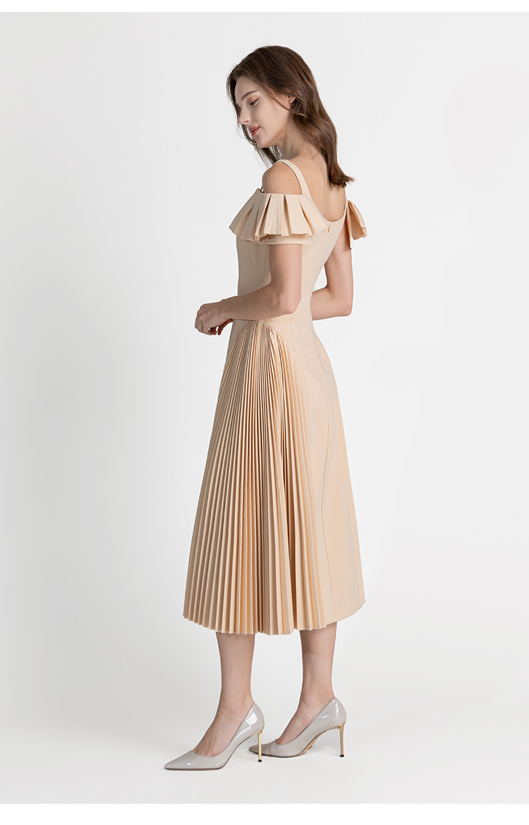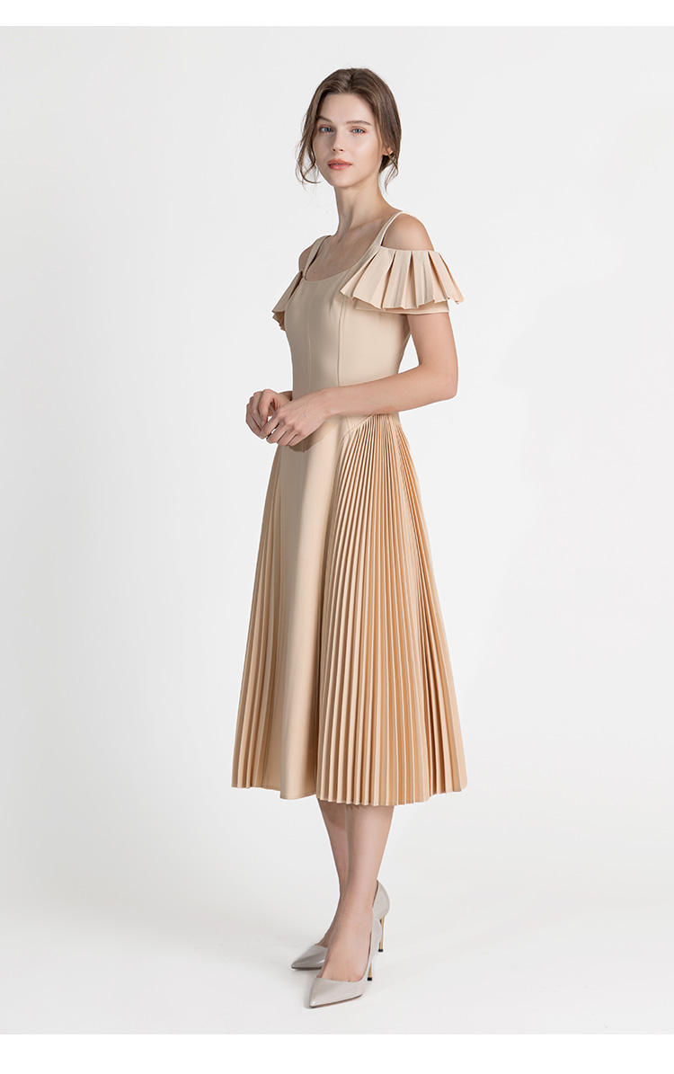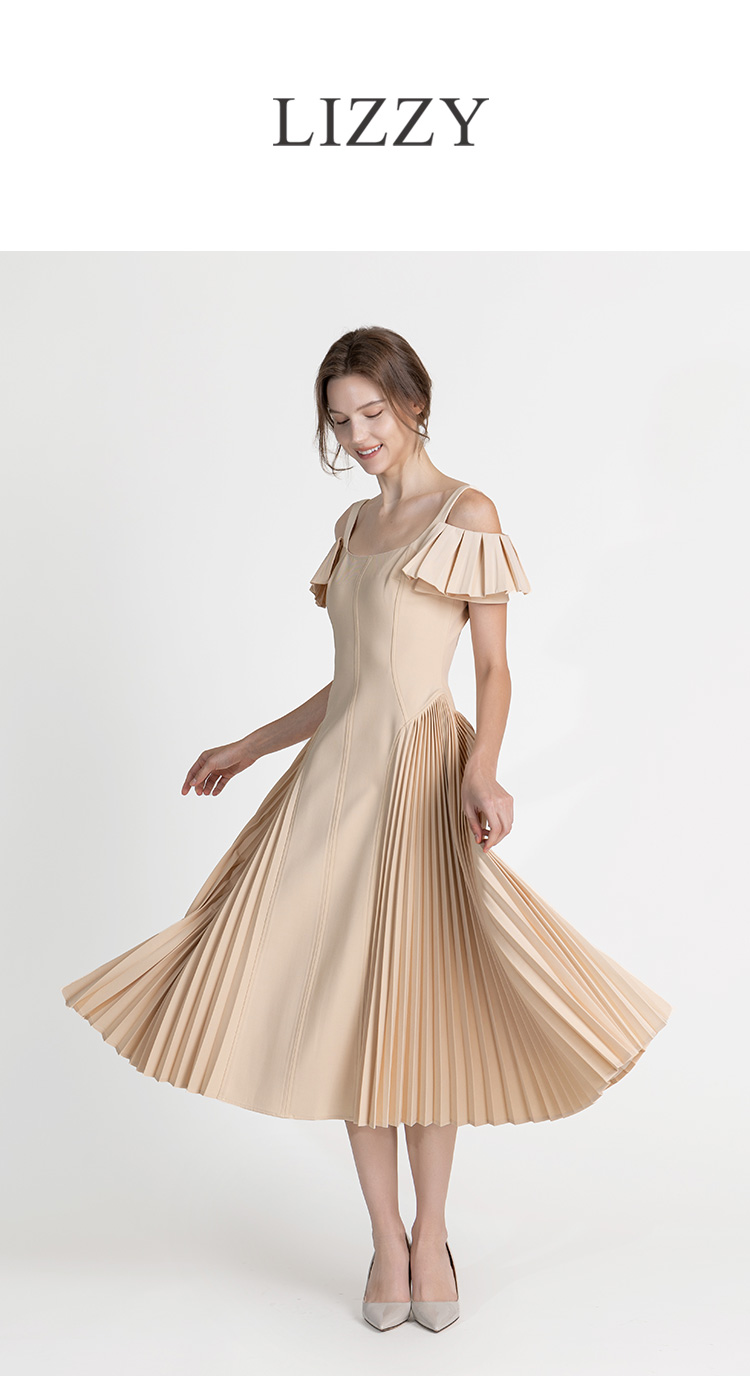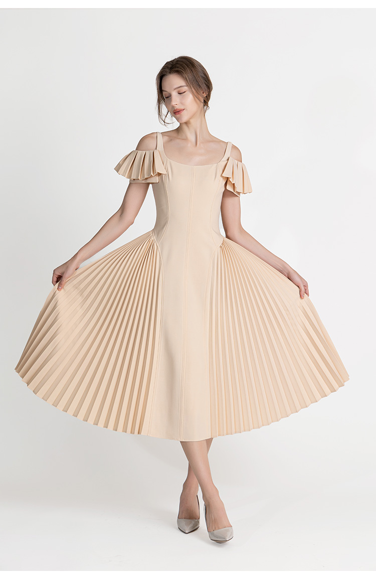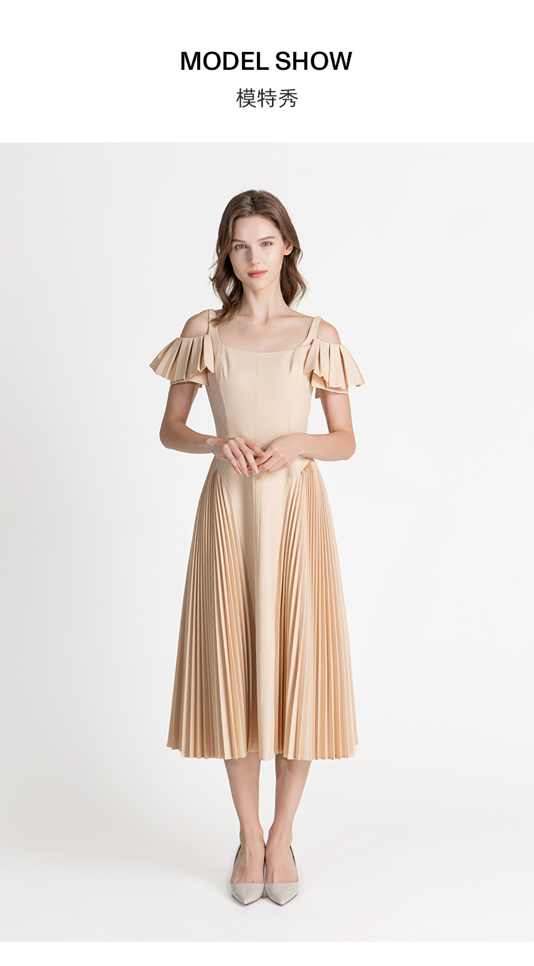LIZZY法式赫本风露肩气质轻奢飞袖百褶大裙摆礼服宴会连衣裙8054