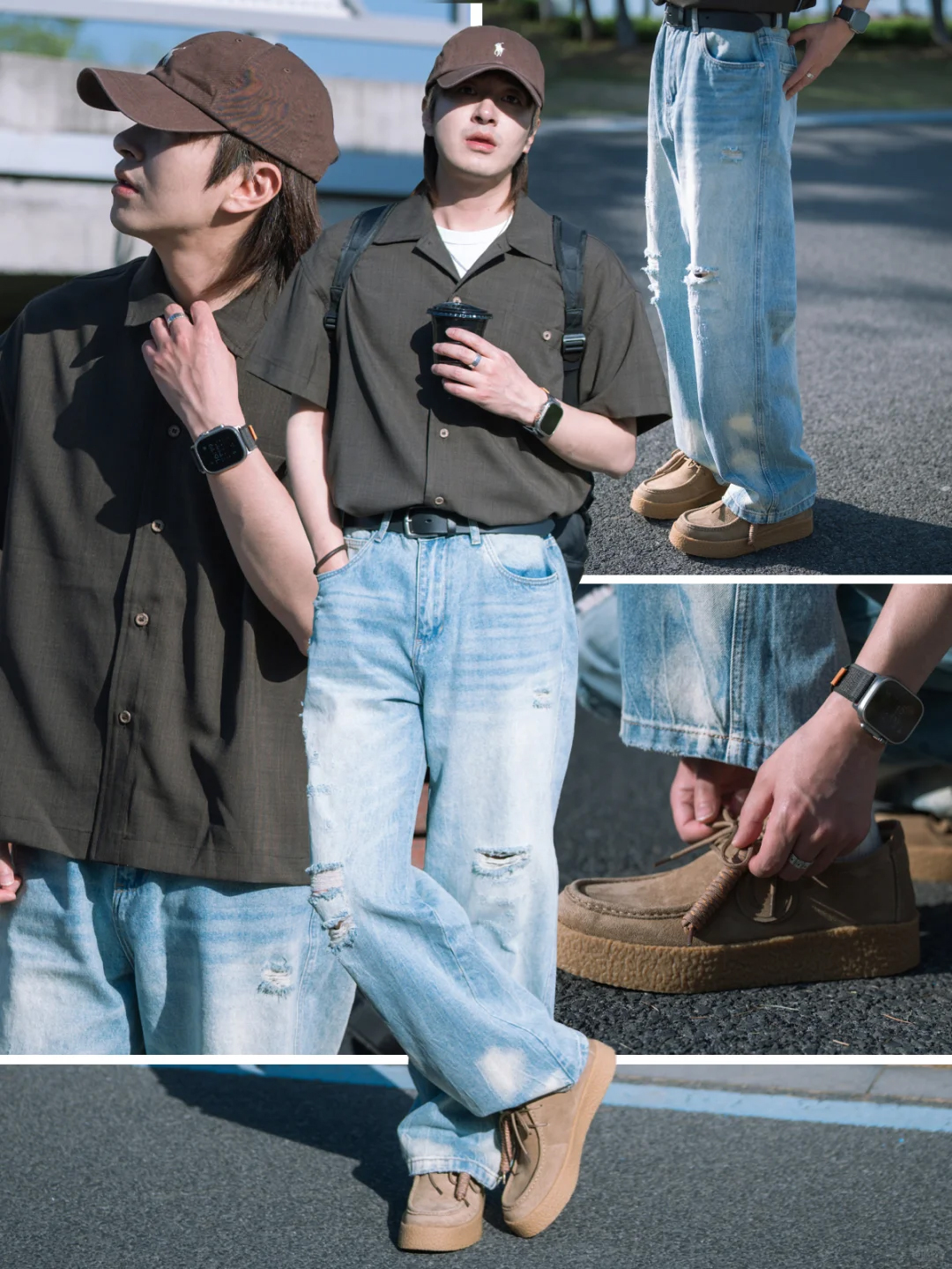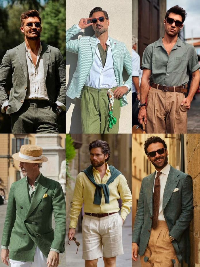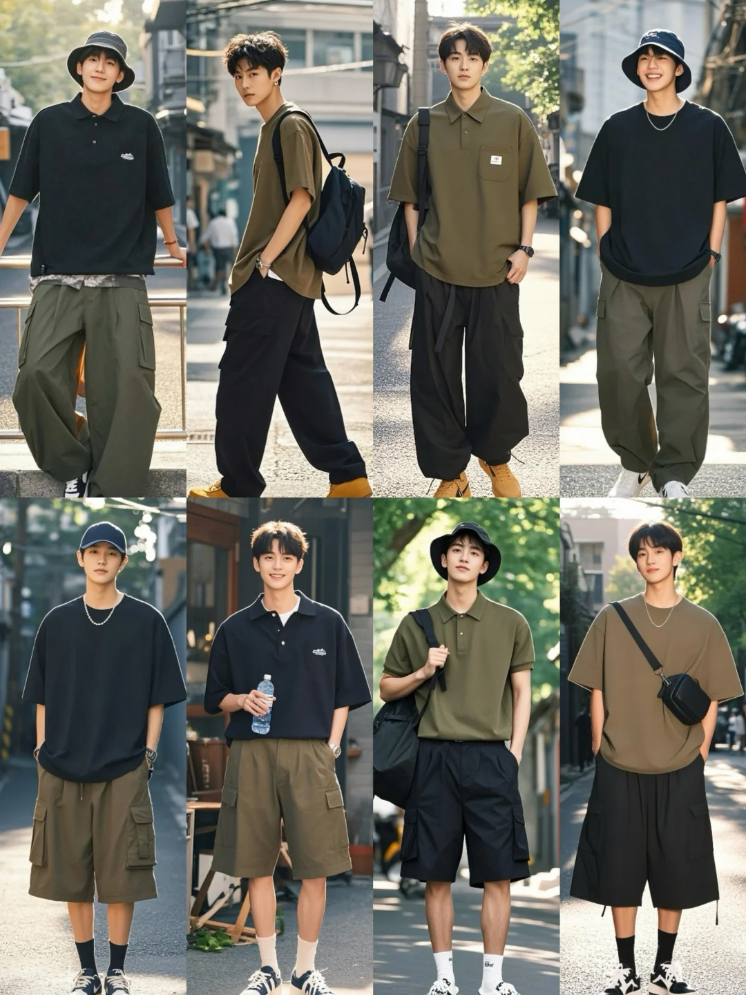 颜色选择了大地色系与低饱和纯色,橄榄绿、卡其、黑色……每一色都像被阳光亲吻过,低调衬托男性气质,与夏日风景浑然一体。