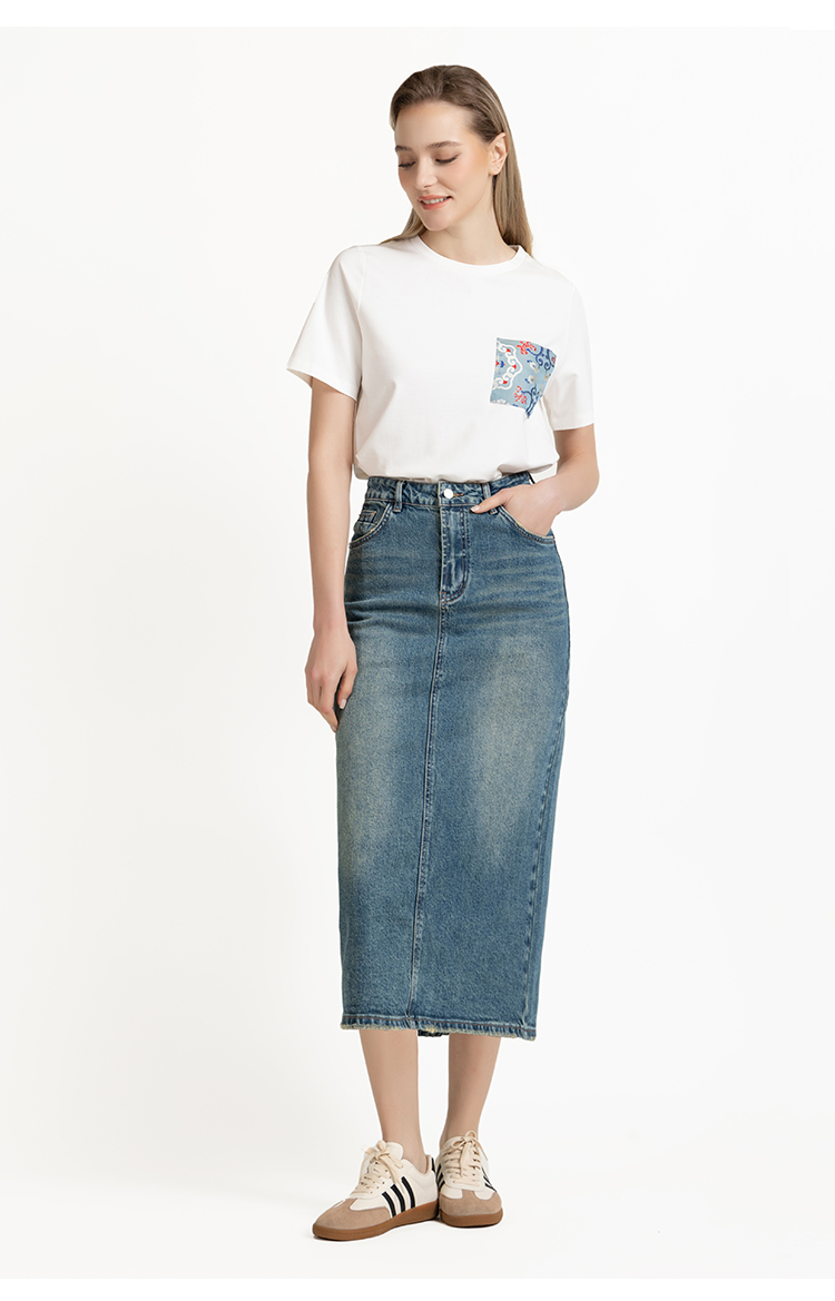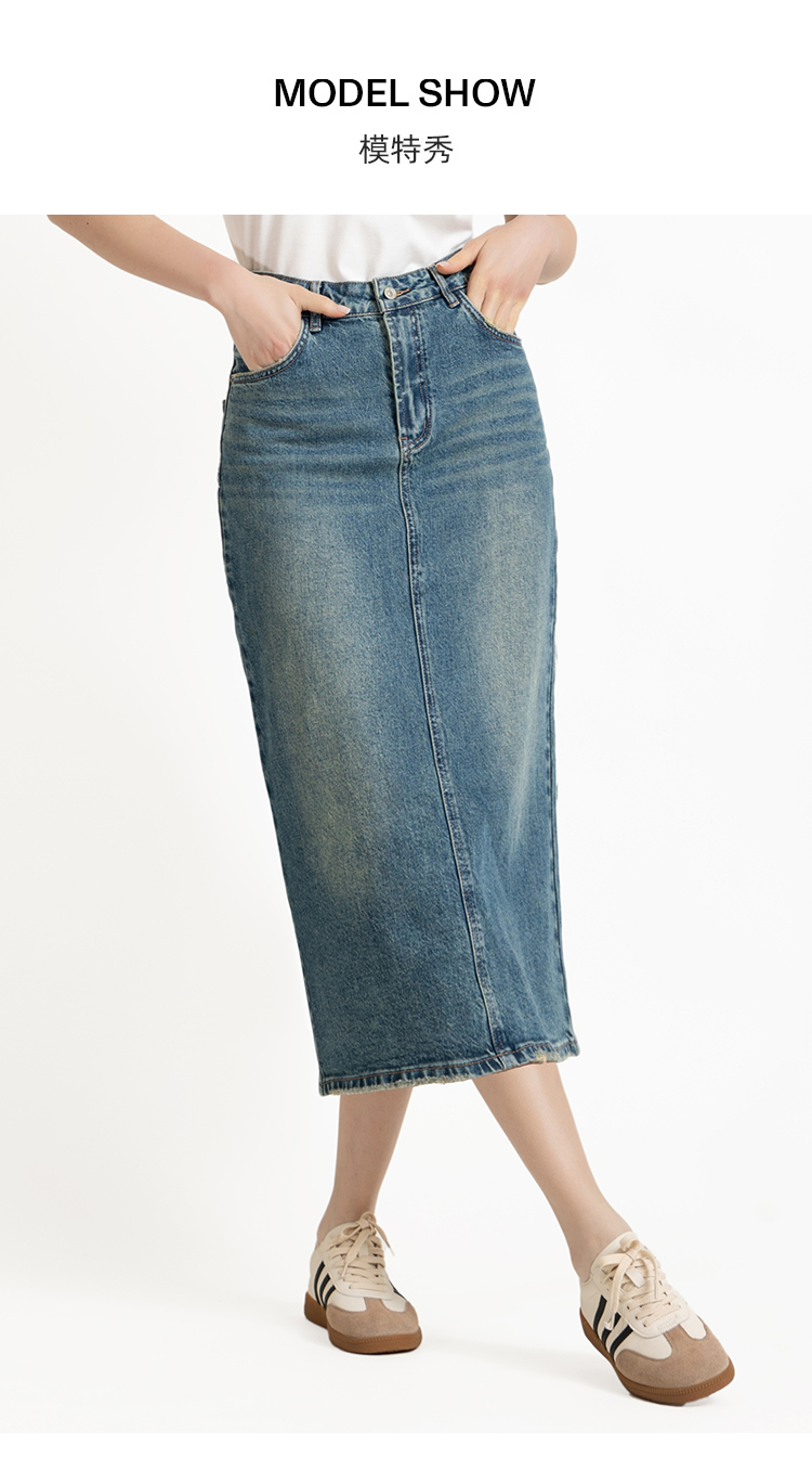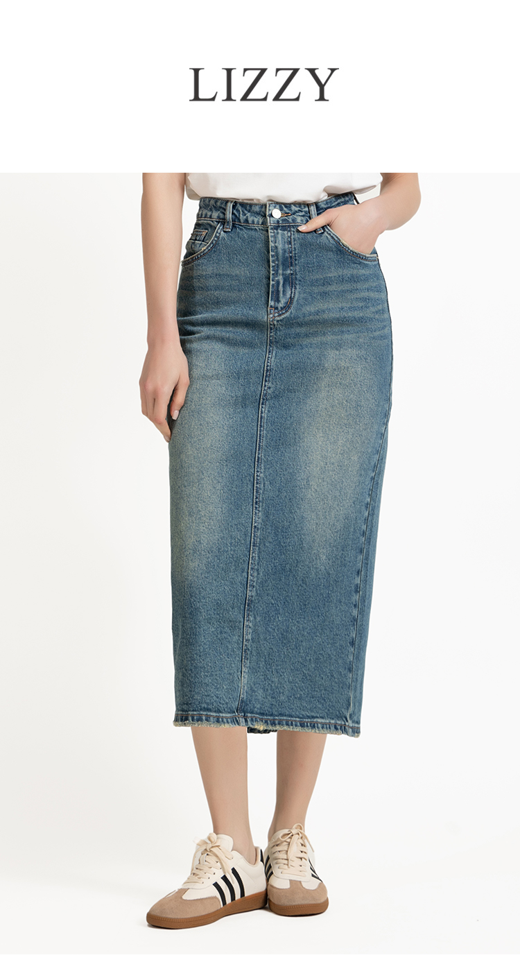 LIZZY早秋时尚休闲高腰洗水新疆棉开叉复古海蓝色牛仔裙8069