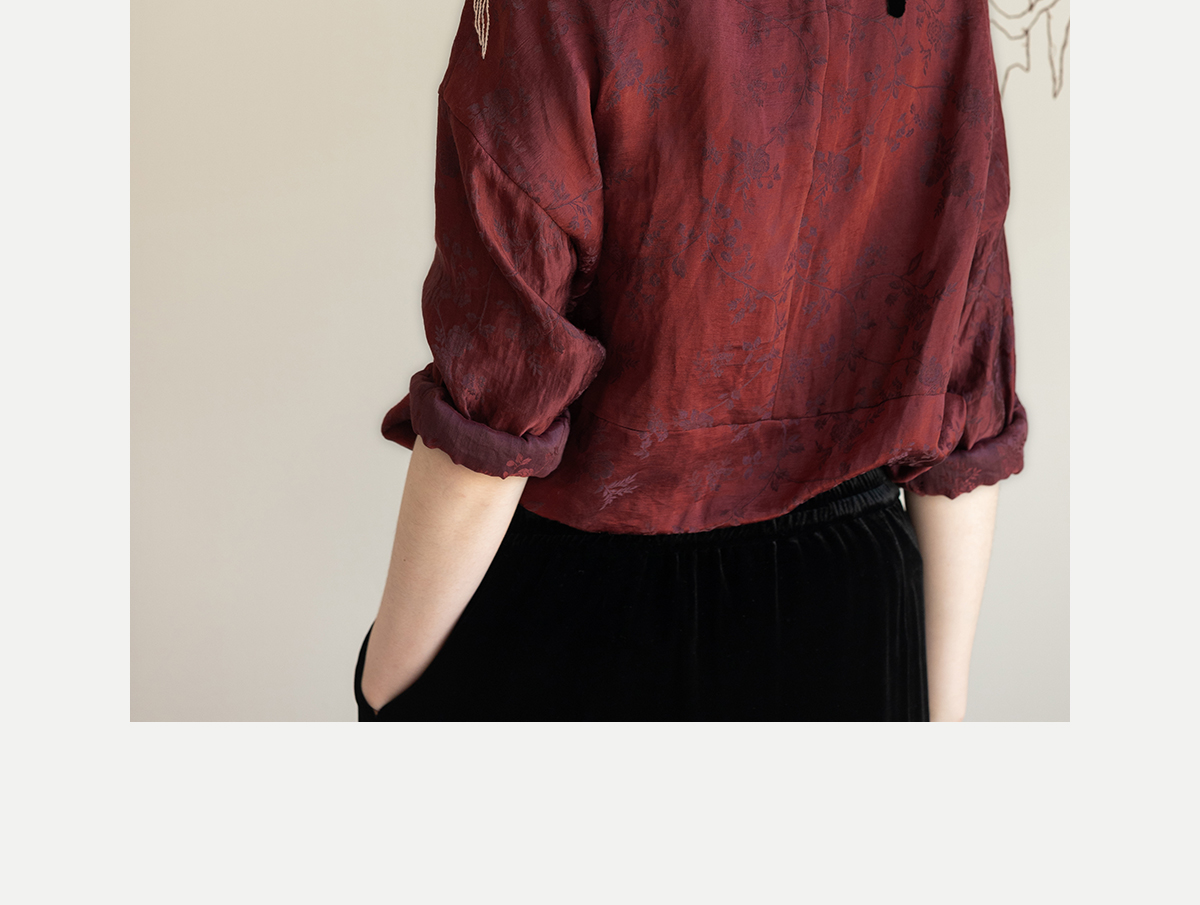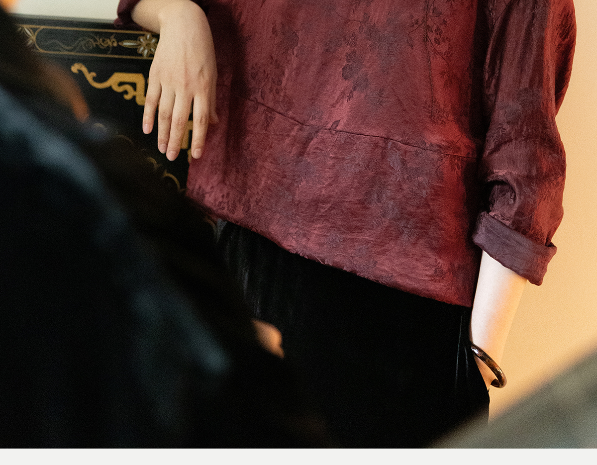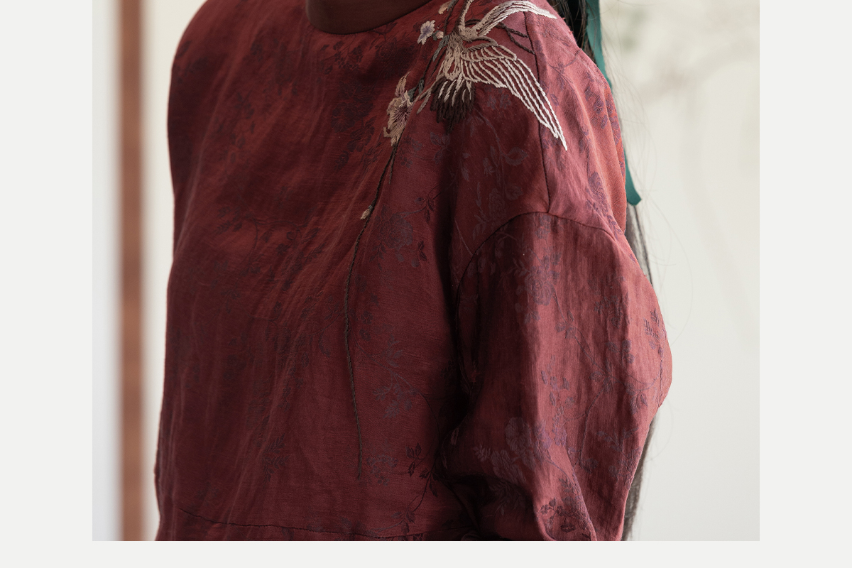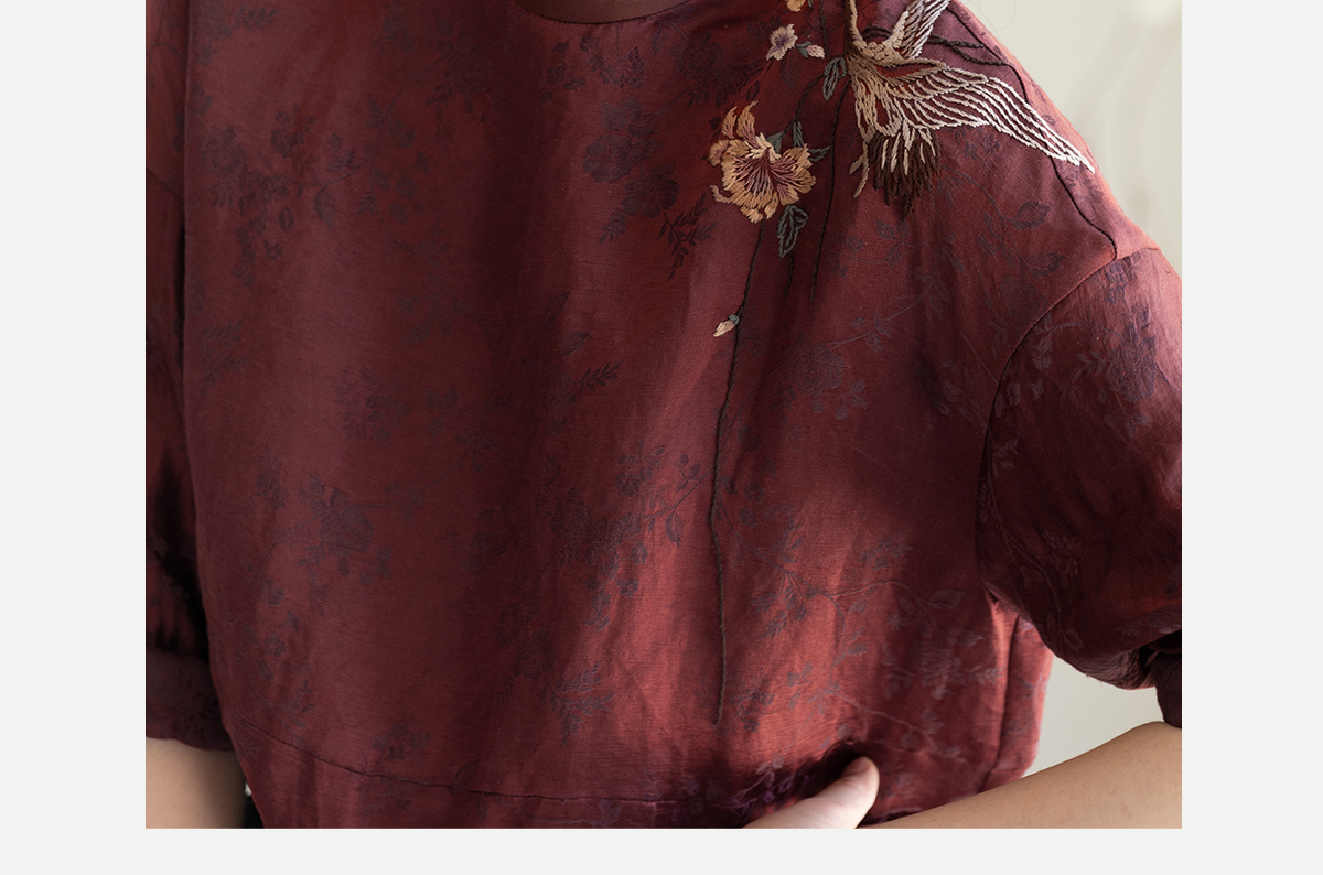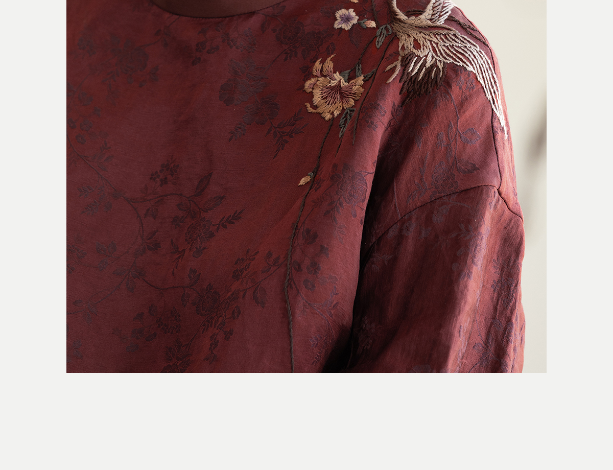 牧衣游原创 丝麻提花手工刺绣套头衫秋拼接东方复古红色上衣 尽染