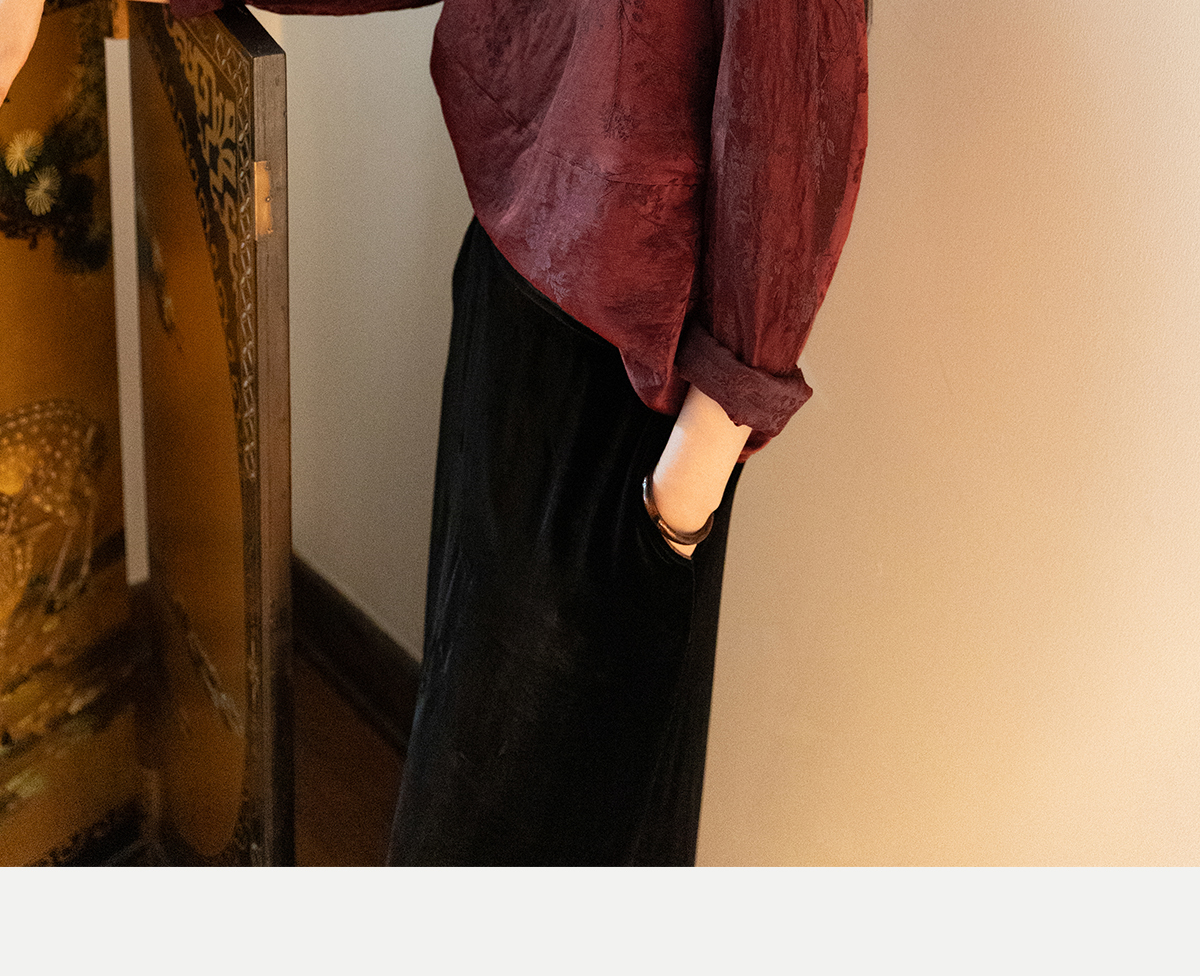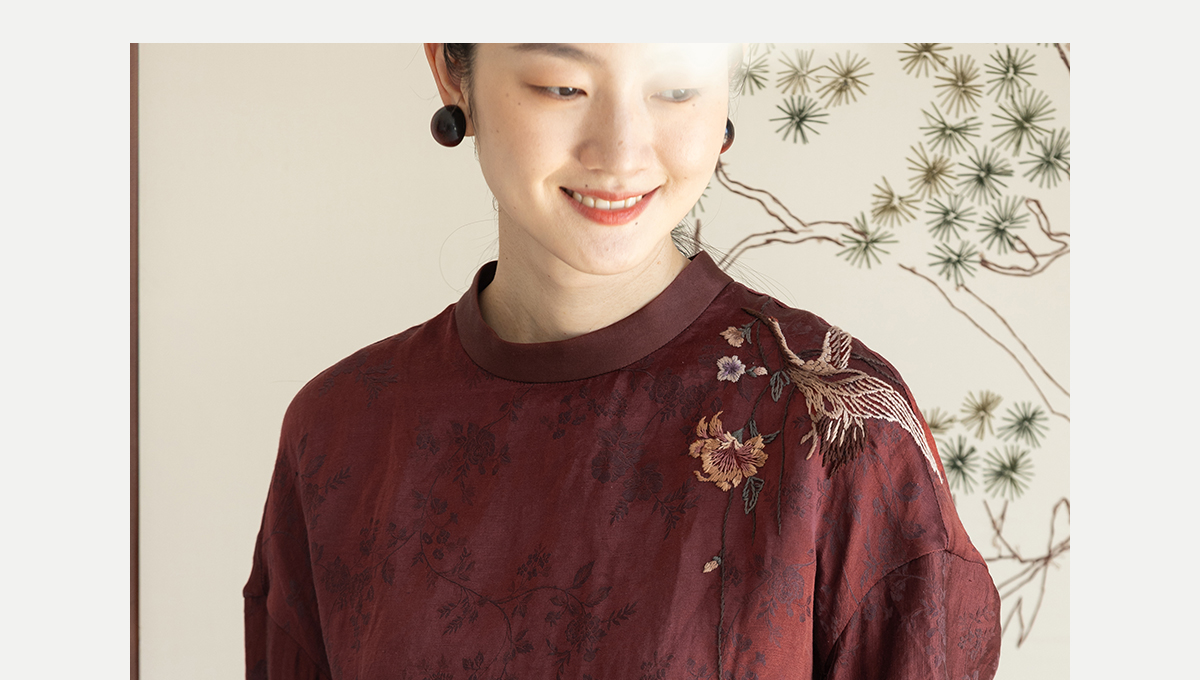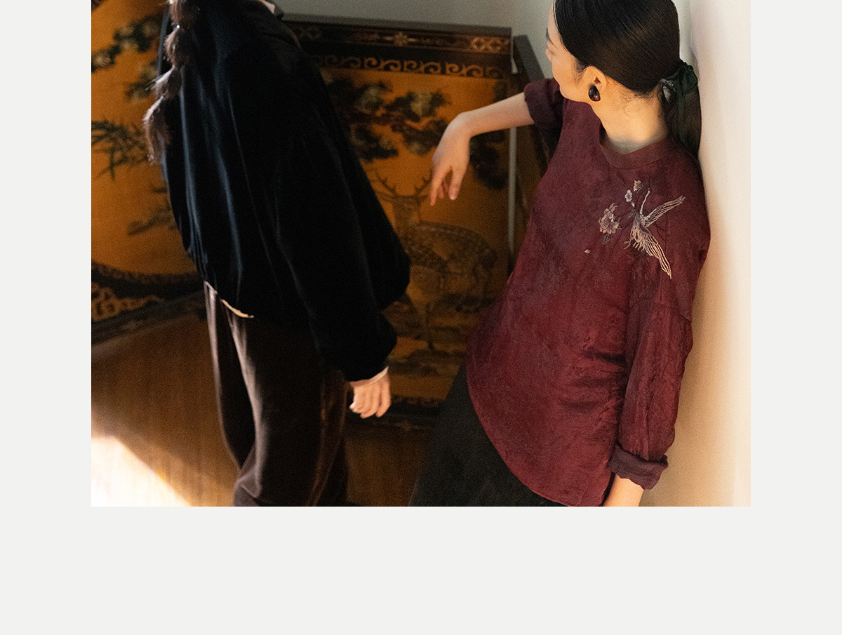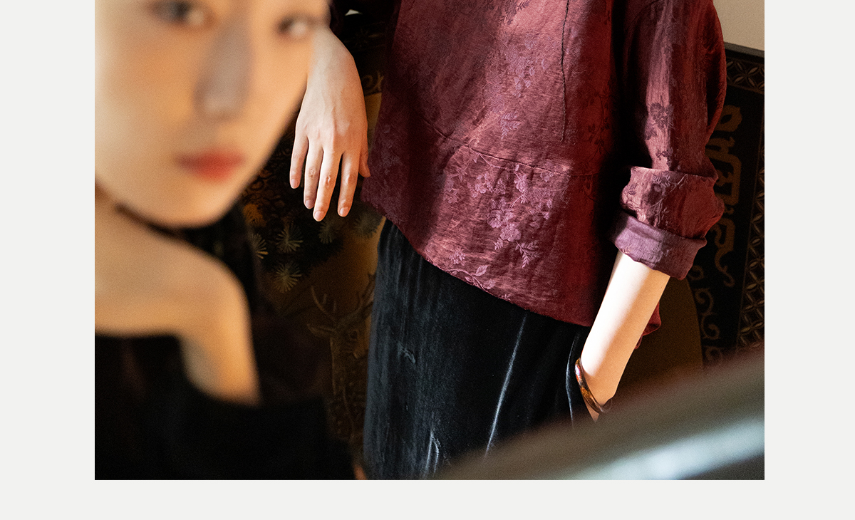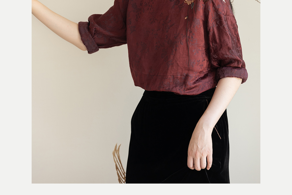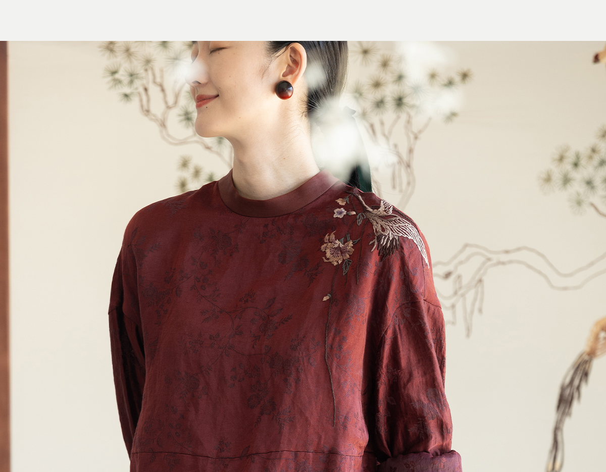 牧衣游原创 丝麻提花手工刺绣套头衫秋拼接东方复古红色上衣 尽染