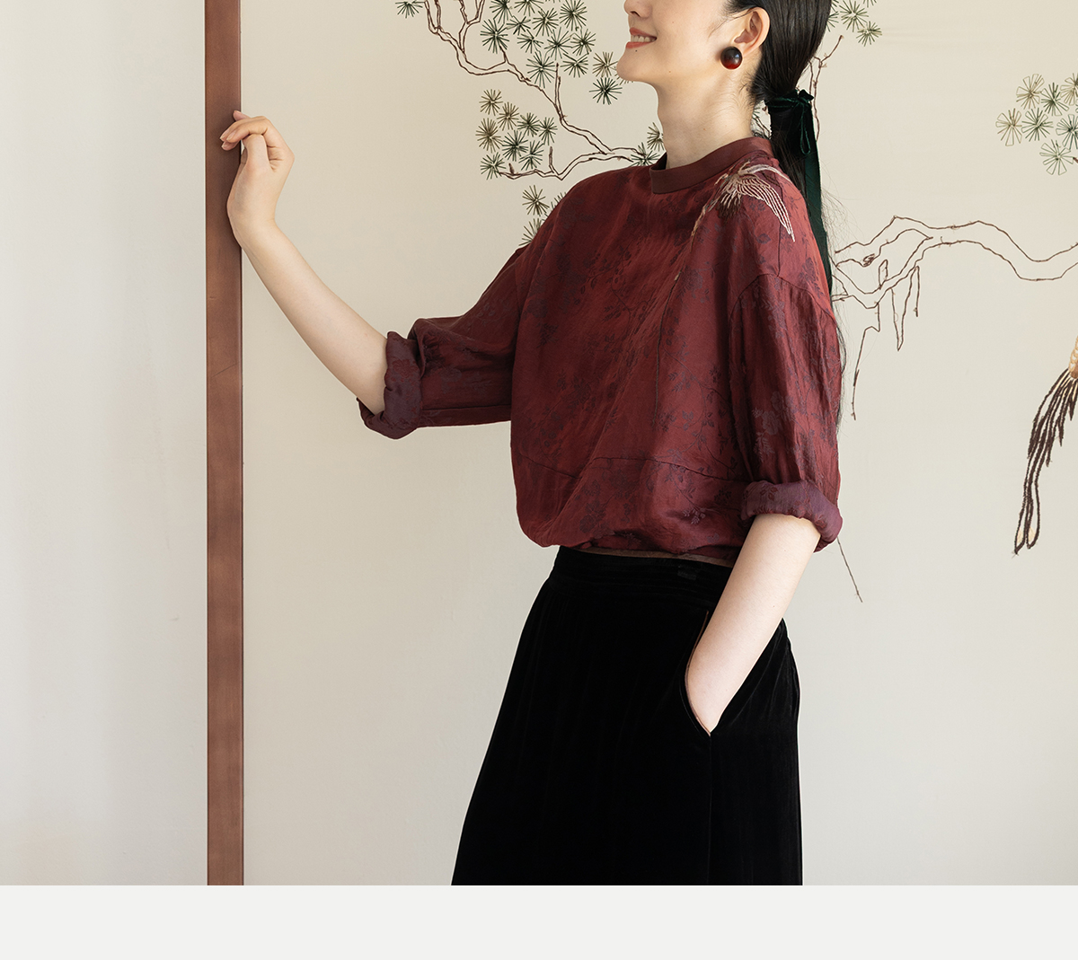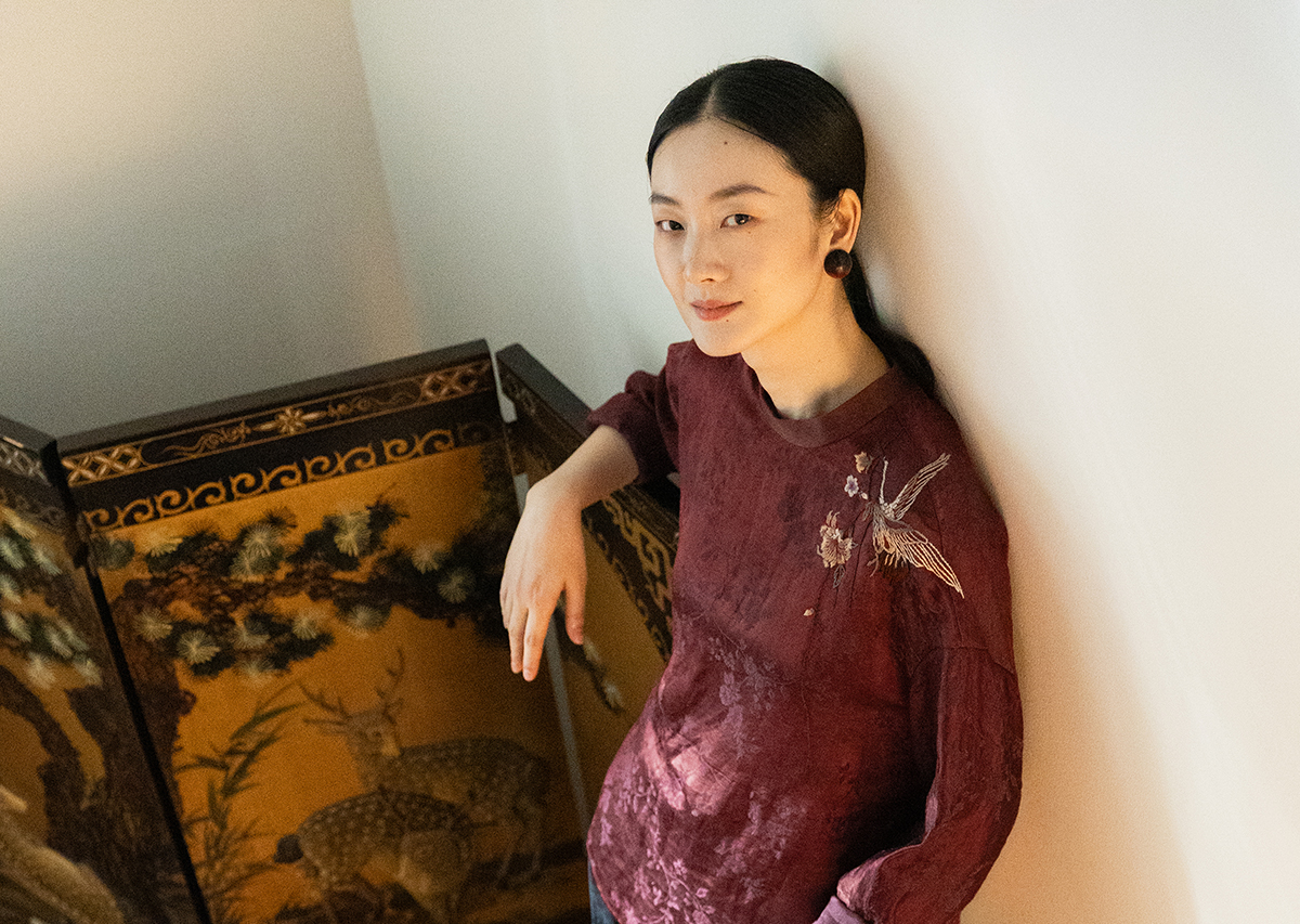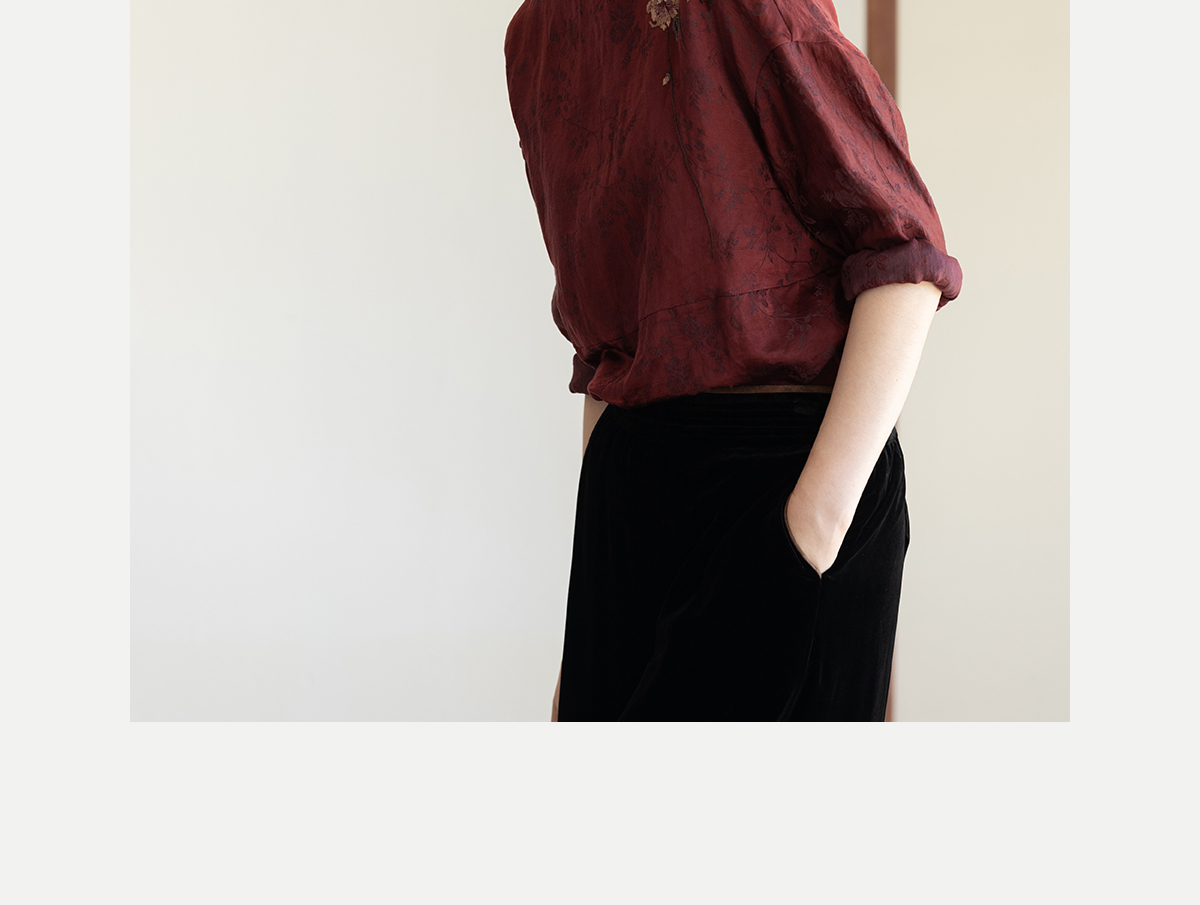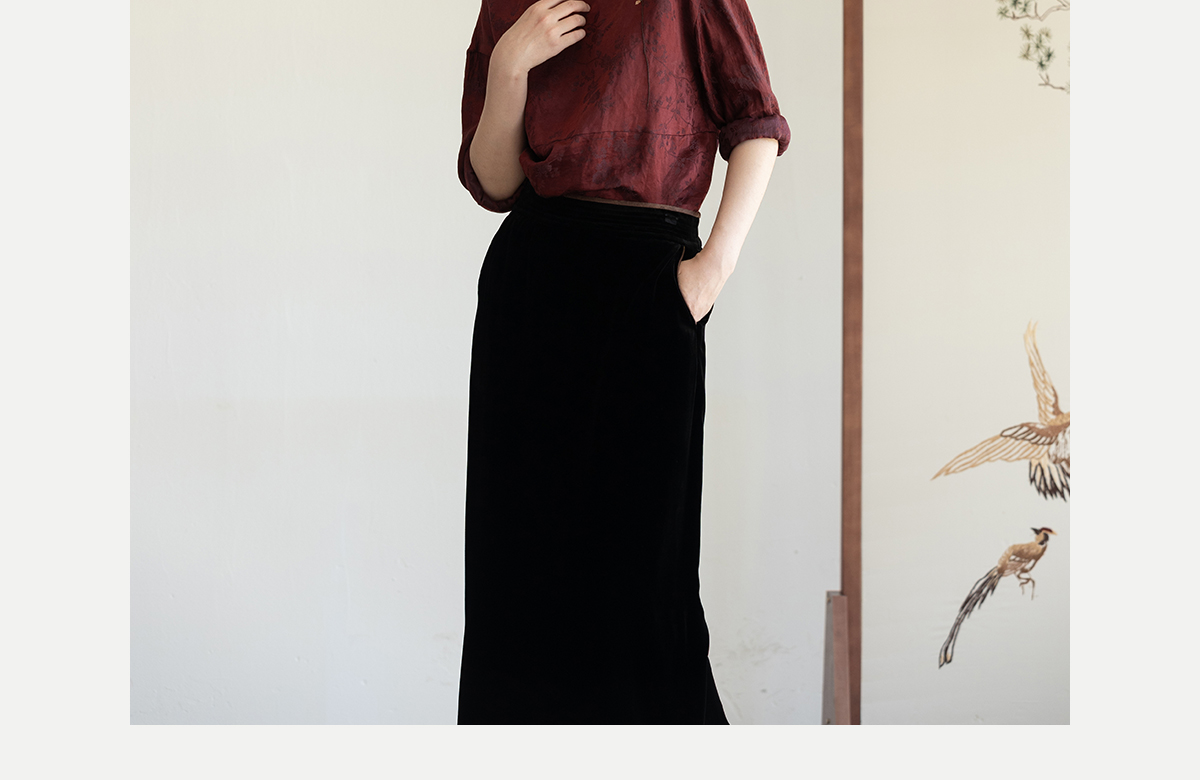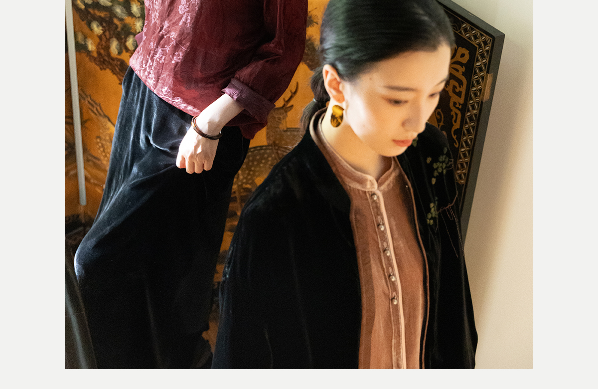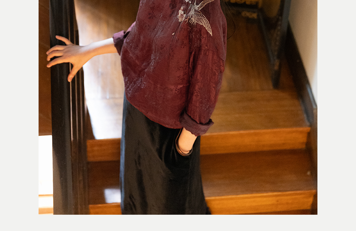 牧衣游原创 丝麻提花手工刺绣套头衫秋拼接东方复古红色上衣 尽染