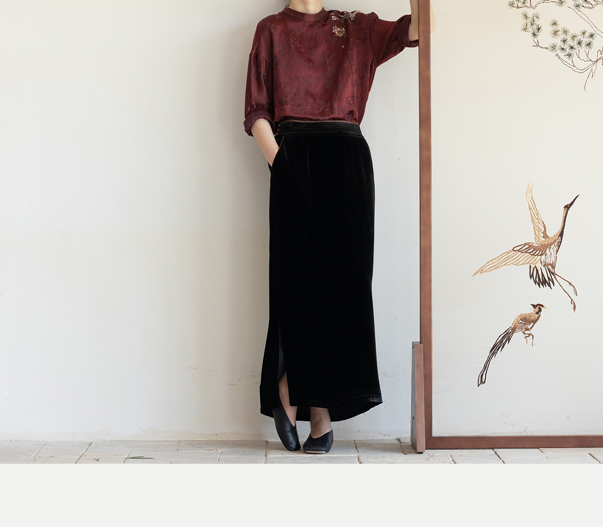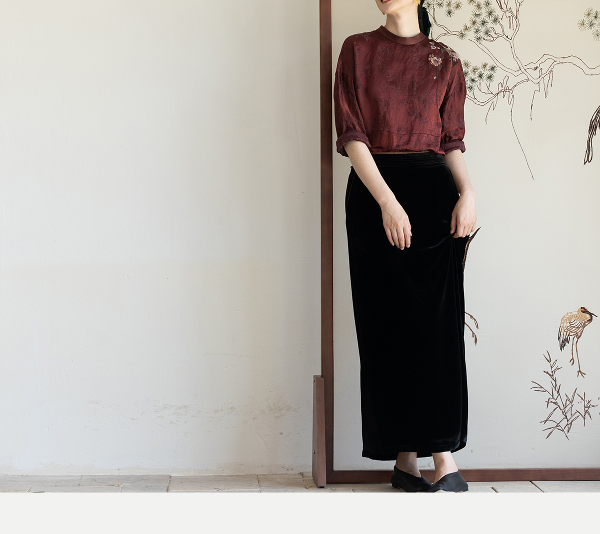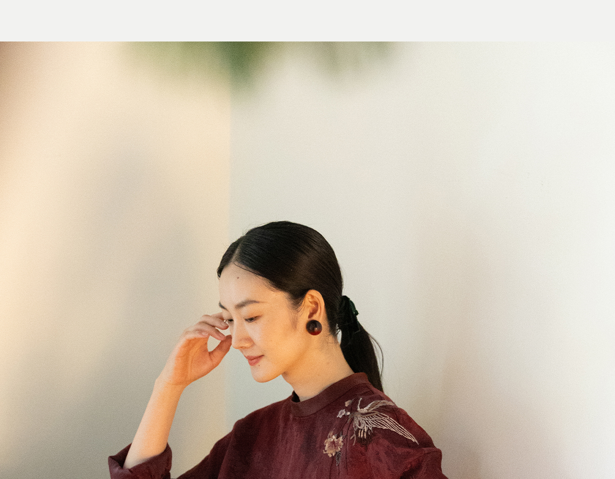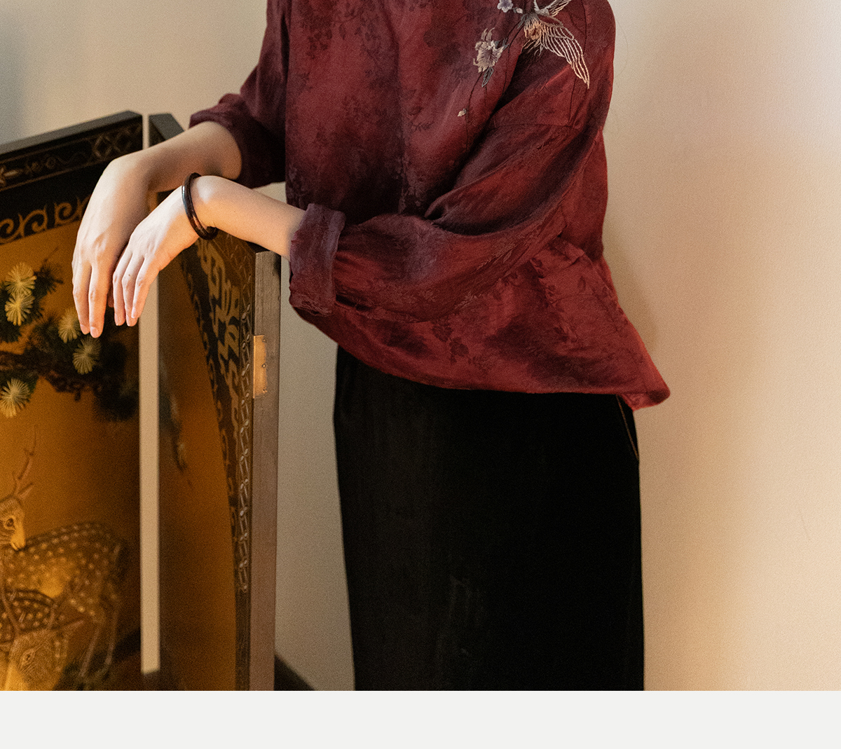 牧衣游原创 丝麻提花手工刺绣套头衫秋拼接东方复古红色上衣 尽染