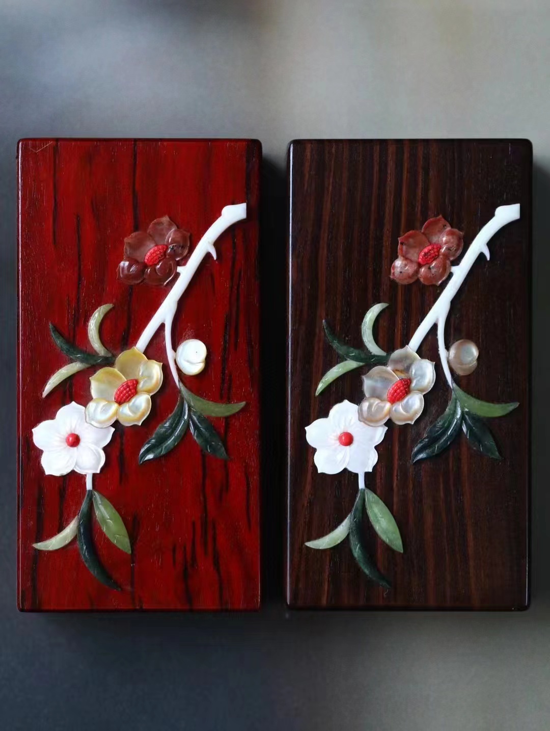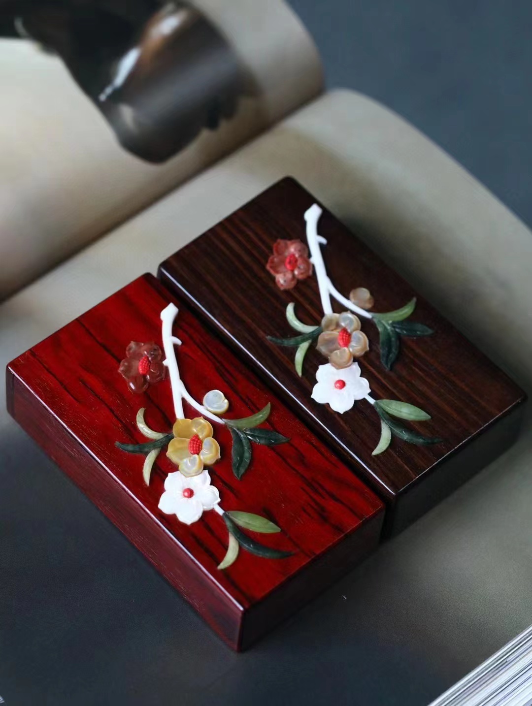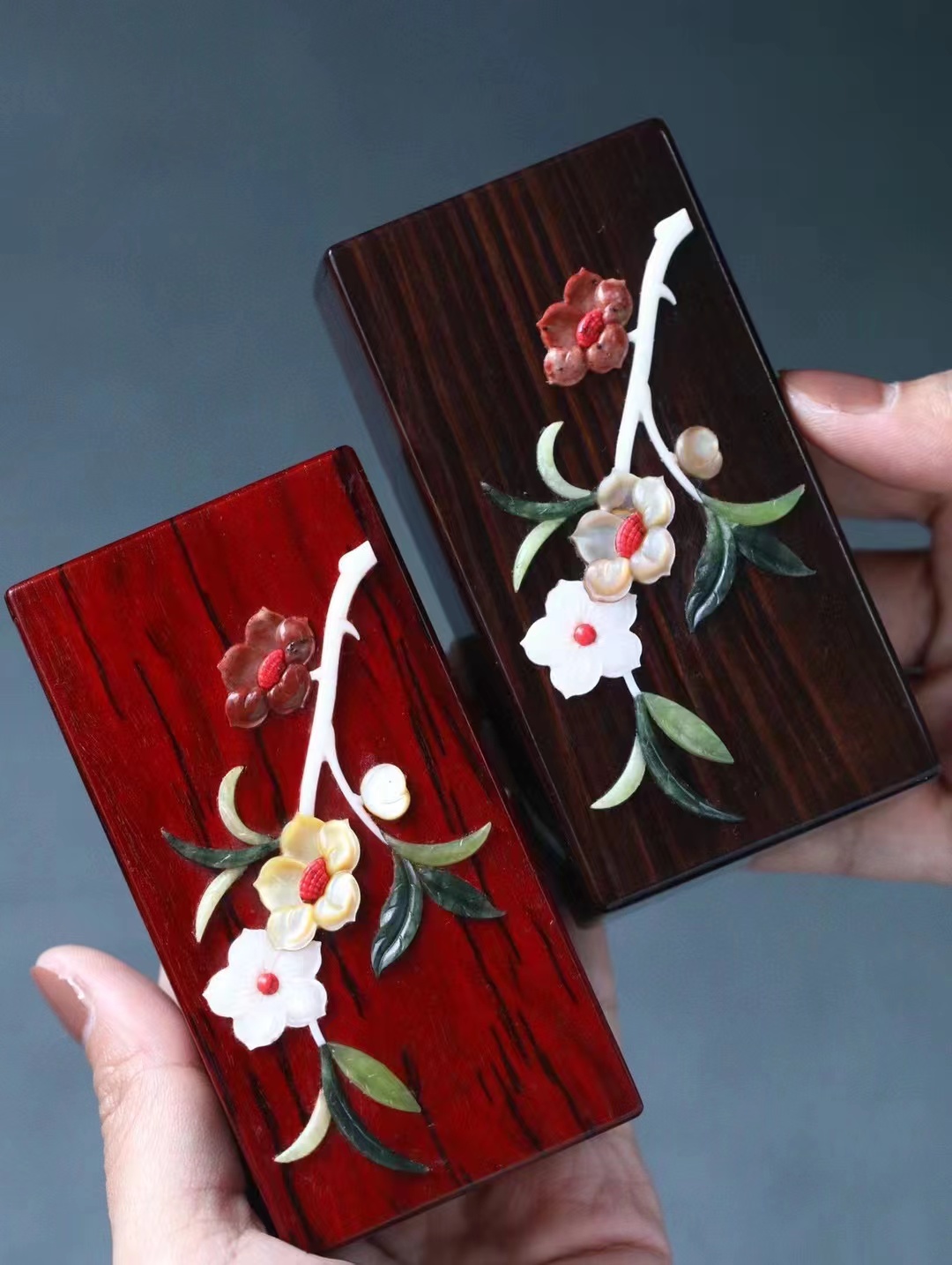 一款专为抽烟人士设计的烟盒,由紫檀镶嵌百宝嵌,拿在手中可盘玩,置于案上有面子,一款文雅的烟盒!