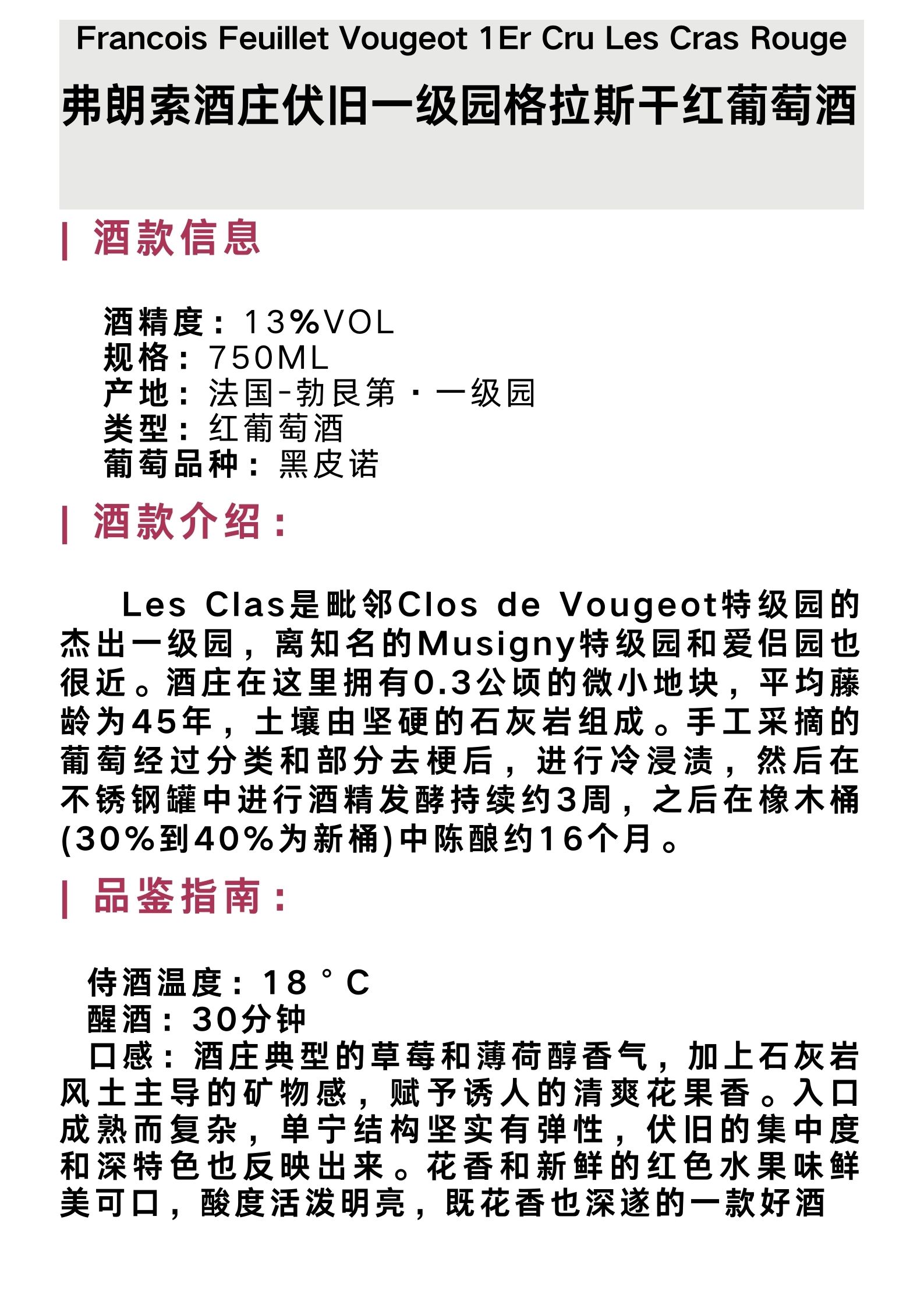 弗朗索酒庄伏旧一级园格拉斯干红葡萄酒 Francois Feuillet Vougeot Rouge 1Er Cru Les Cras - 2019