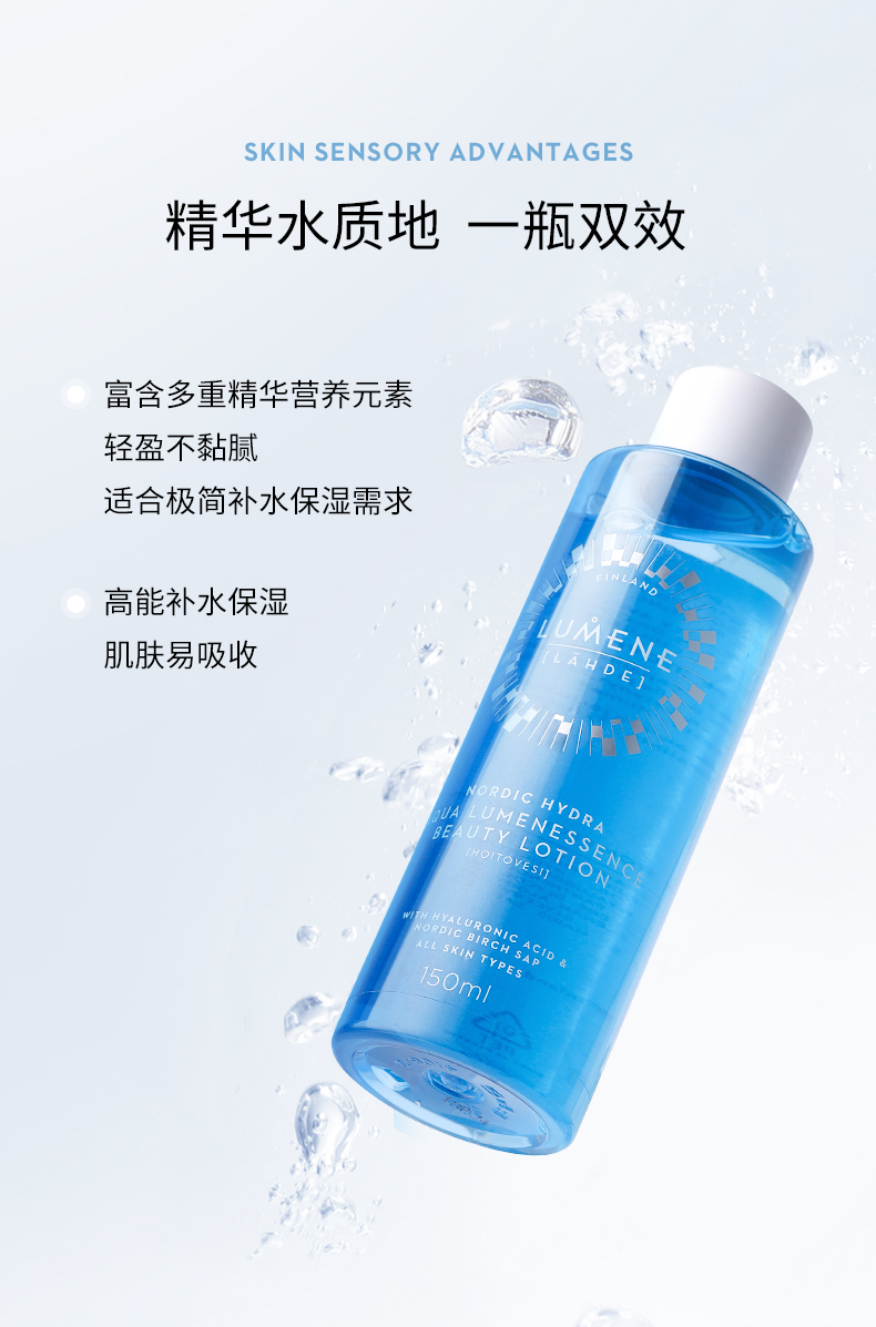 LUMENE的保湿精华水,添加了精华的成分,比普通的化妆水更滋润,一瓶兼补水+精华的效果,帮助皮肤打开补水的通道,促进后续护肤品的吸收。