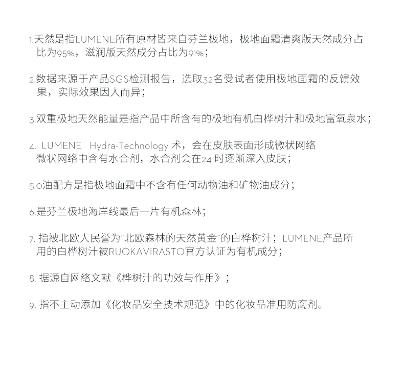 LUMENE的极地面霜滋润版经过SGS权威验证,对其保湿功效测试,改善皮肤屏障、皮肤泛红、皮肤粗糙度,致粉刺性功效进行测试,测试结果如下: