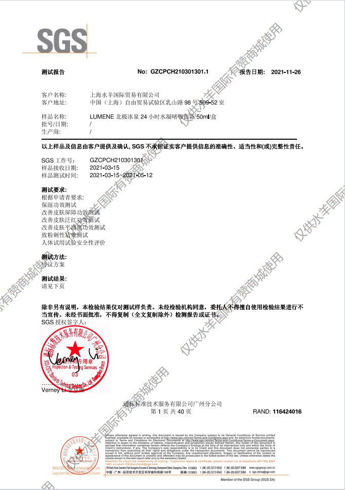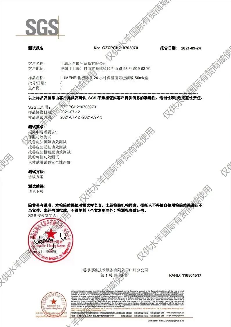 LUMENE的极地面霜清爽版经过SGS权威验证,对其保湿功效测试,改善皮肤屏障、皮肤泛红、皮肤粗糙度,致粉刺性功效进行测试,测试结果如下:
