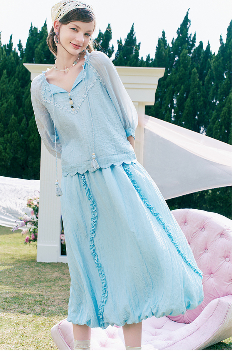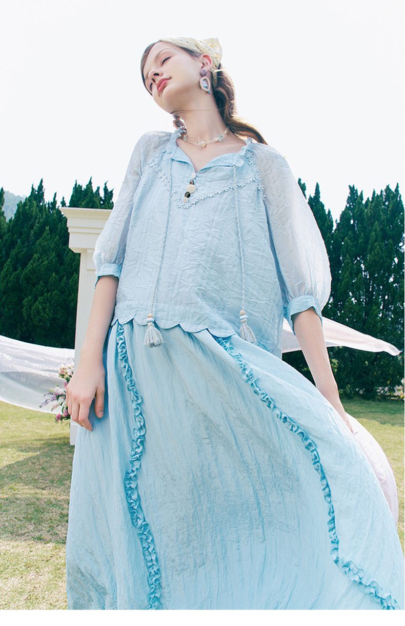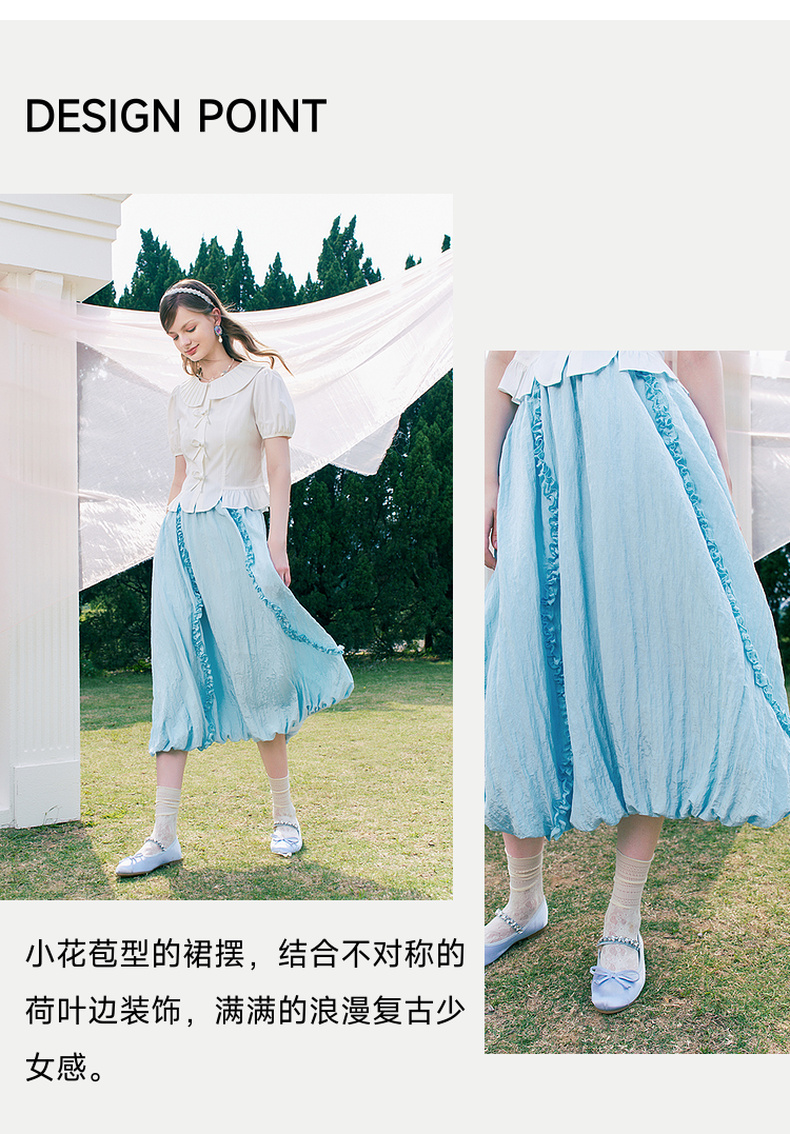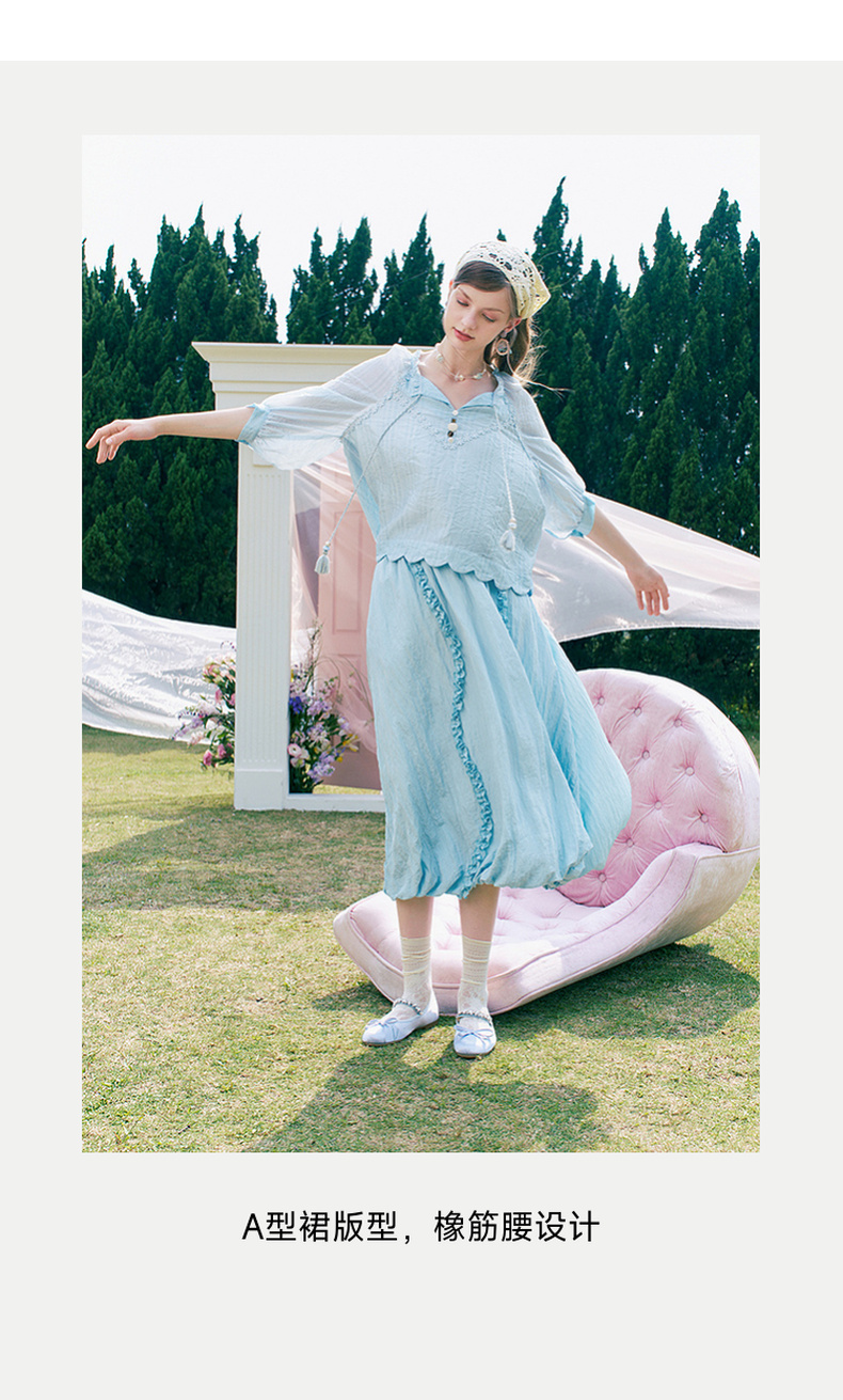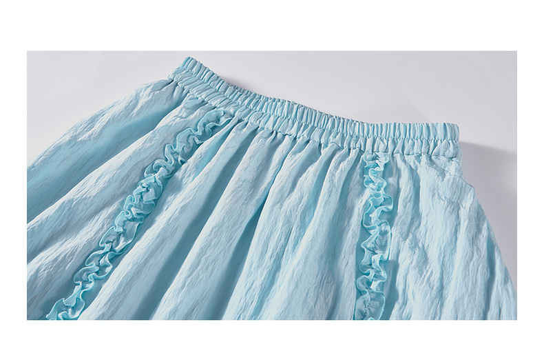 两三事似水流年2024夏季新款温柔风木耳边抽绳裙摆高腰半身裙长裙