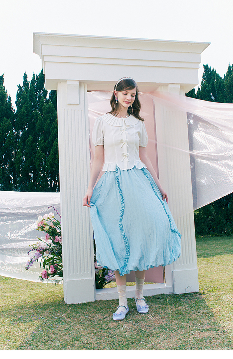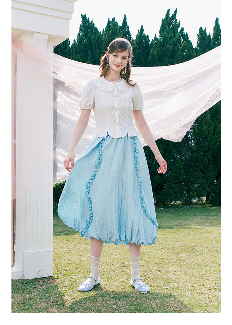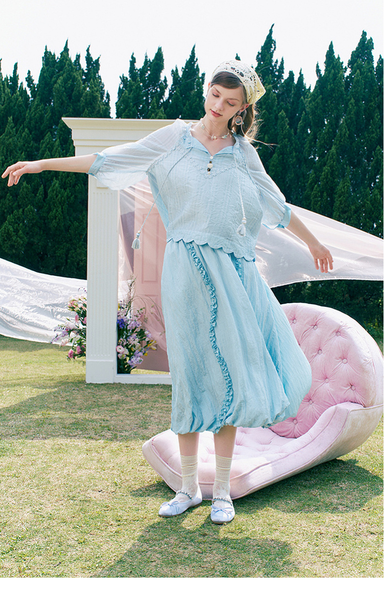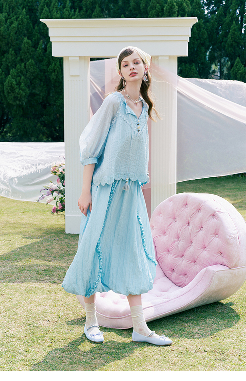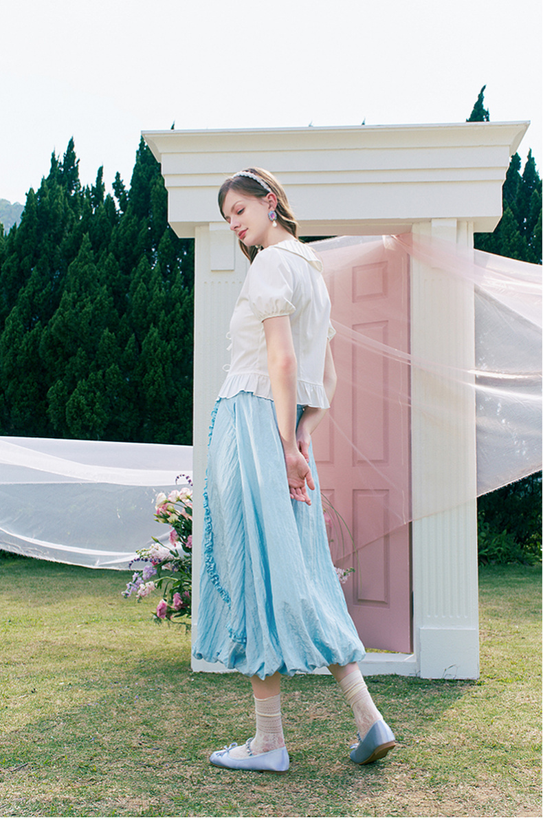 两三事似水流年2024夏季新款温柔风木耳边抽绳裙摆高腰半身裙长裙
