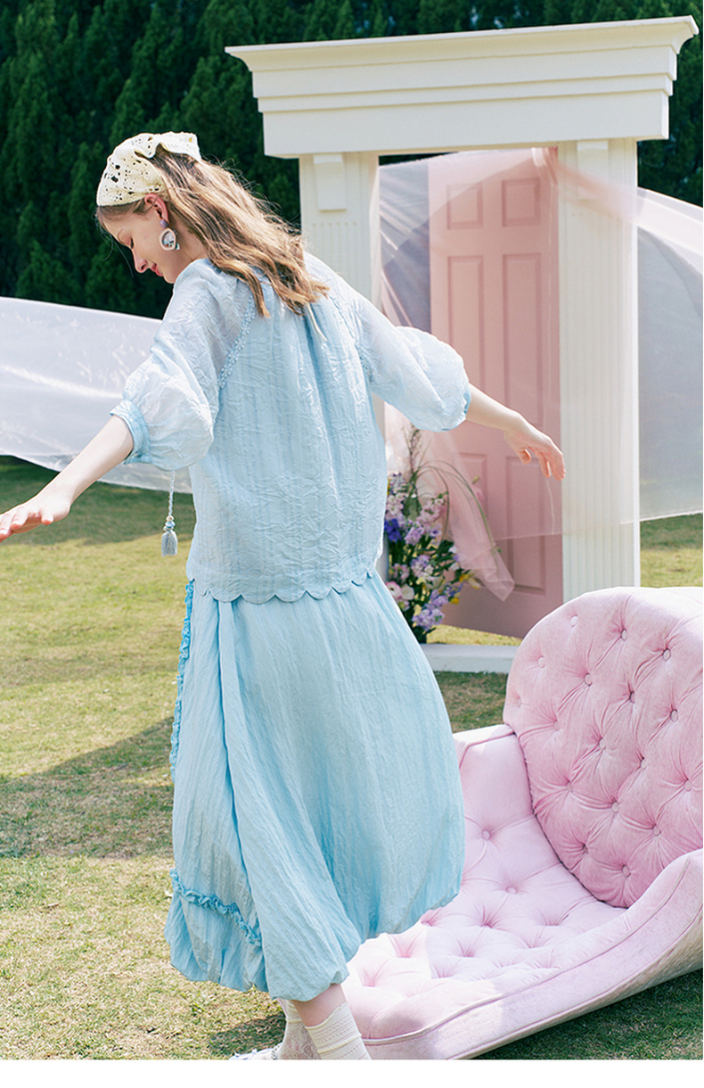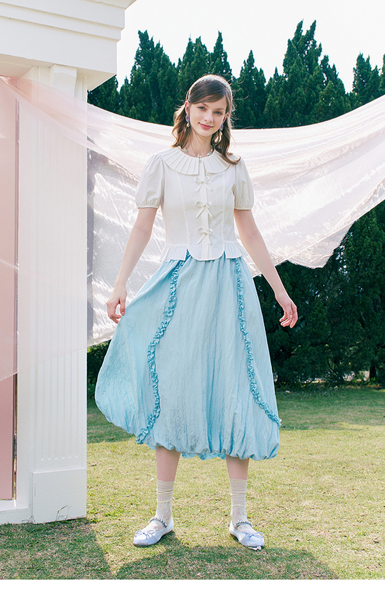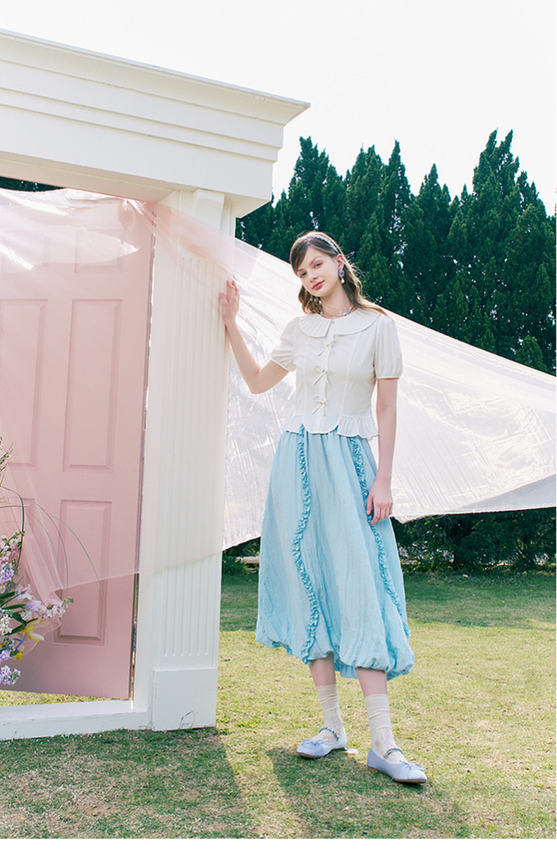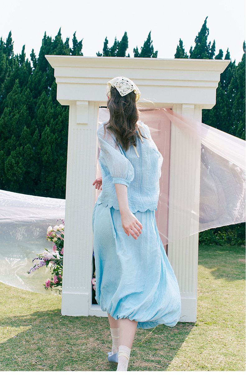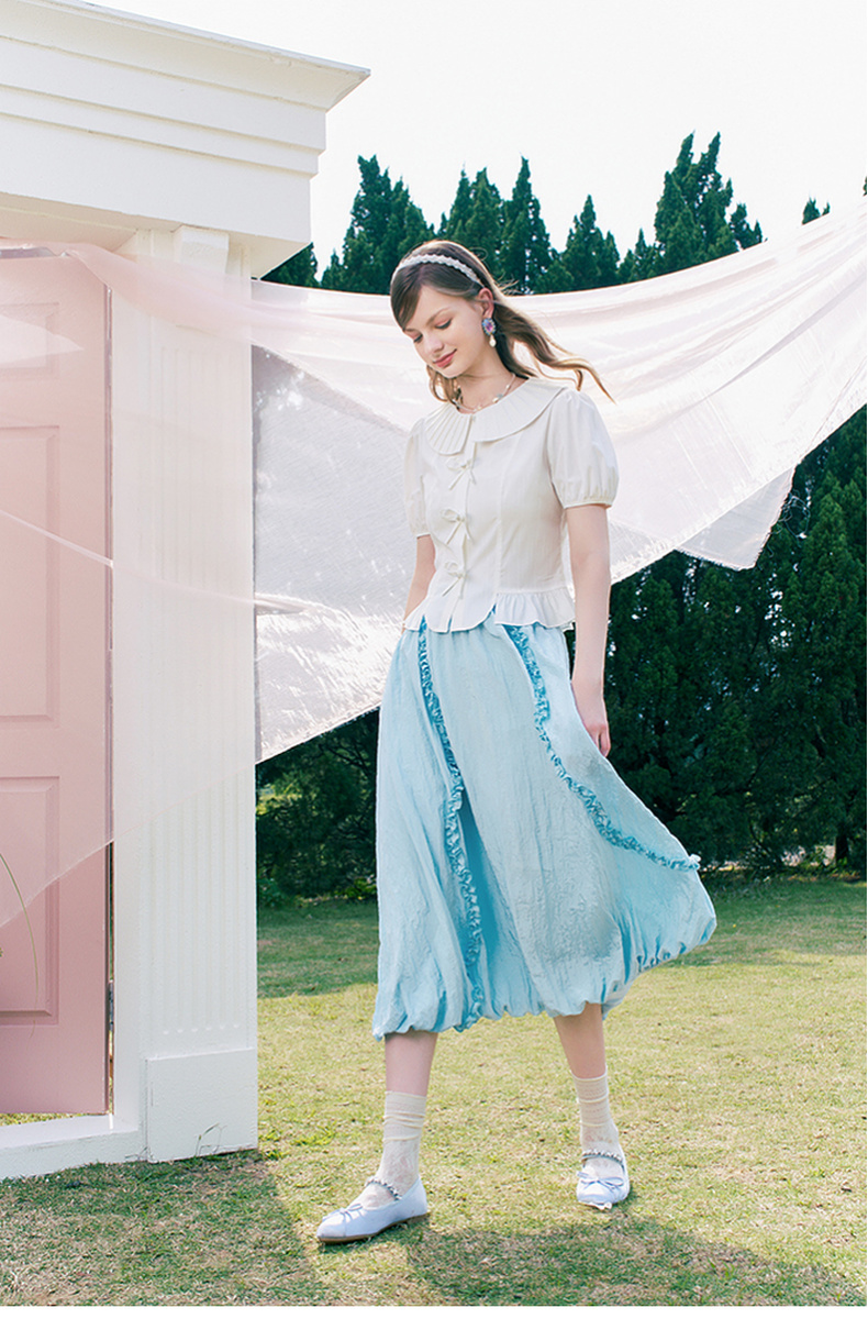 两三事似水流年2024夏季新款温柔风木耳边抽绳裙摆高腰半身裙长裙