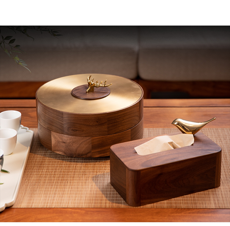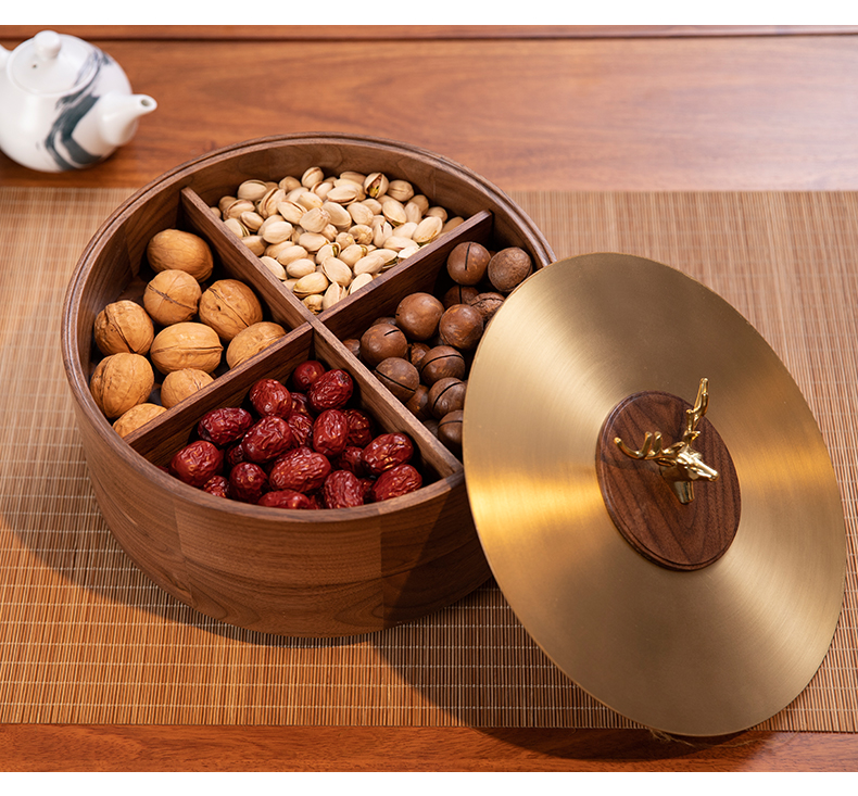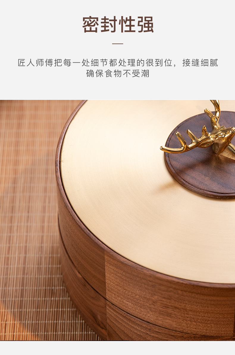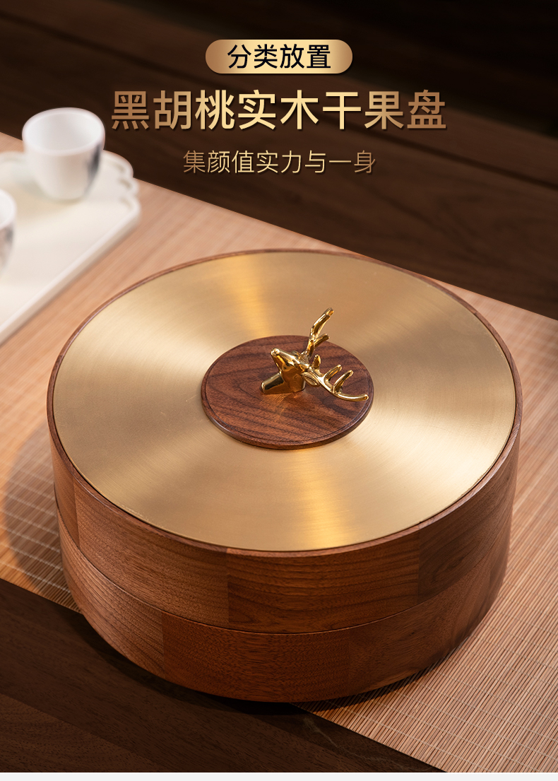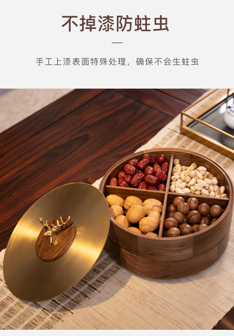 黑胡桃木轻奢带盖纯铜多层创意收纳干果盒零食水果盘客厅茶几家用
