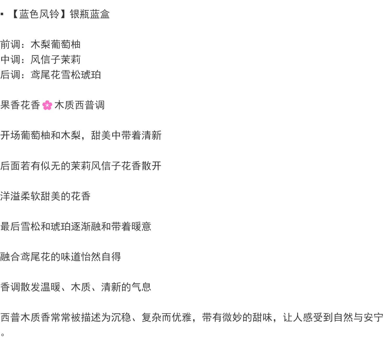 果香花香木质西普调 开场葡萄柚和木梨,甜美中带着清新 后面若有似无的茉莉风信子花香散开 洋溢柔软甜美的花香 最后雪松和琥珀逐渐融和带着暖意 融合鸢尾花的味道怡然自得 香调散发温暖、木质、清新的气息 西普木质香常常被描述为沉稳、复杂而优雅,带有微妙的甜味,让人感受到自然与安宁。