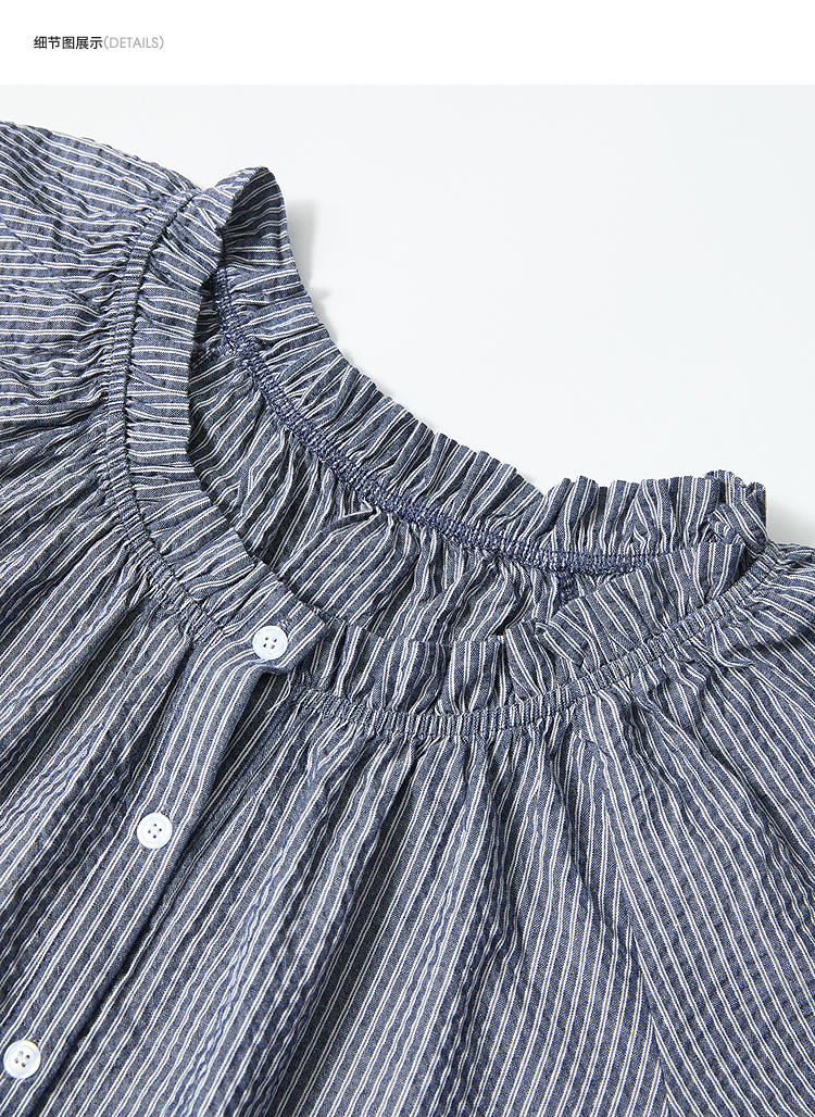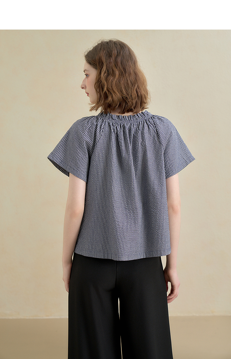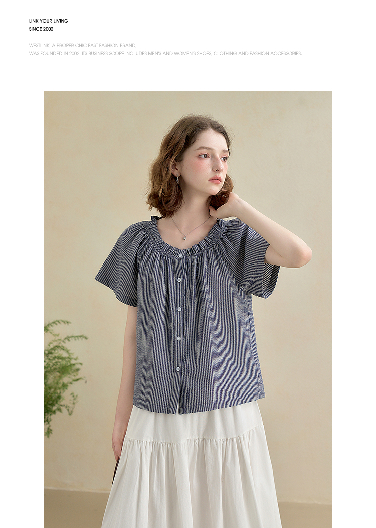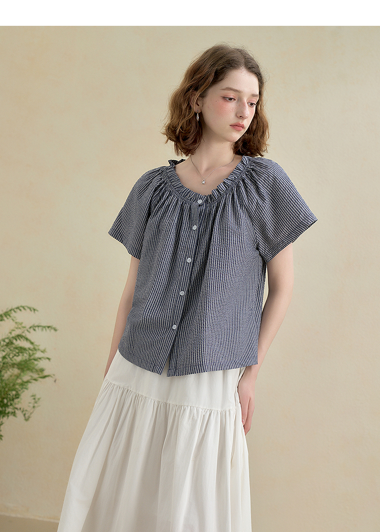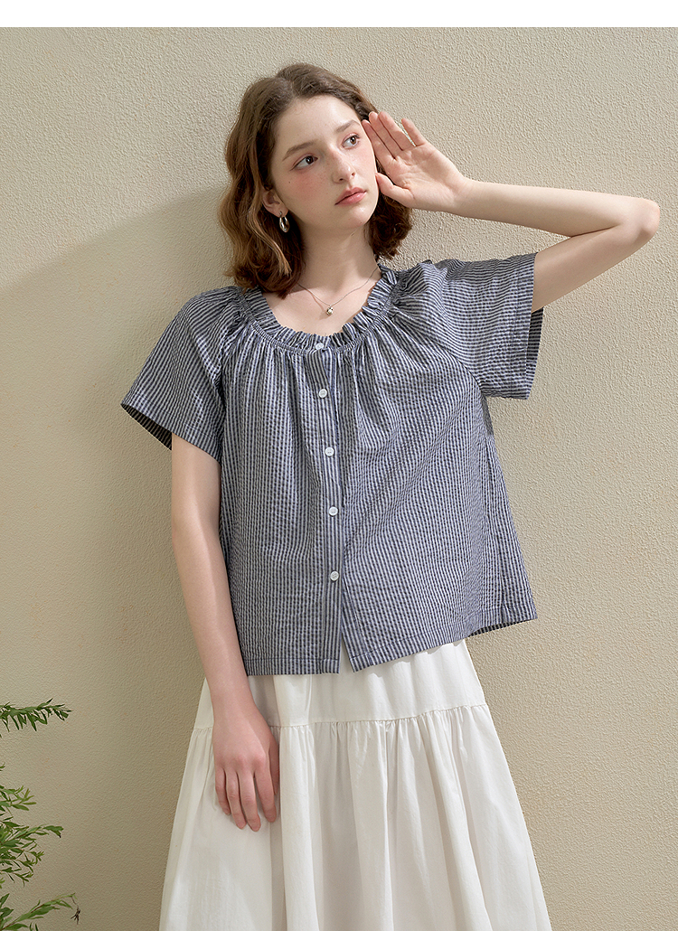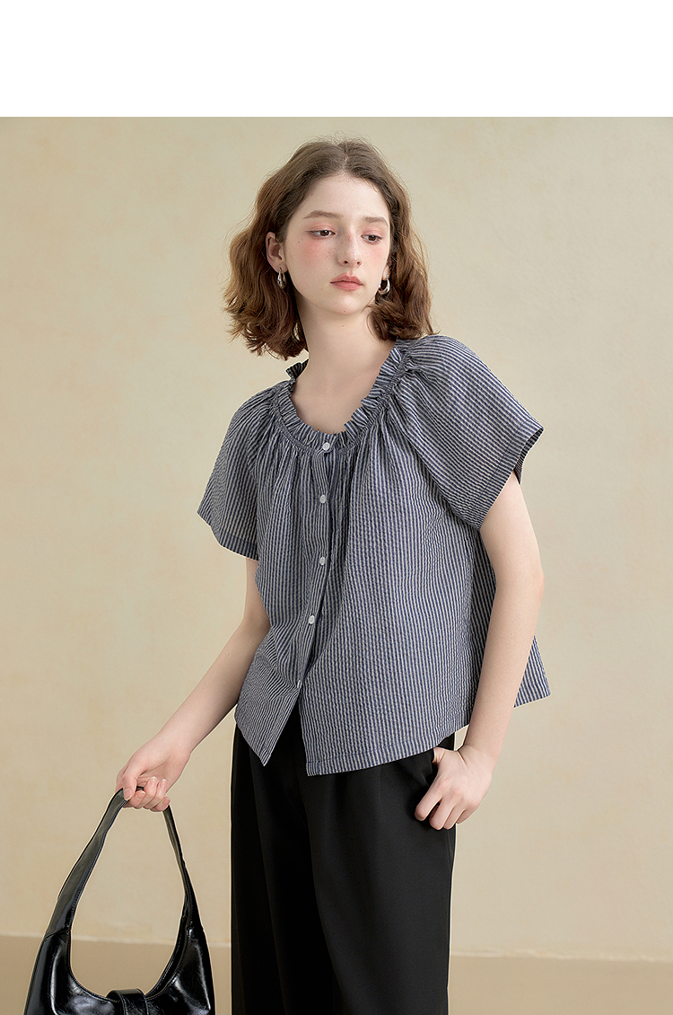 西遇韩系甜美条纹短袖衬衫女夏季褶皱圆领设计感百搭宽松衬衣H0051122
