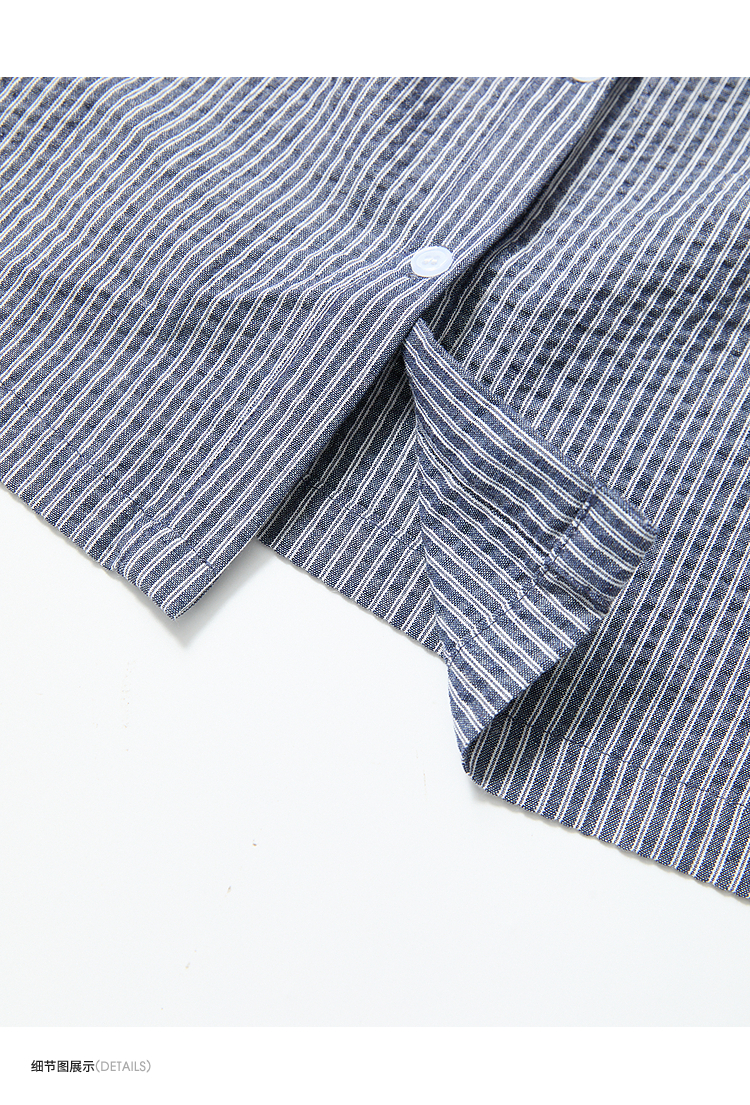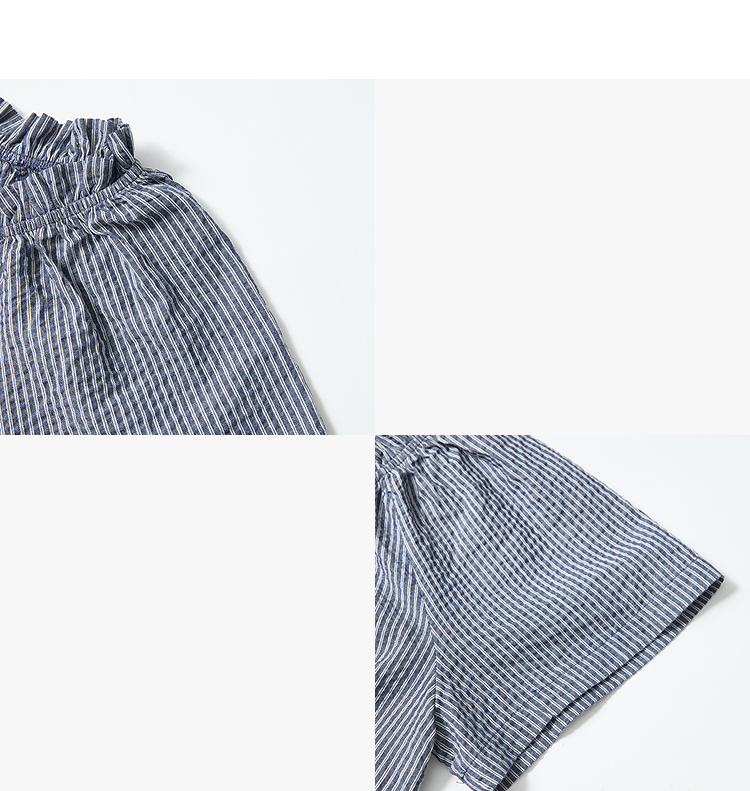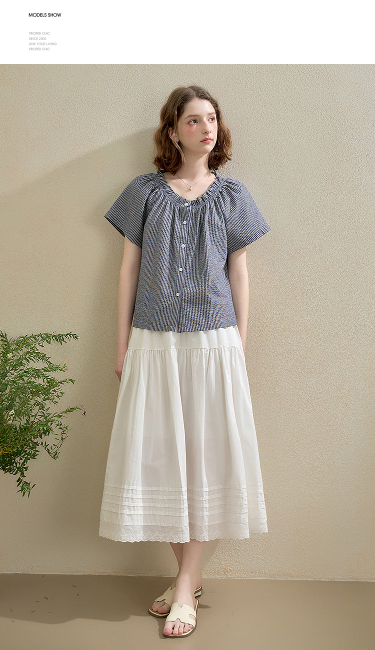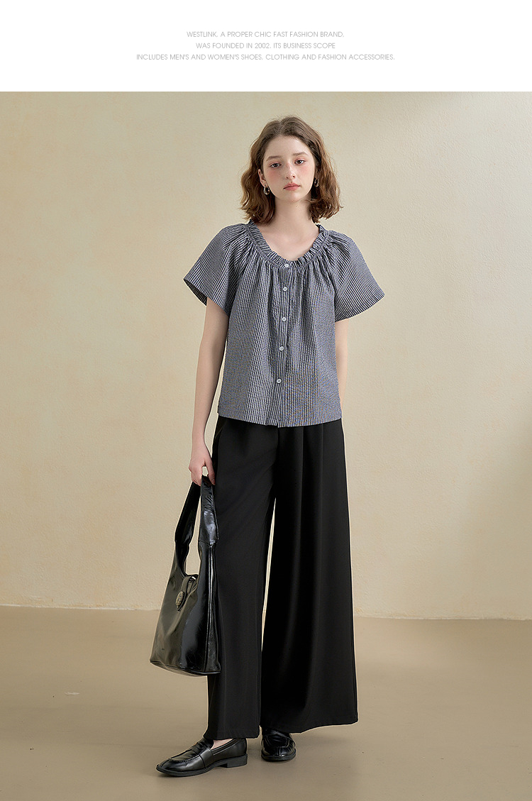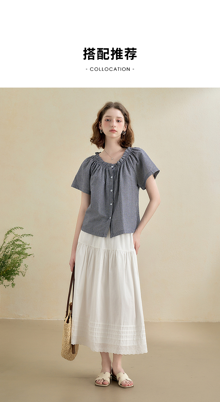 西遇韩系甜美条纹短袖衬衫女夏季褶皱圆领设计感百搭宽松衬衣H0051122