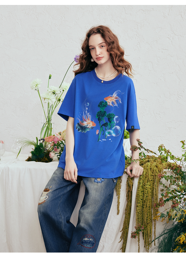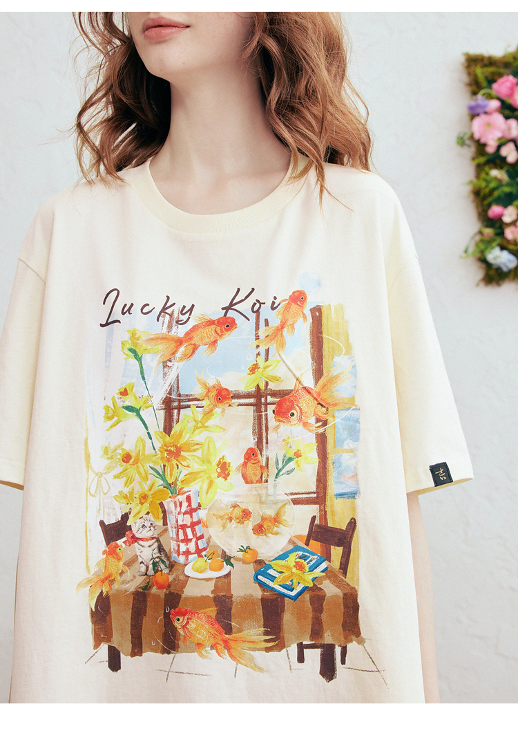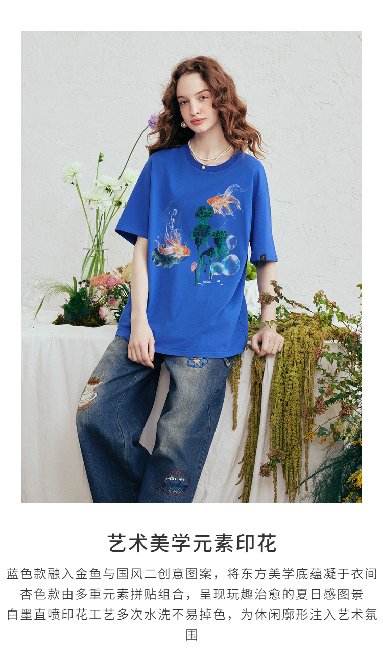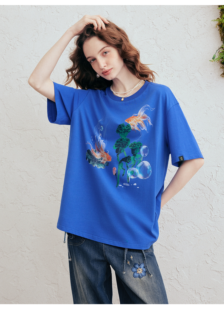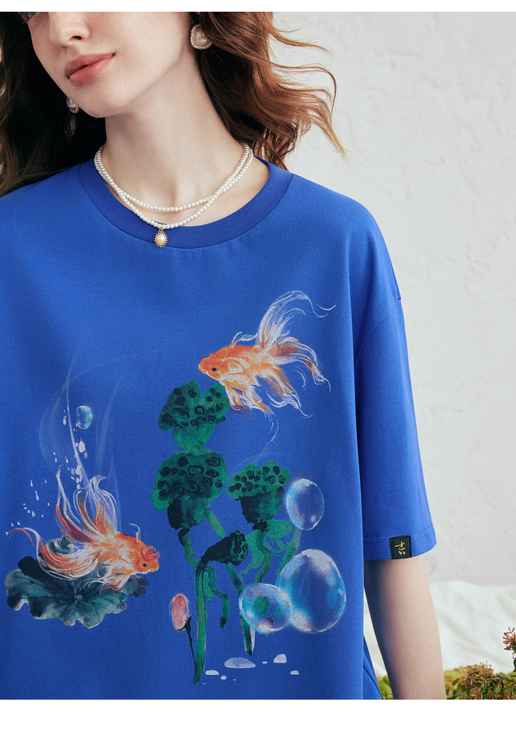 两三事 街头素描 2026春季新款国风金鱼印花纯棉t恤女宽松上衣