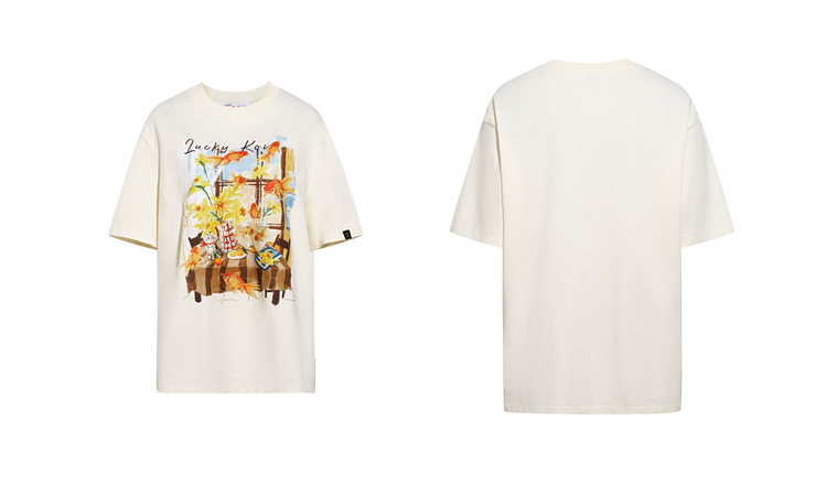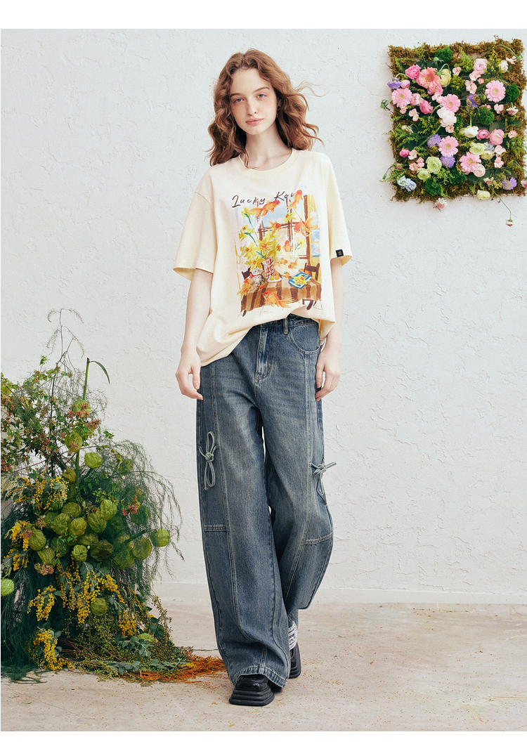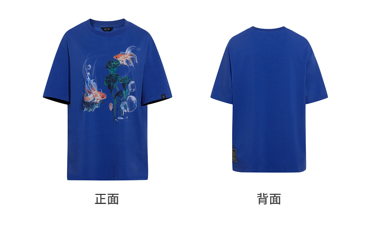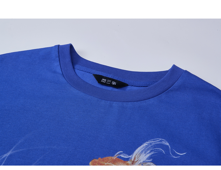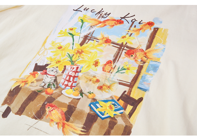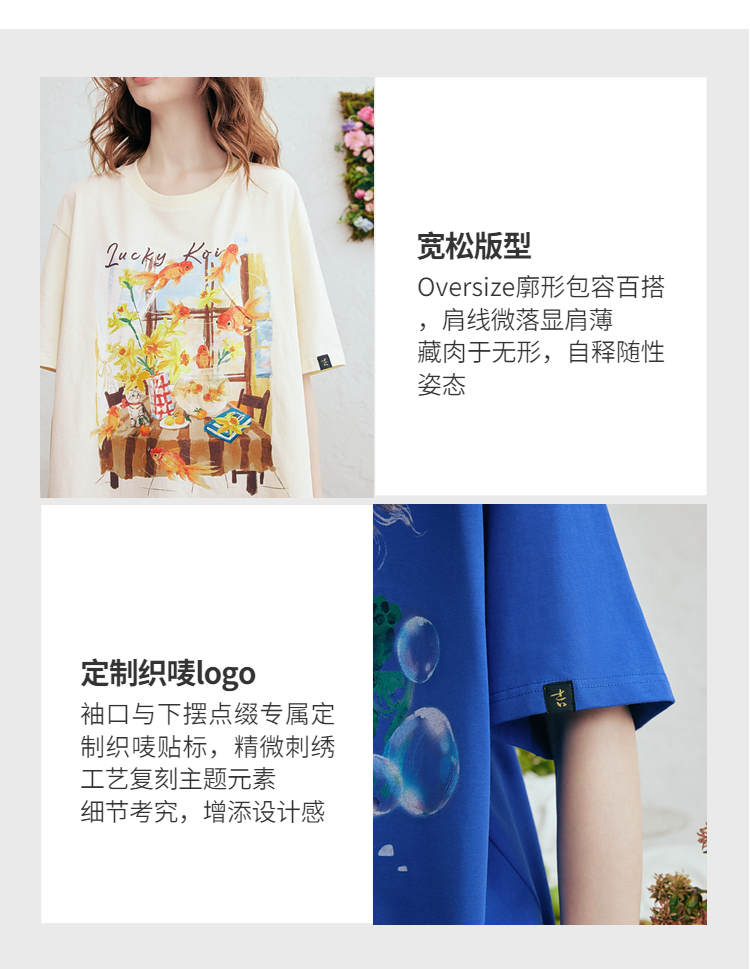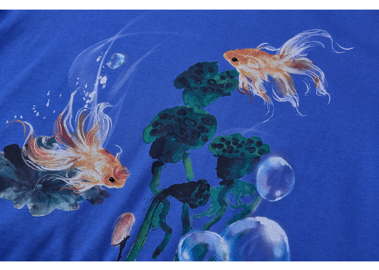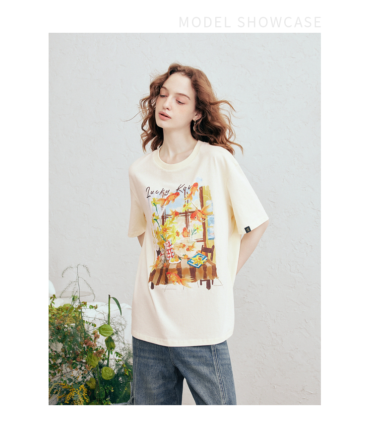 两三事 街头素描 2026春季新款国风金鱼印花纯棉t恤女宽松上衣