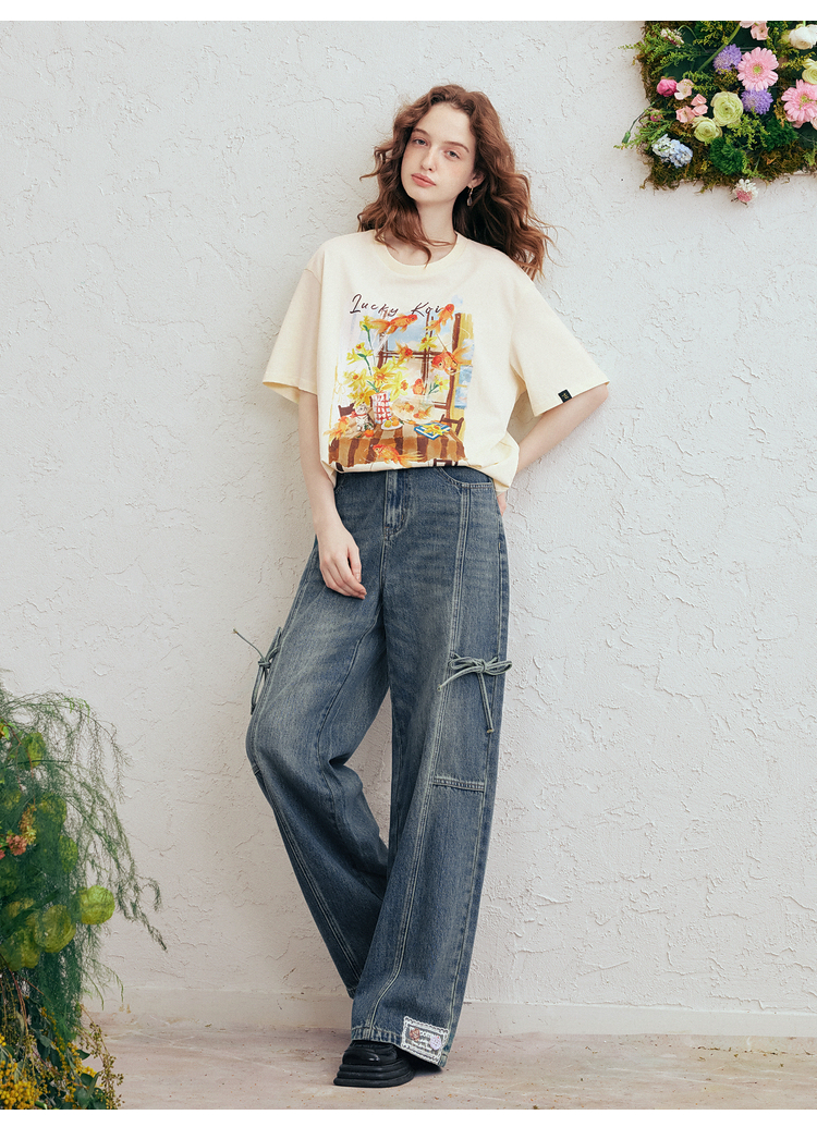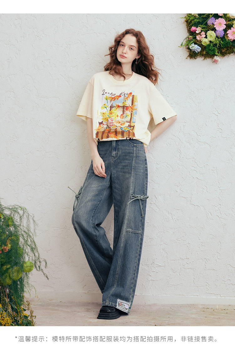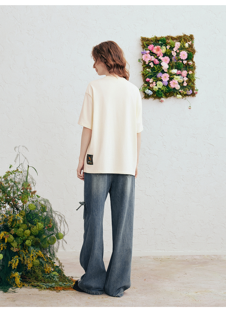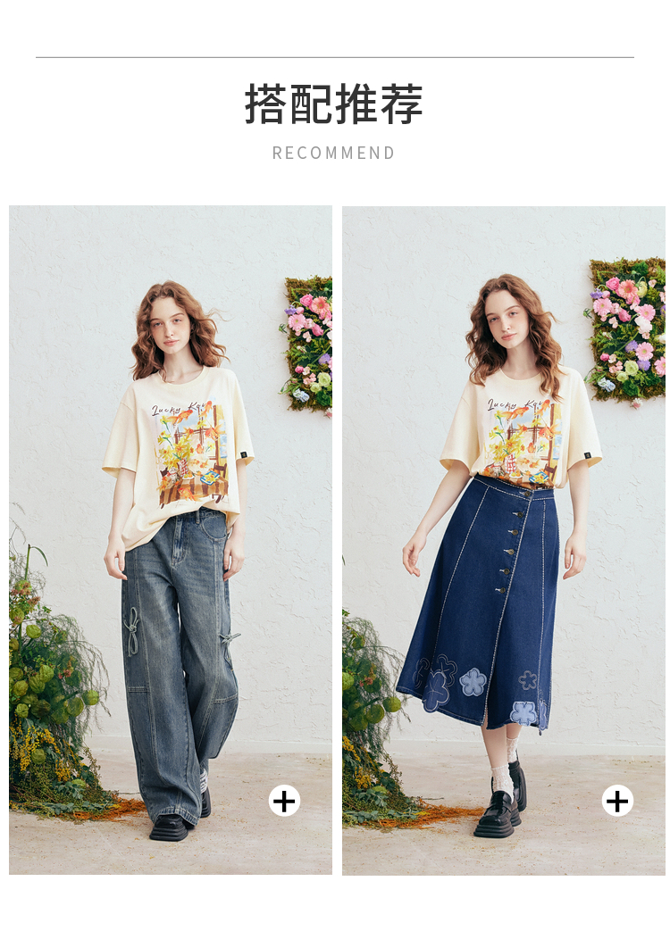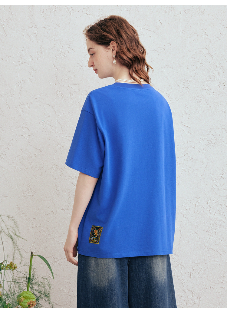 两三事 遁入花境 2025春季新款休闲拼色插肩袖印花刺绣t恤女宽松S25CT444