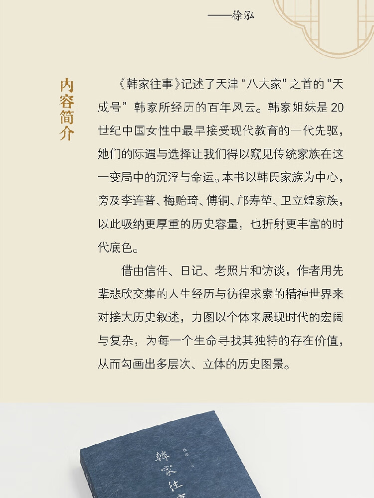 《韩家往事》记述了天津“八大家”之首的“天成号”韩家所经历的百年风云。韩家姐妹是20世纪中国女性中最早接受现代教育的一代先驱,她们的际遇与选择让我们得以窥见传统家族在这一变局中的沉浮与命运。本书以韩氏家族为中心,旁及李连普、梅贻琦、傅铜、邝寿堃、卫立煌家族,以此吸纳更厚重的历史容量,也折射更丰富的时代底色。