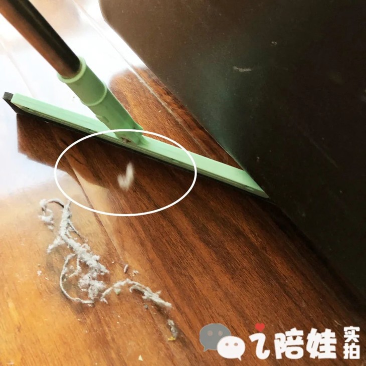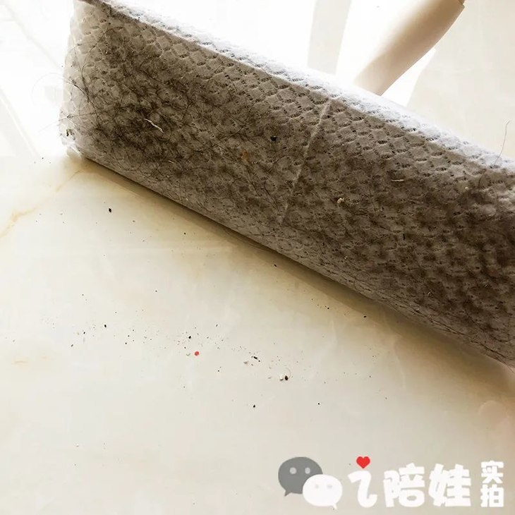 再给你们看看我养狗闺蜜家的成果,用它推一遍,地板能少8、9成的毛。而且毛几乎都吸在静电布上,没有掉下来。
