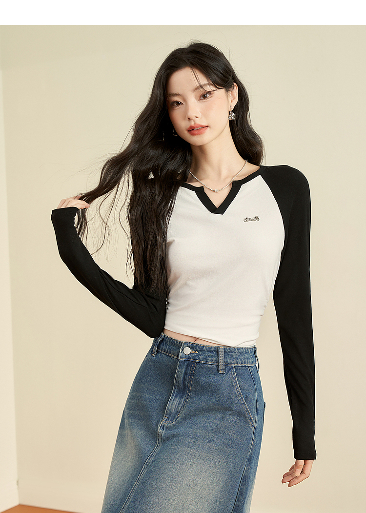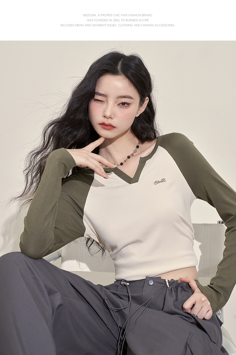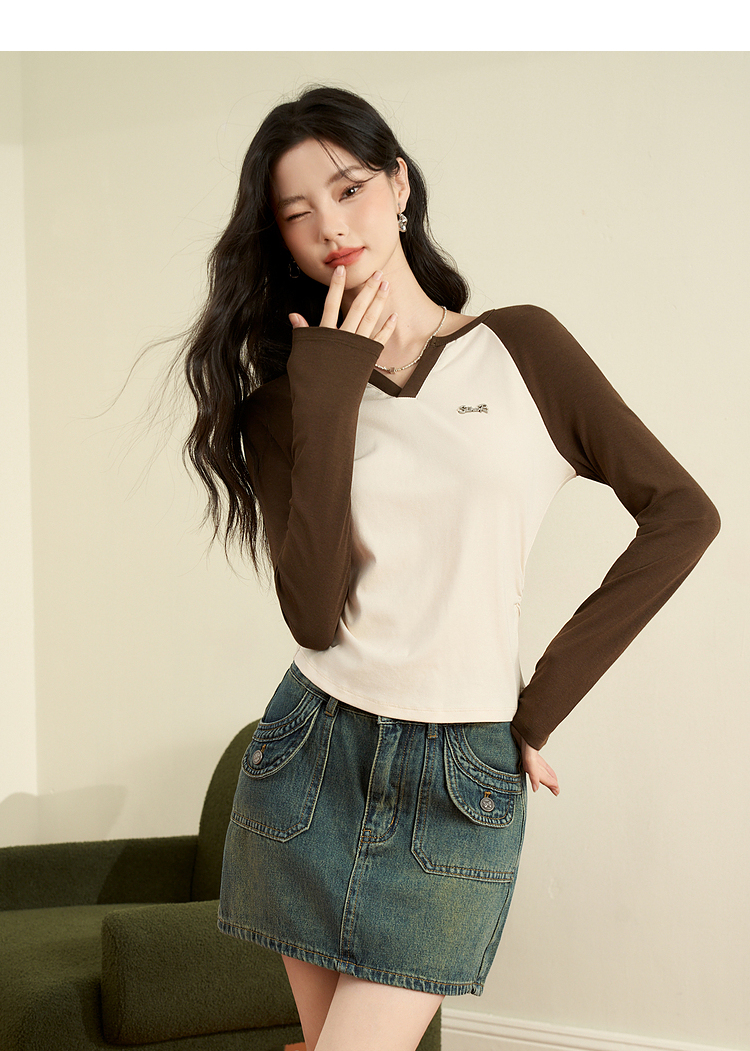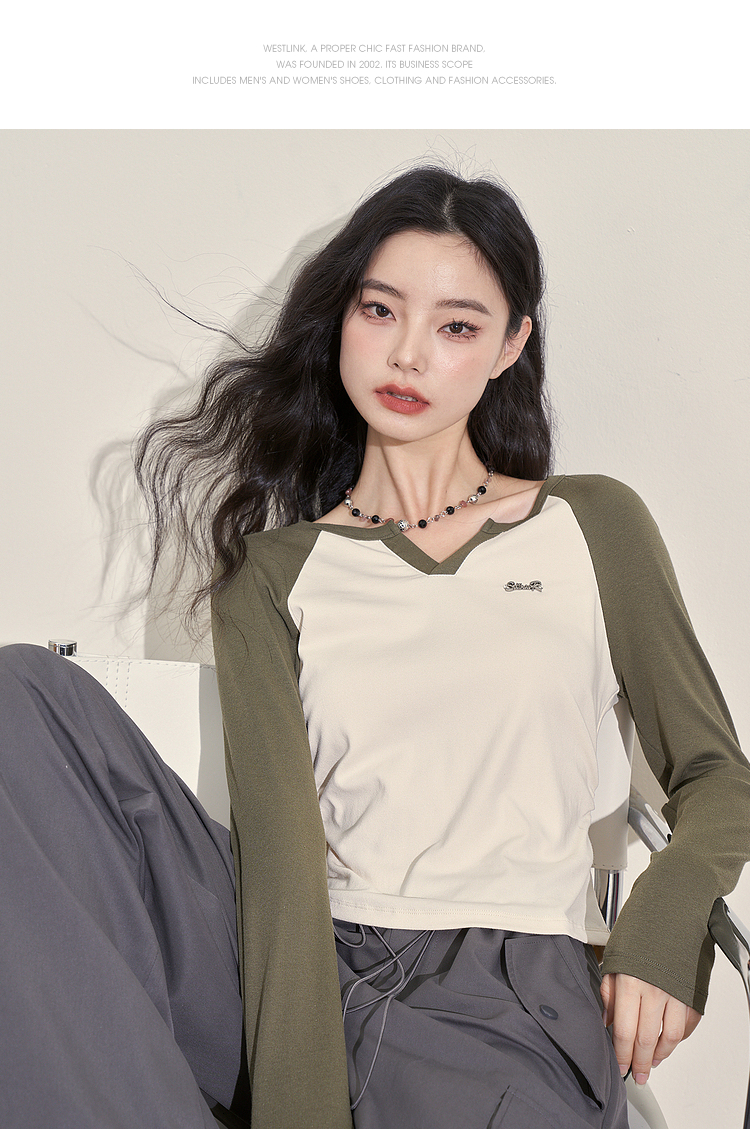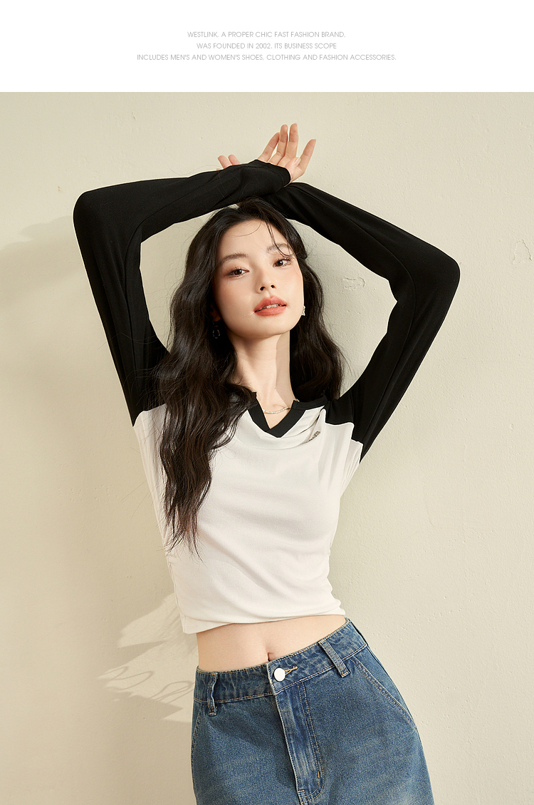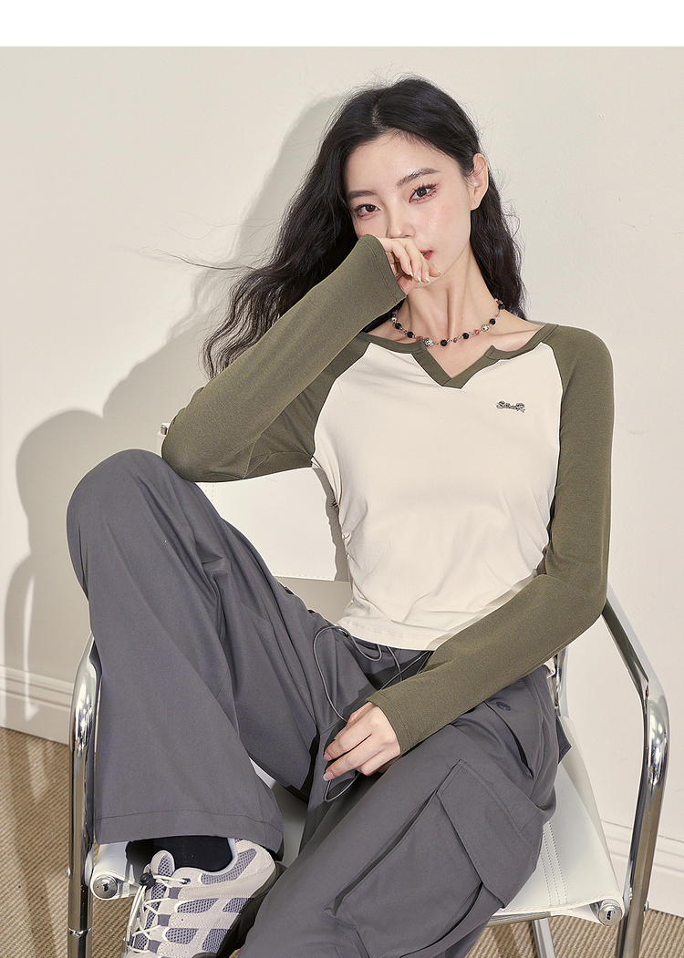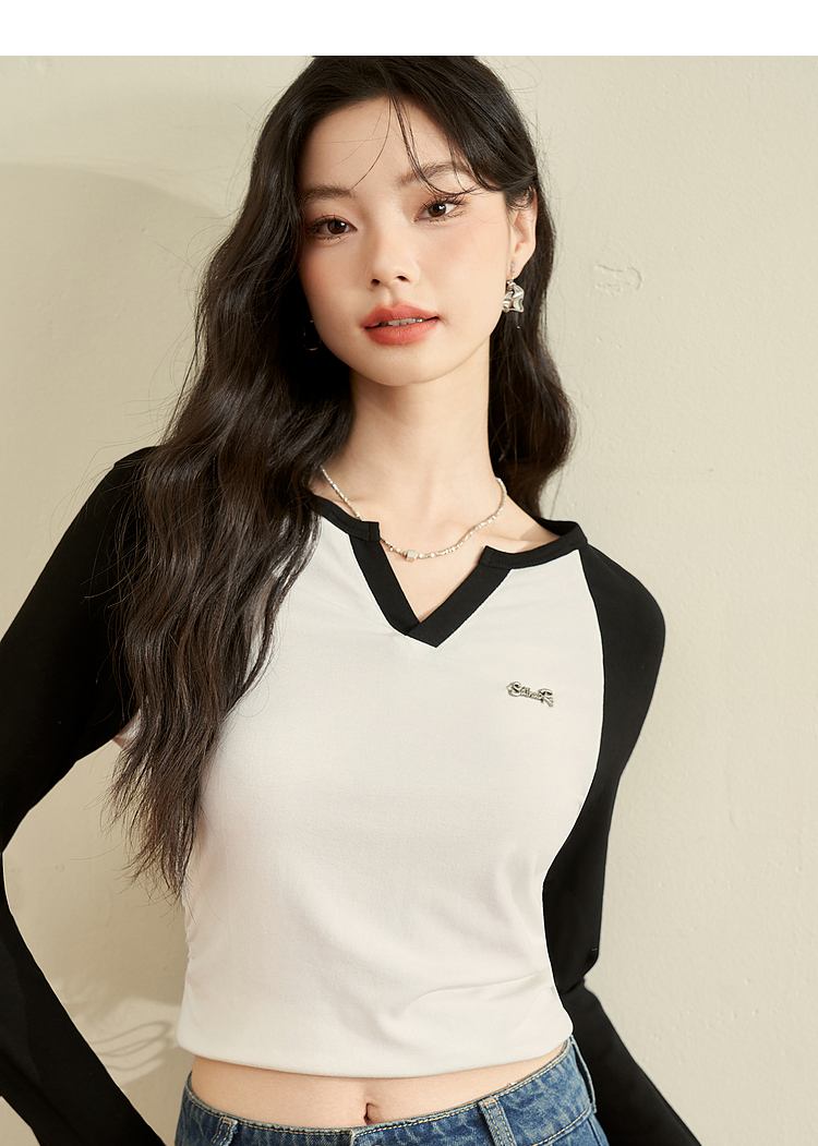 撞色休闲长袖T恤女新款拼色小V领设计感修身上衣女V0038443