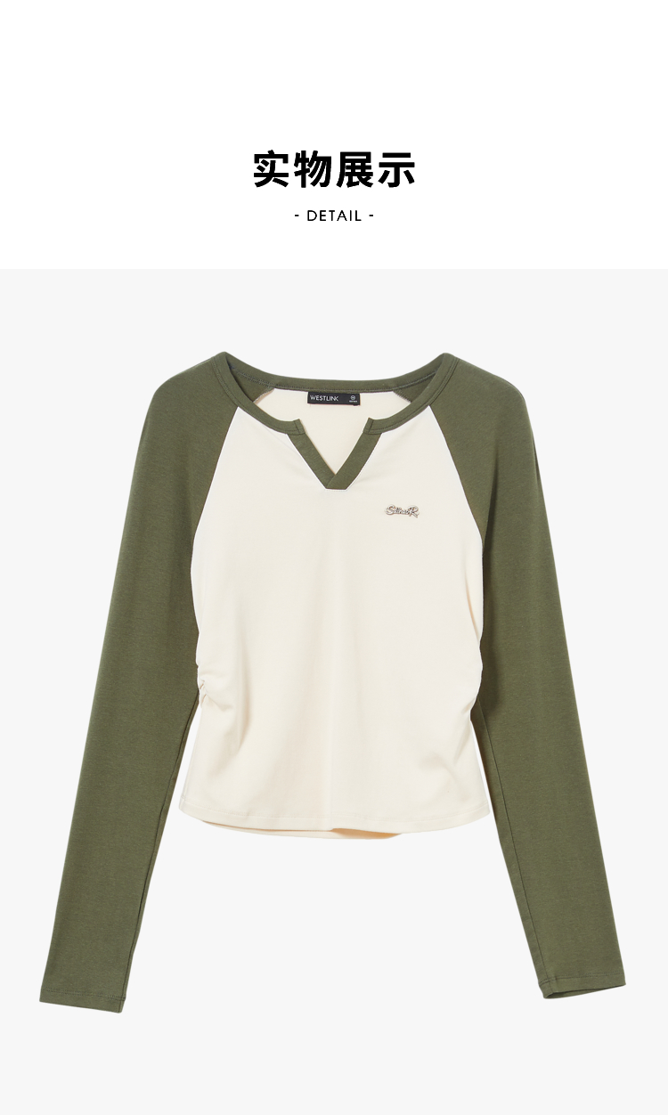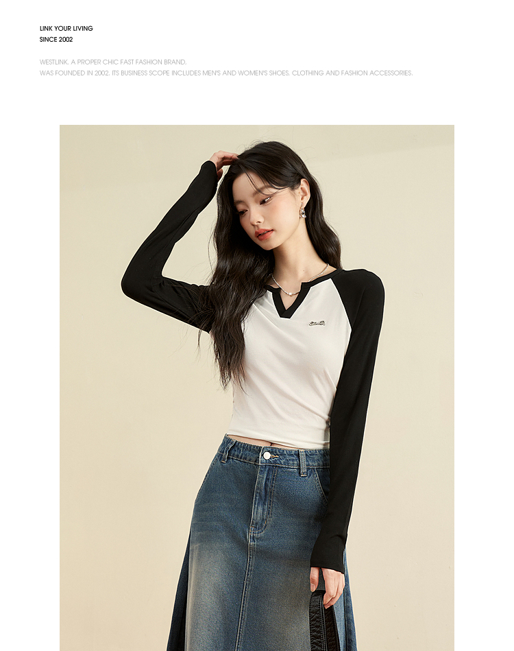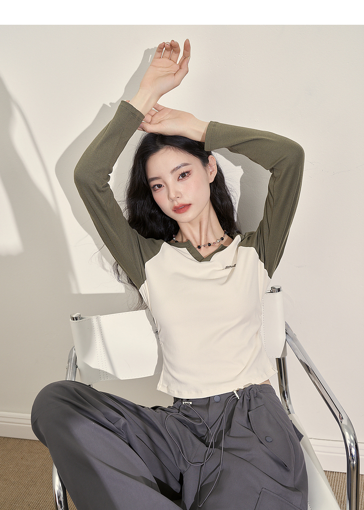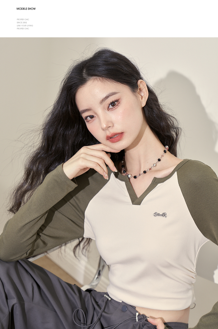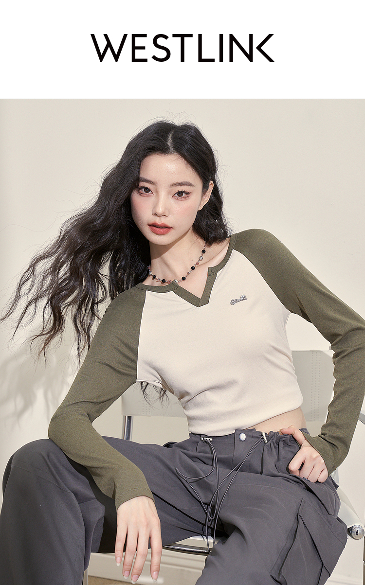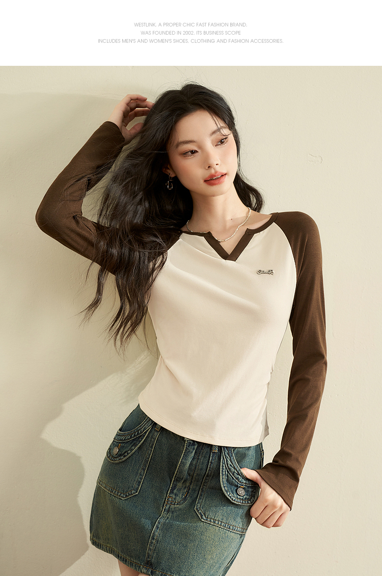 撞色休闲长袖T恤女新款拼色小V领设计感修身上衣女V0038443