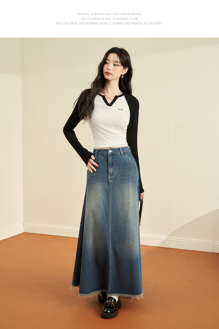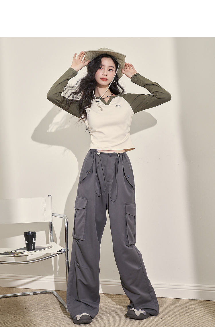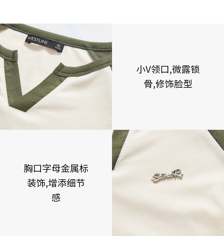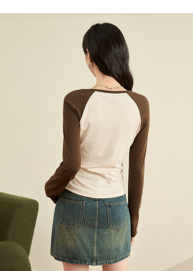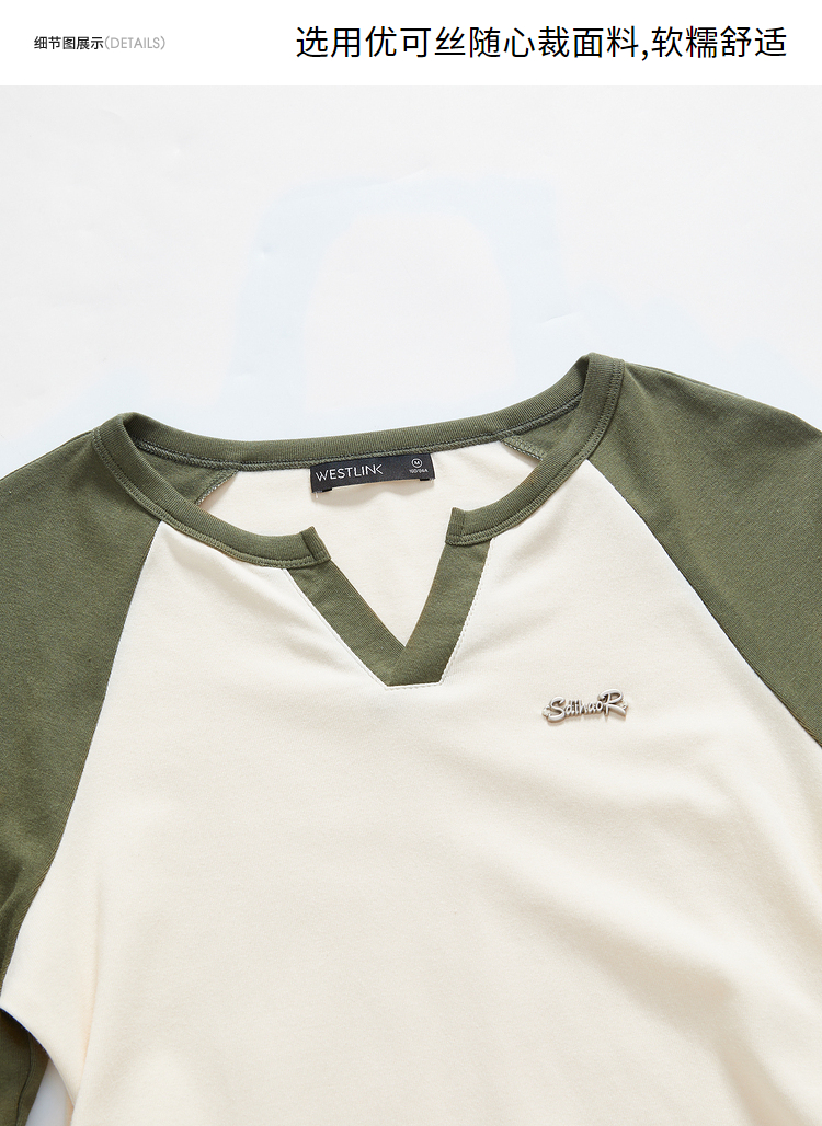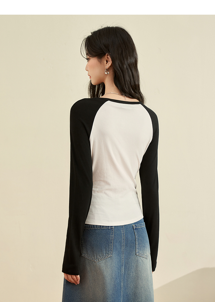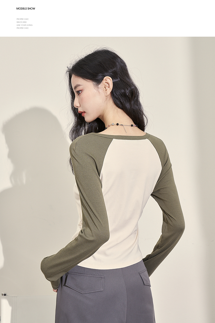撞色休闲长袖T恤女新款拼色小V领设计感修身上衣女V0038443