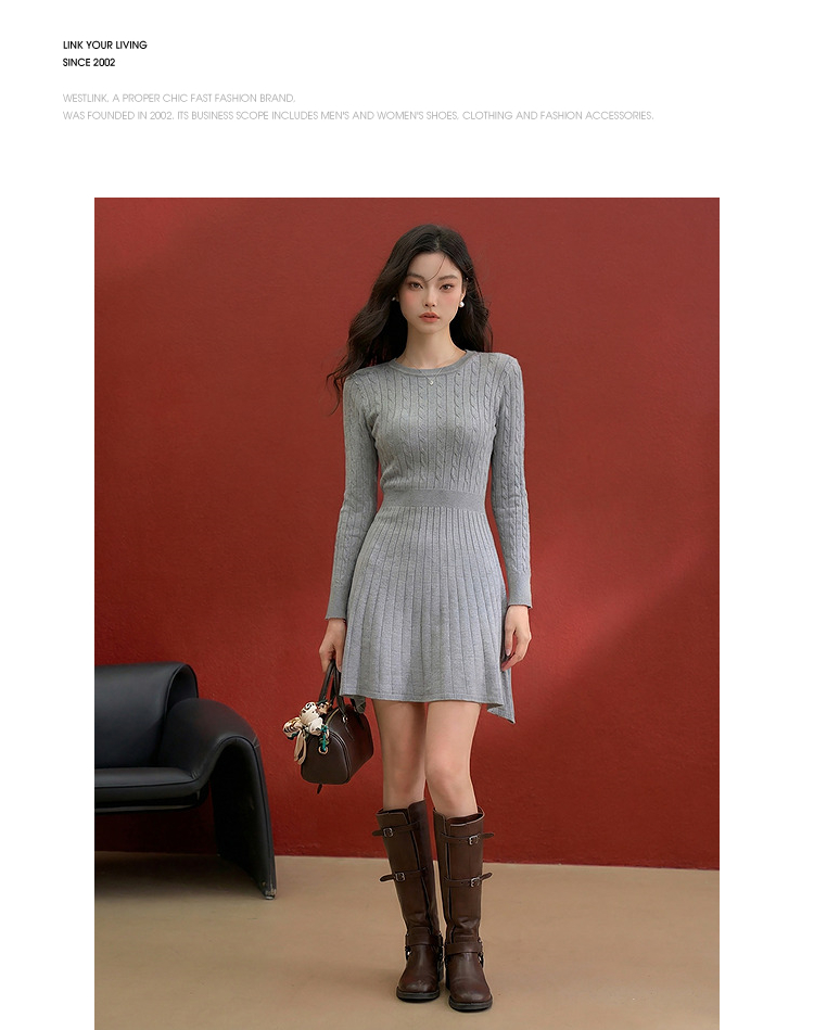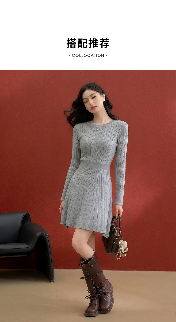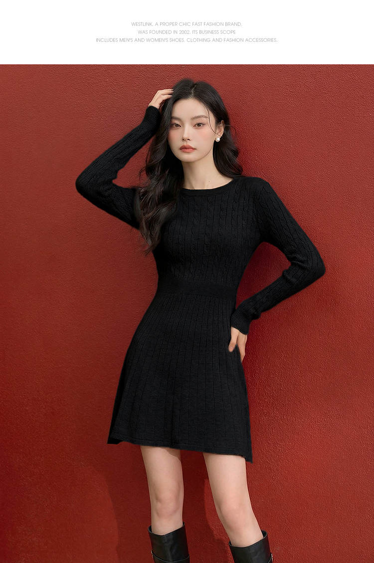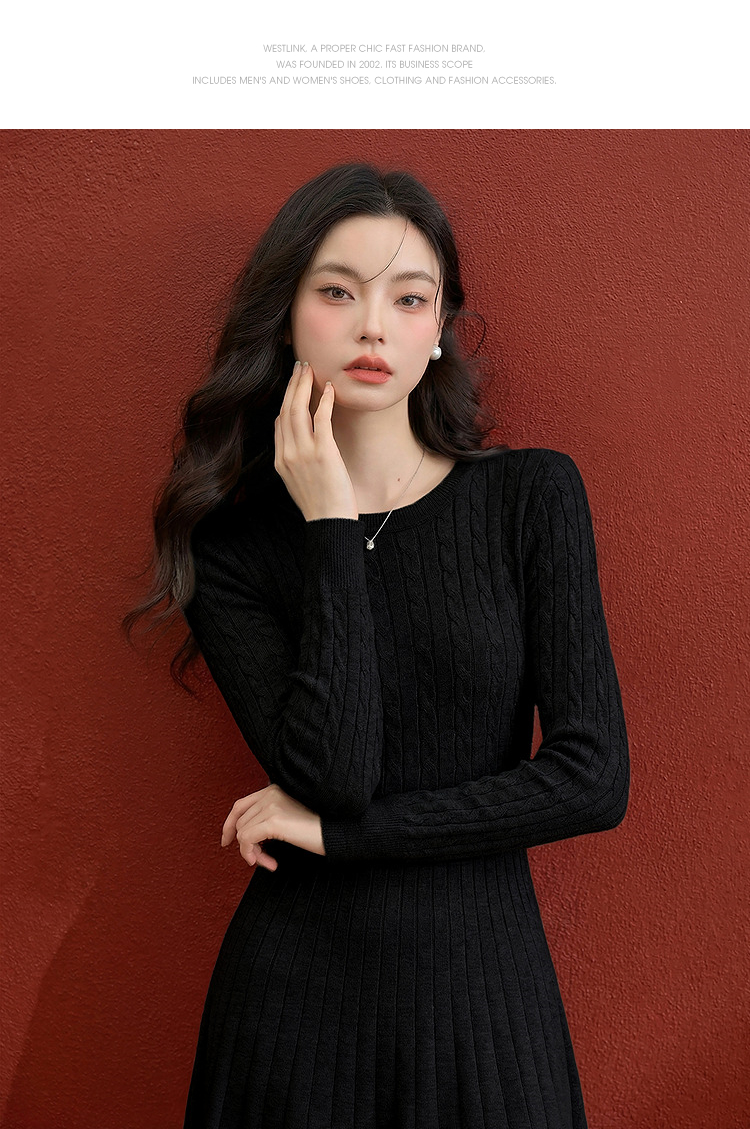 西遇长袖针织连衣裙女秋季新款复古圆领麻花收腰显瘦长裙V0055474/SS051576