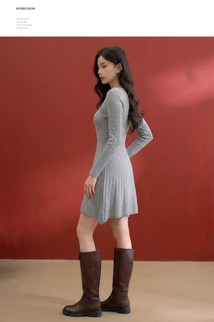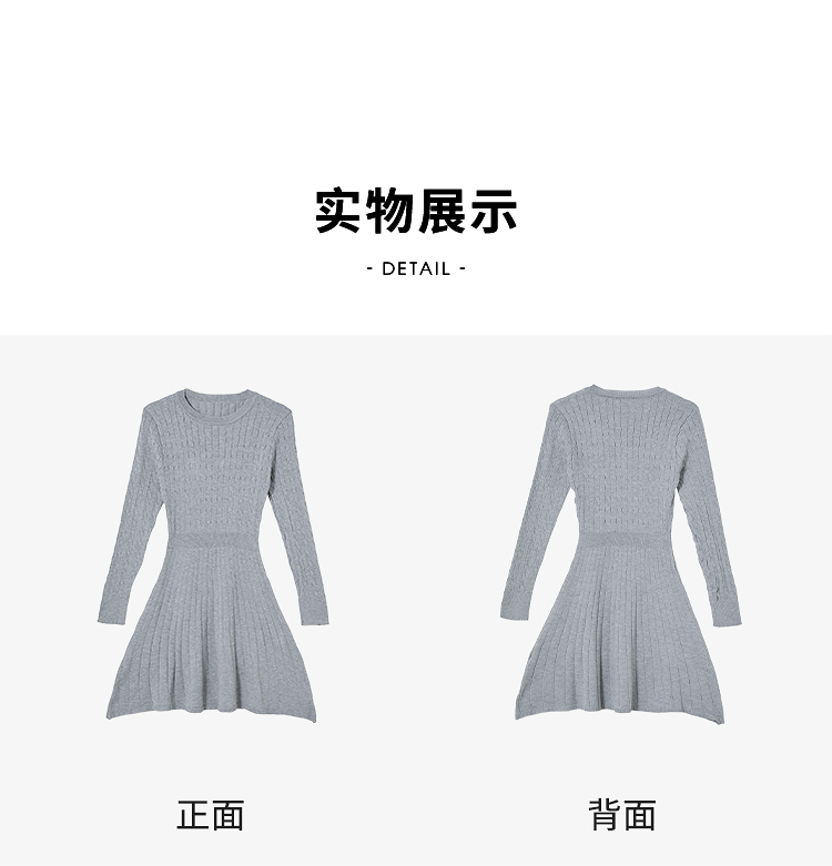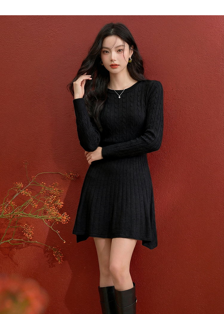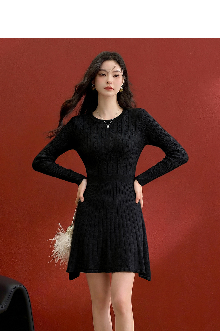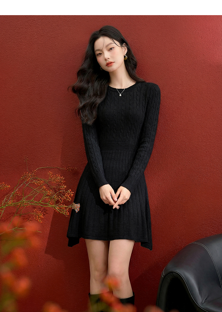 西遇长袖针织连衣裙女秋季新款复古圆领麻花收腰显瘦长裙V0055474/SS051576