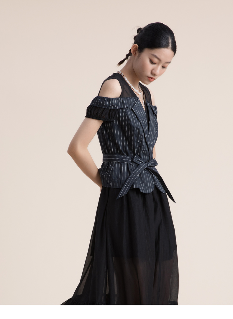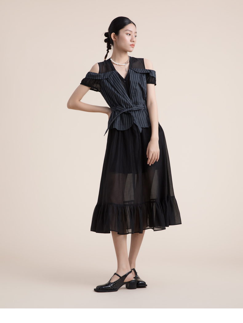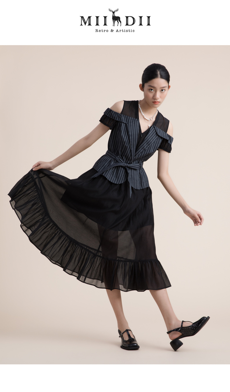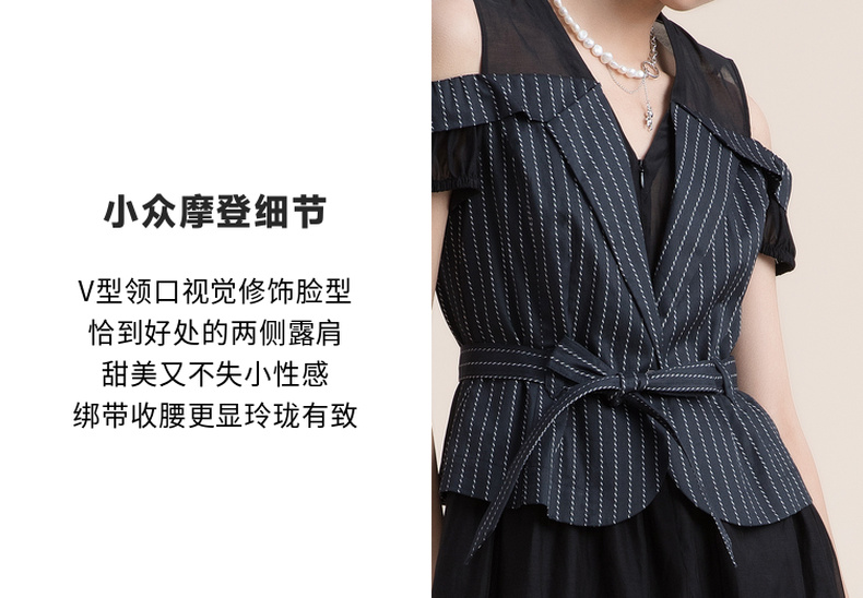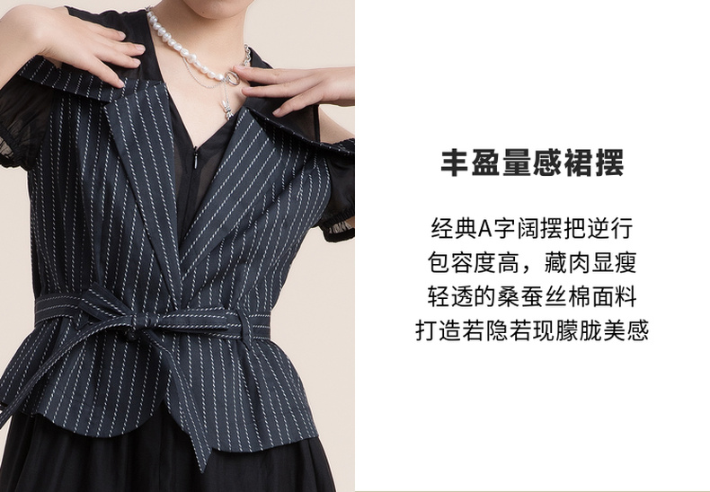 谜底假两件收腰连衣裙2022夏季新款V领小露肩真丝棉长裙222ML0667