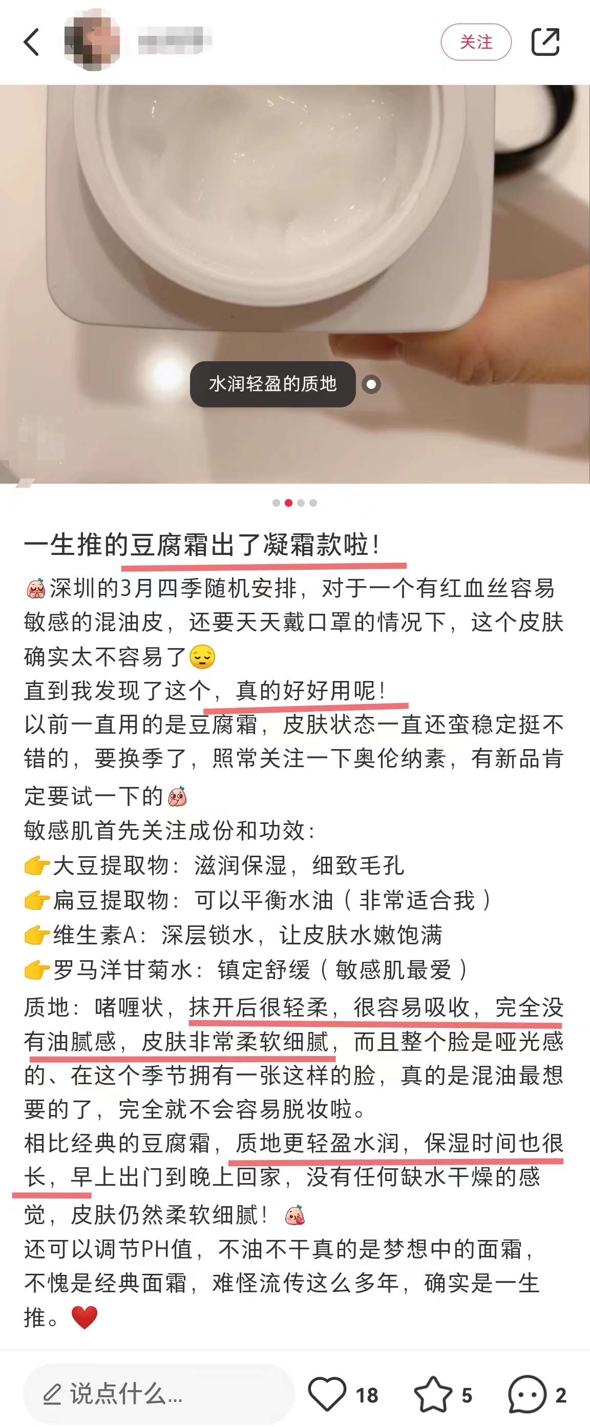 质地跟豆腐霜不一样,但这罐水凝霜同样拥有不俗的平衡水油、修护维稳能力!