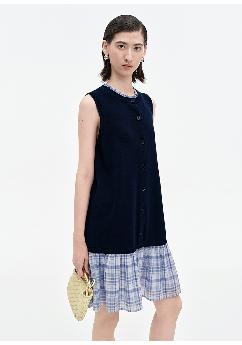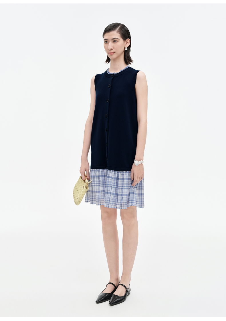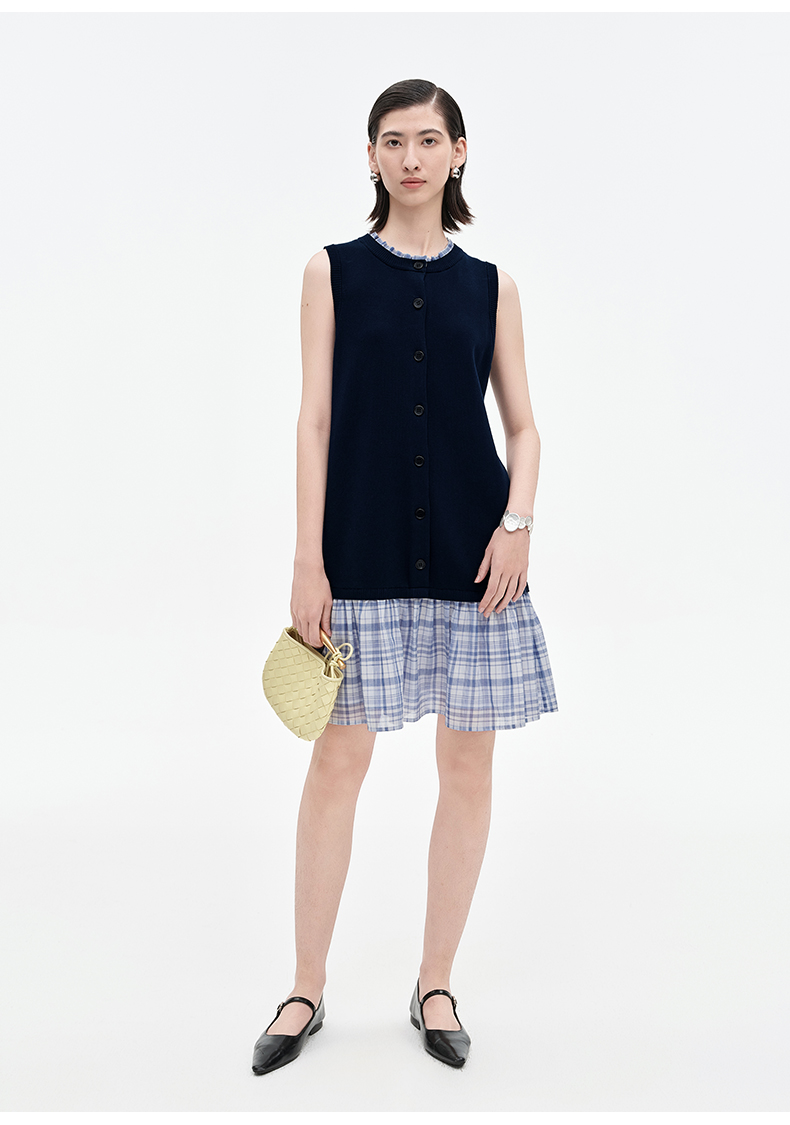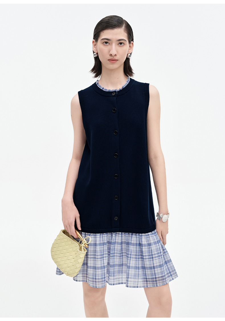 SELFWHO天丝桑蚕丝撞色格纹梭织拼接背心连衣裙女2025秋新款裙子
