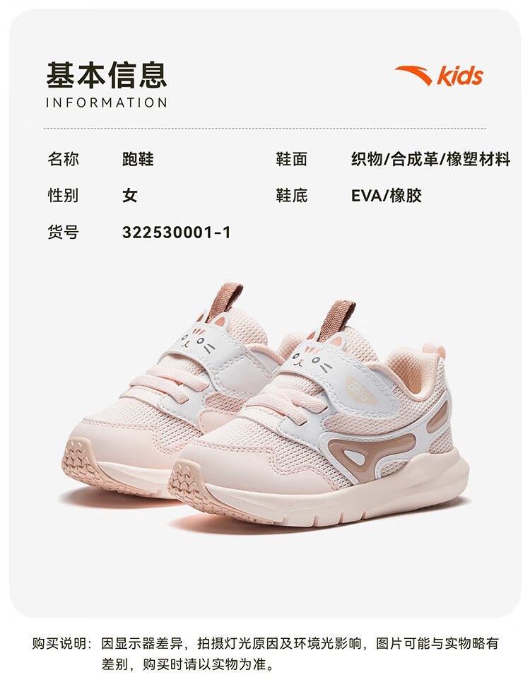 安踏儿童运动鞋女婴童跑鞋2025秋季小萌宠跑步鞋322530001