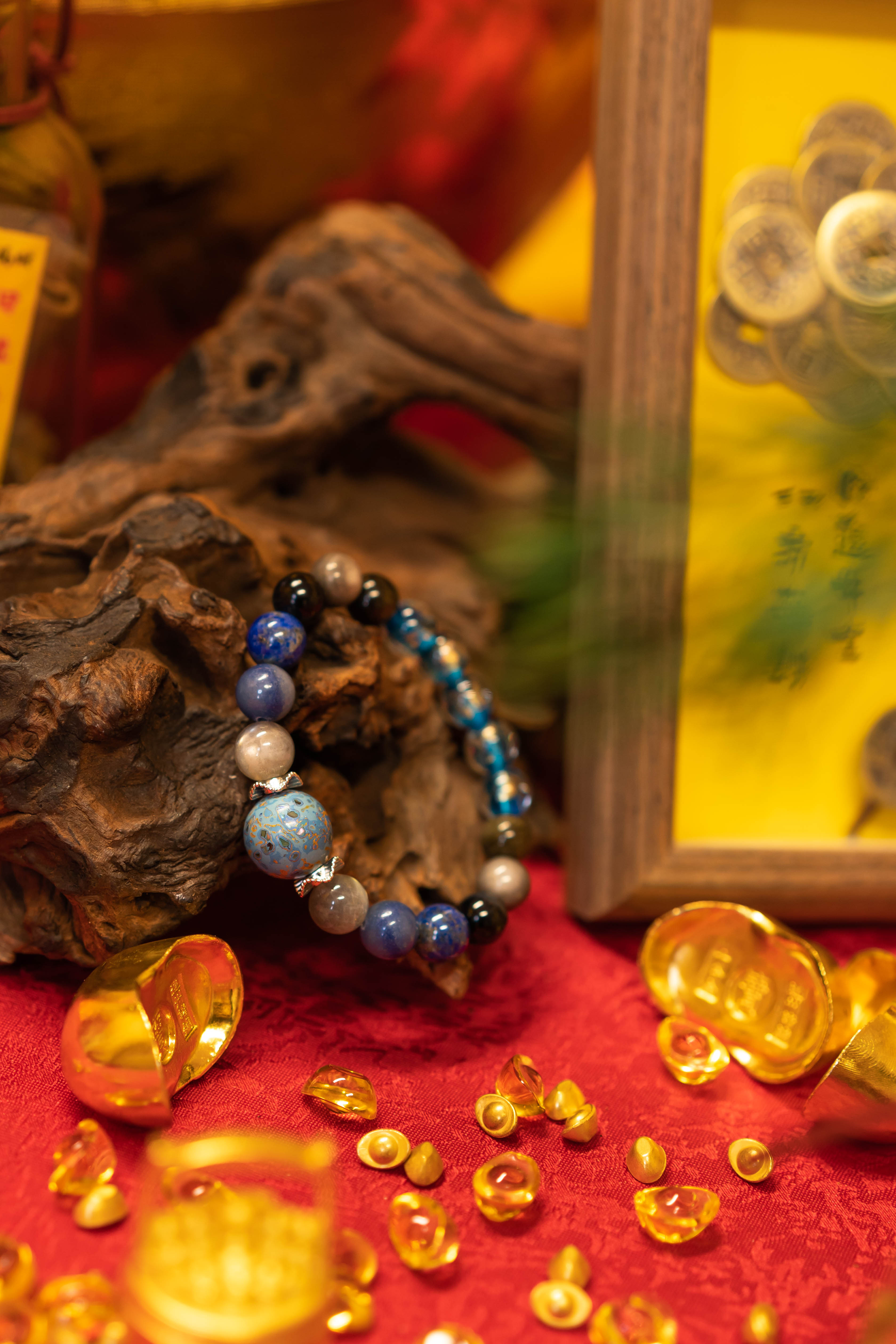 材质:大漆珠,蓝月光,蓝东陵,青金石,蓝虎眼,银曜石,金曜石,香灰琉璃