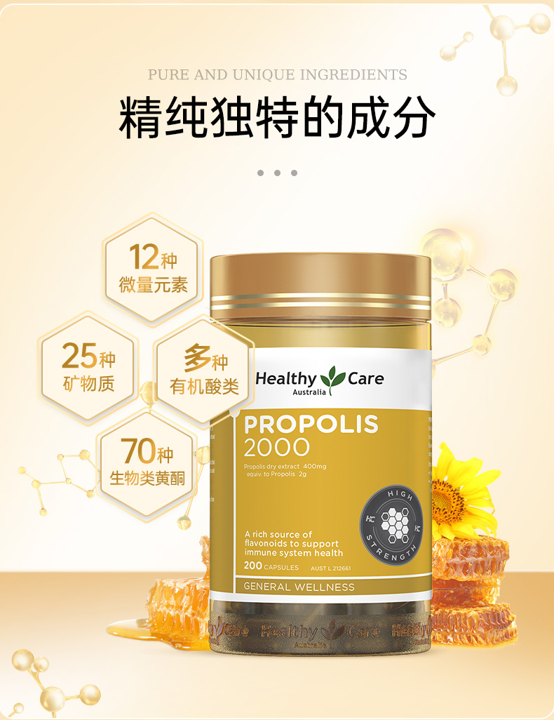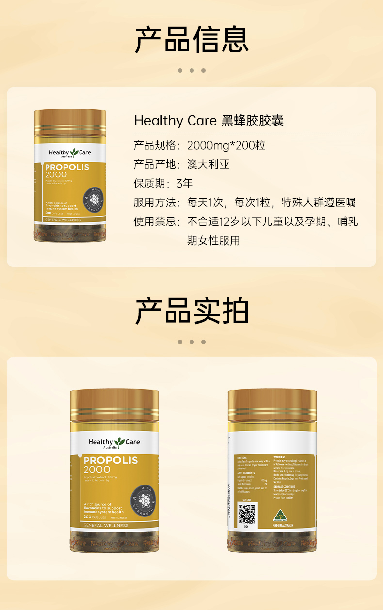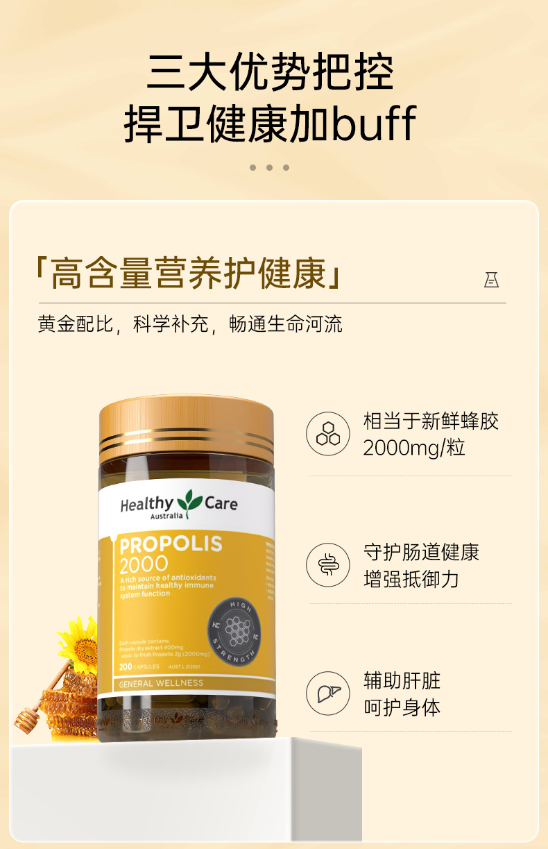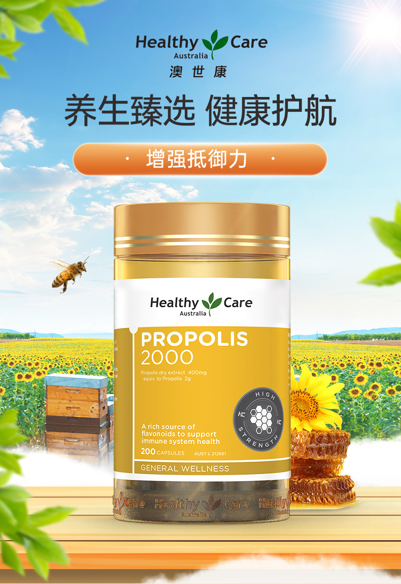 【保税仓】【提高抵御力】澳洲 Healthy Care 蜂胶软胶囊 2000毫克 200粒