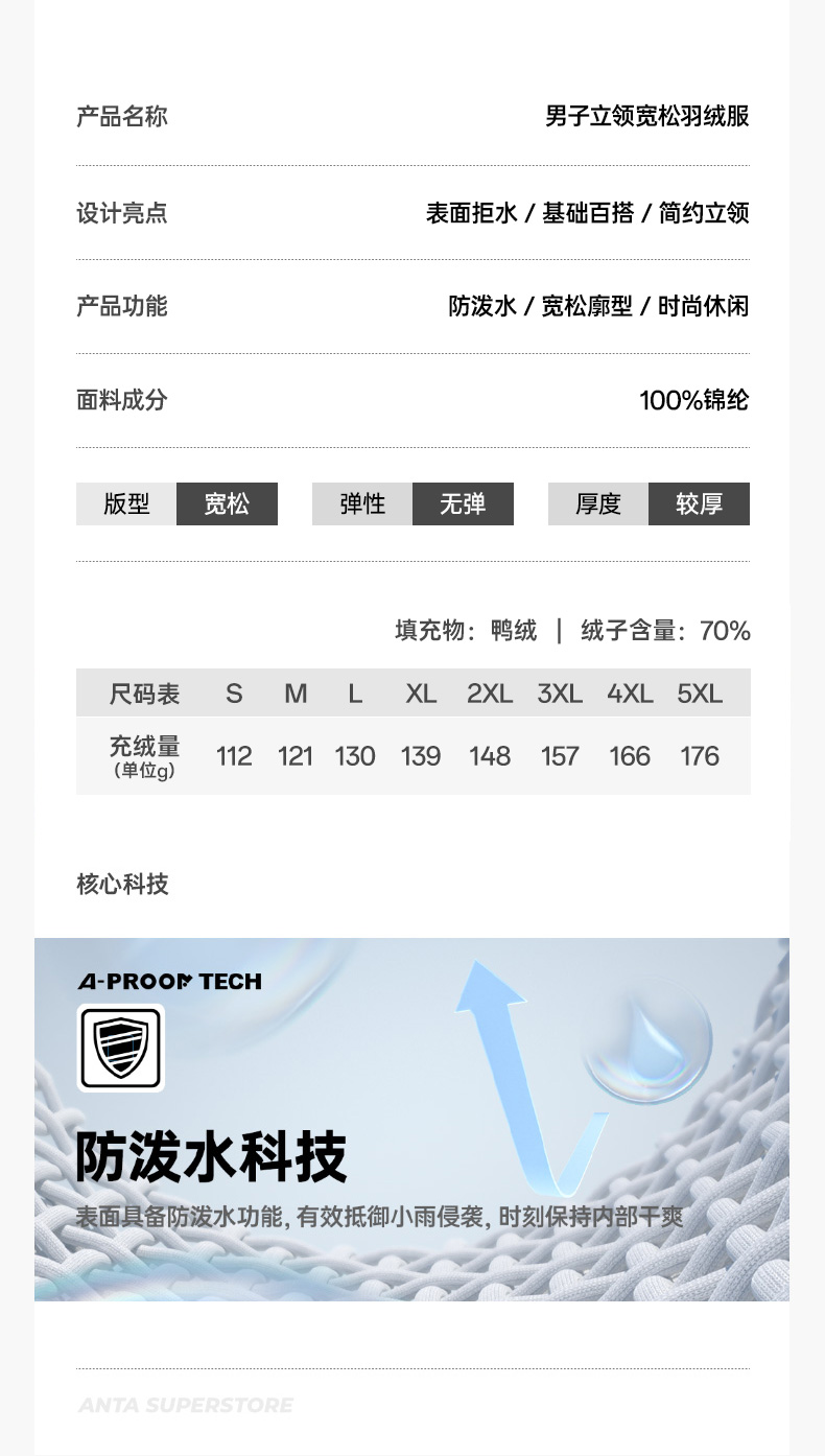 超级安踏运动羽绒服男士秋冬立领宽松防泼水保暖休闲夹克外套152548912U