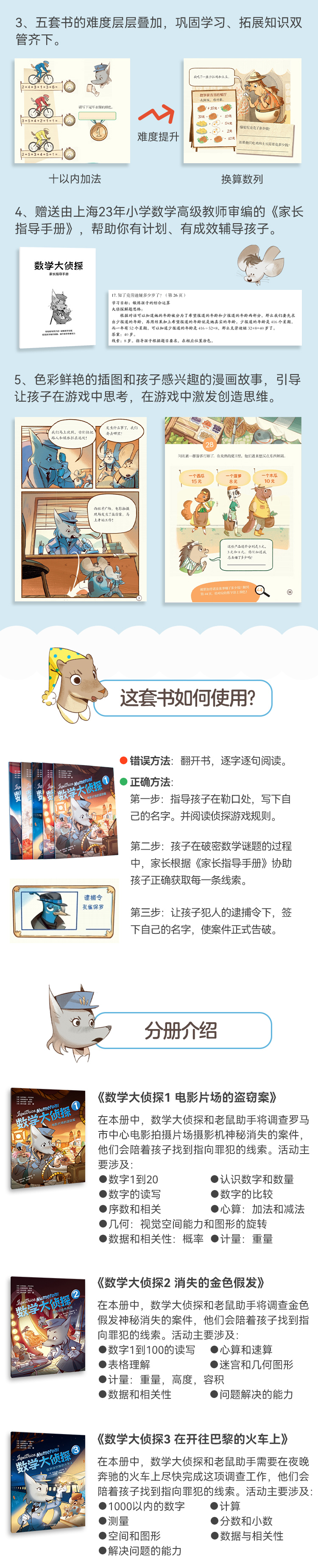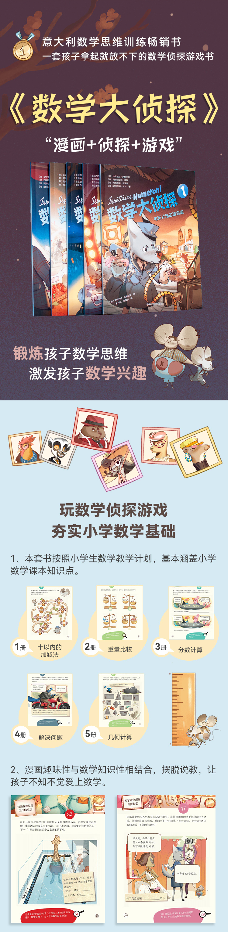《数学大侦探》是一套充满乐趣的数学学习系列漫画,旨在激发读者对有价值的过程的关注,这些过程能够激发读者对数学学习的兴趣和热情。有趣的探案故事能够刺激读者的发散性和创造性思维,从谜题和有趣的教学中汲取灵感。该系列漫画针对数学学习的特点而设计,难度逐渐增加,既有助于巩固学习,又能用有趣的方法复习所学知识、提高数学能力。