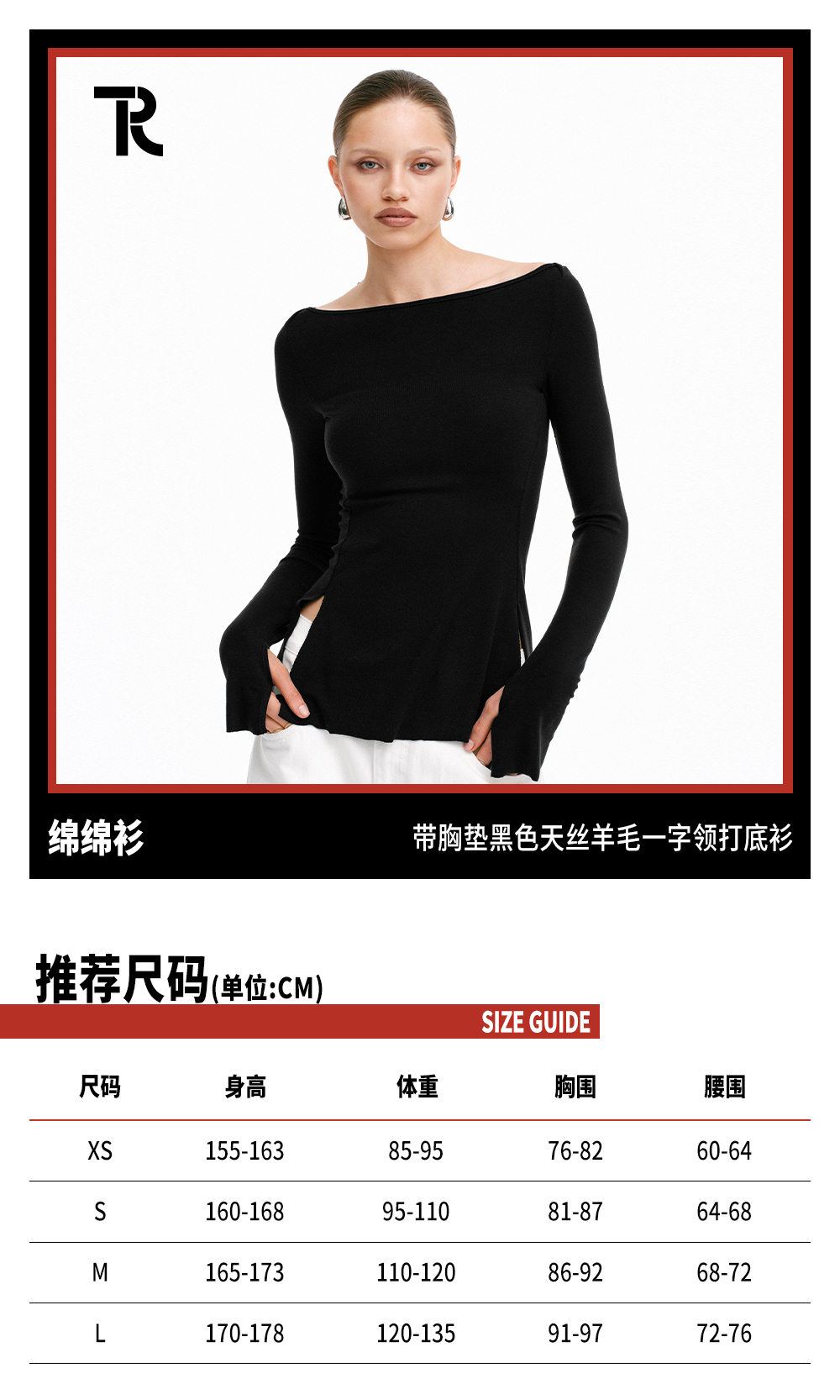 TR她热 绵绵衫 黑色天丝羊毛带胸垫百搭显瘦一字领打底衫上衣