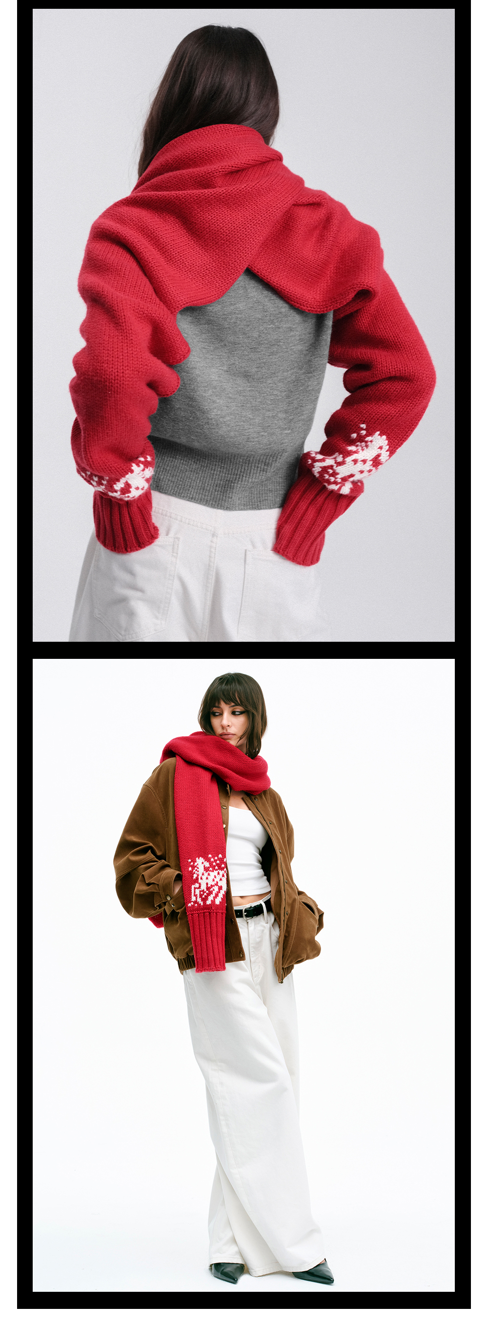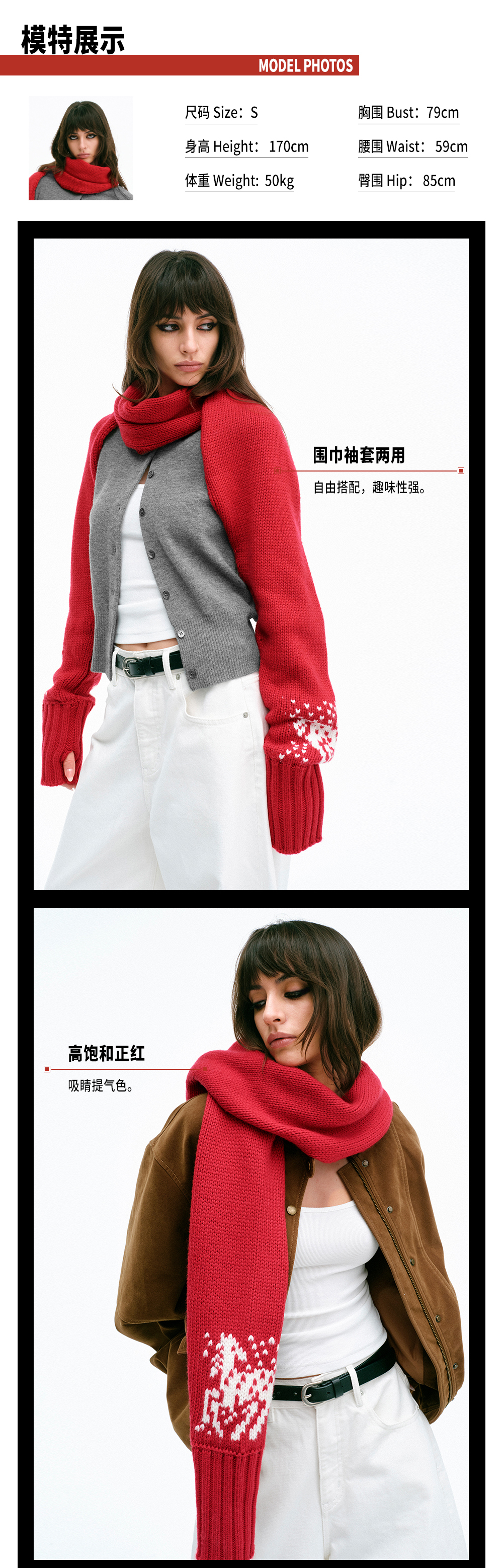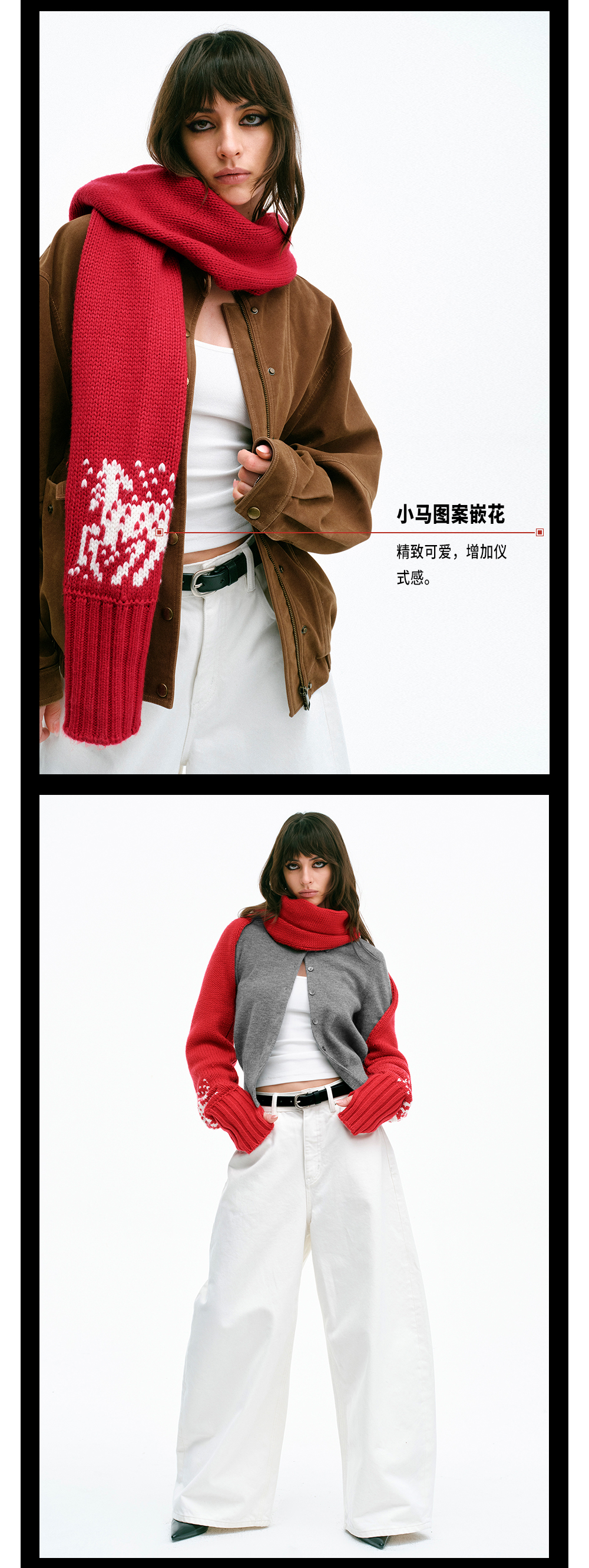TR她热小马奇遇 红色羊毛针织小马提花复古保暖围巾袖套围脖